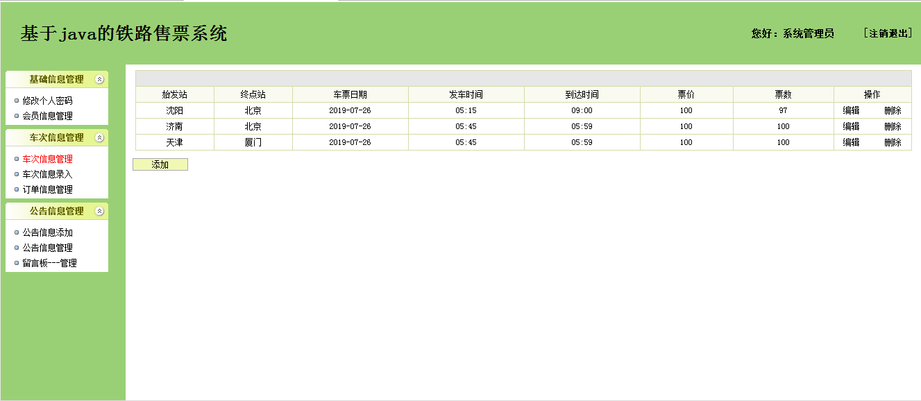 管理员:修改个人密码、会员信息管理、车次信息管理、车次信息录入、订单信息管理、公告信息添加、公告信息管理、留言板管理。