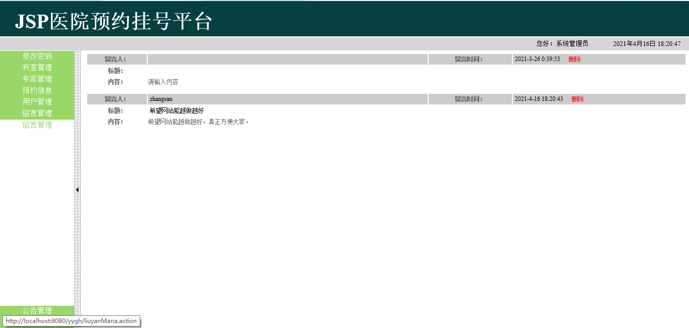 管理员:修改密码;科室管理;专家管理;预约信息;用户管理;留言管理;公告管理;退出系统;