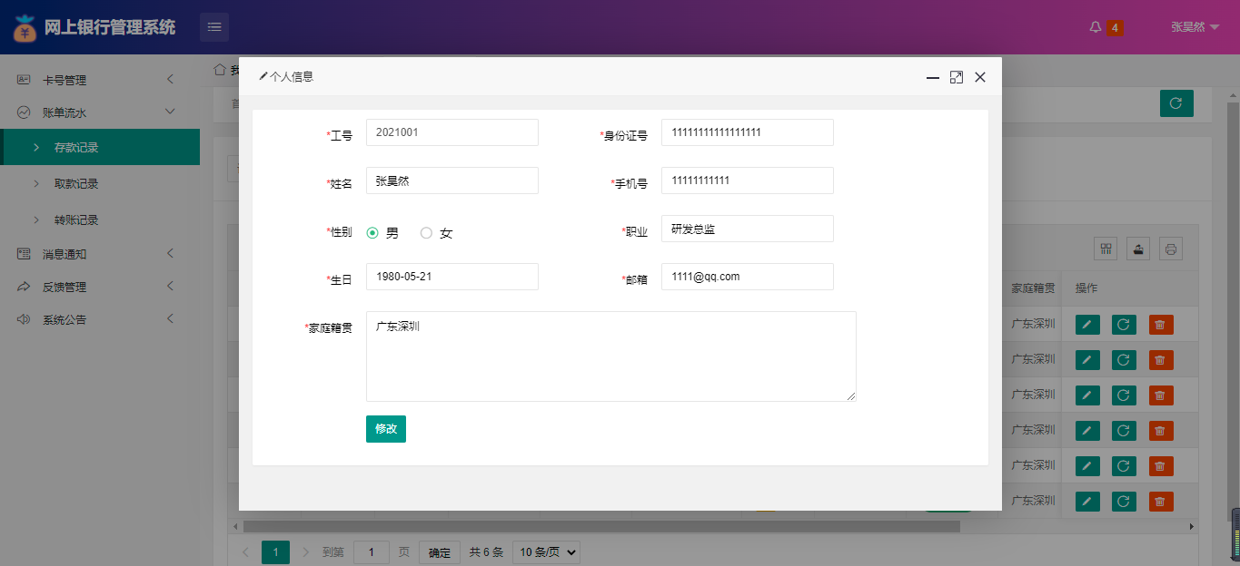 客户(用户):卡号管理;账单流水;消息通知;反馈管理;系统公告;顶部还可以收到消息通知(动账提醒);修改个人信息;修改密码;银行卡盈余统计曲线图;
