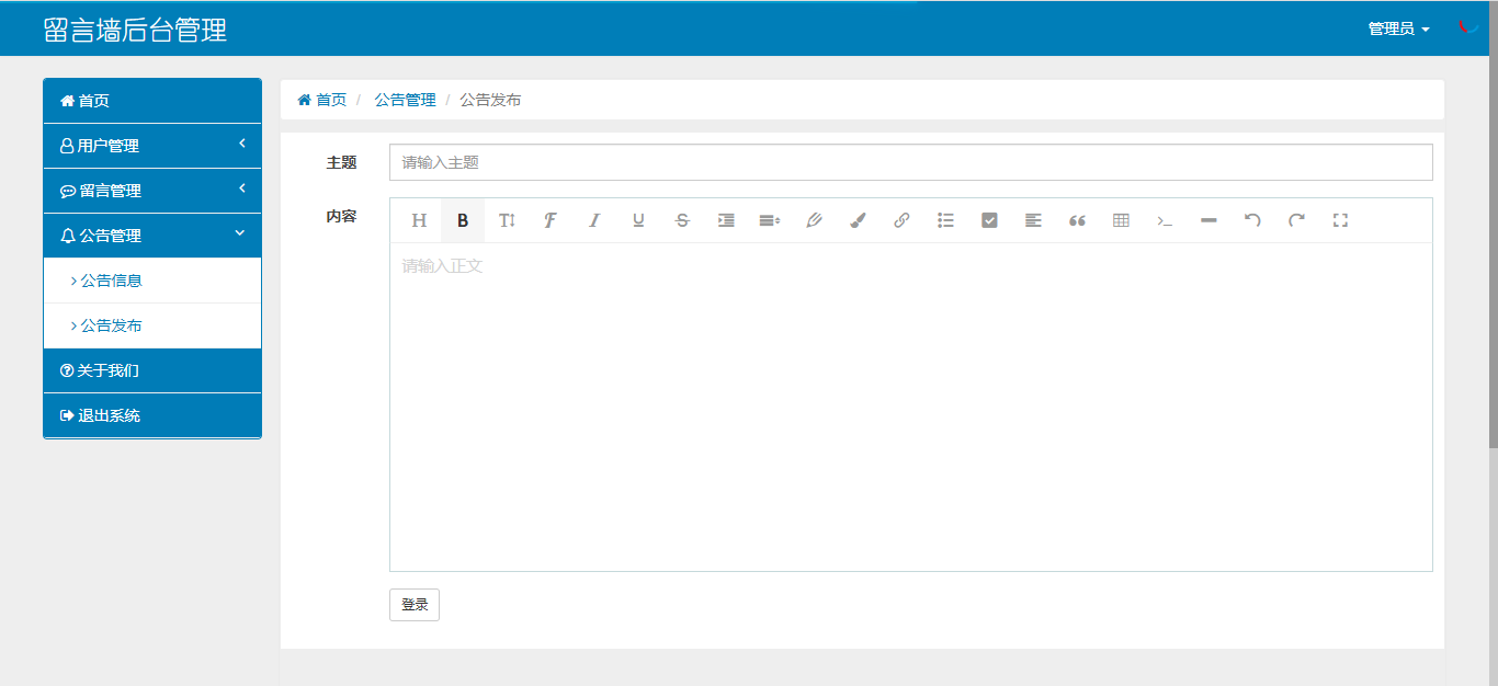 使用java+springboot+mysql开发的留言墙管理系统网站,系统包含管理员、用户角色,功能如下: