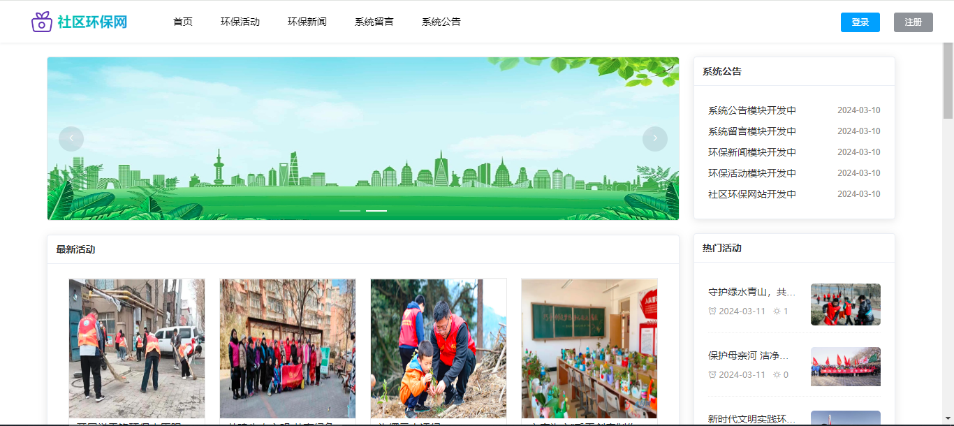 项目介绍:基于SpringBoot+Vue前后端分离的社区环保网,本人原创开发。主要功能:基于SpringBoot+Vue前后端分离的社区环保网,系统包含管理员、用户角色,功能如下:管理员:用户管理;活动管理;活动报名(审核);新闻管理;新闻评论;留言反馈;公告信息;个人信息;密码修改;用户:注册、登录系统;首页;环保活动列表(查看详情,可以申请报名活动);环保新闻(评论);系统留言;系统公告;用户个人中心可以管理我的报名、我的评论、我的留言;个人资料;修改密码。系统界面美观大方,功能丰富,使用了SpringBoot、Vue、ElementUI、Echarts等技术栈,适合作为毕业设计、课程设计,有需要可提供指导。开发技术:服务器端:SpringBoot2、Mybatis、Mysql前端:Vue2、ElementUI、Axios、VueRouter、Echarts开发工具:服务器端:JDK1.8、IDEA2023以上、Mysql5.6以上前端:VSCode、Nodejs14以上包含项目:源码、数据库、远程安装、数据库表结构设计文档部分截图: -