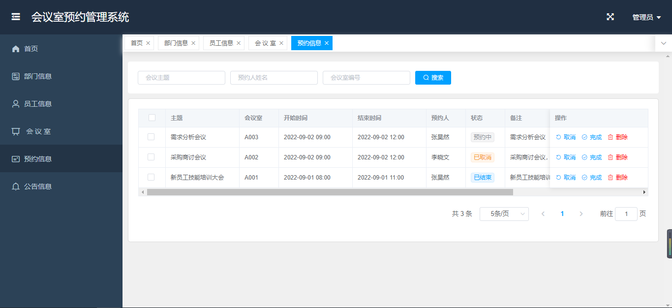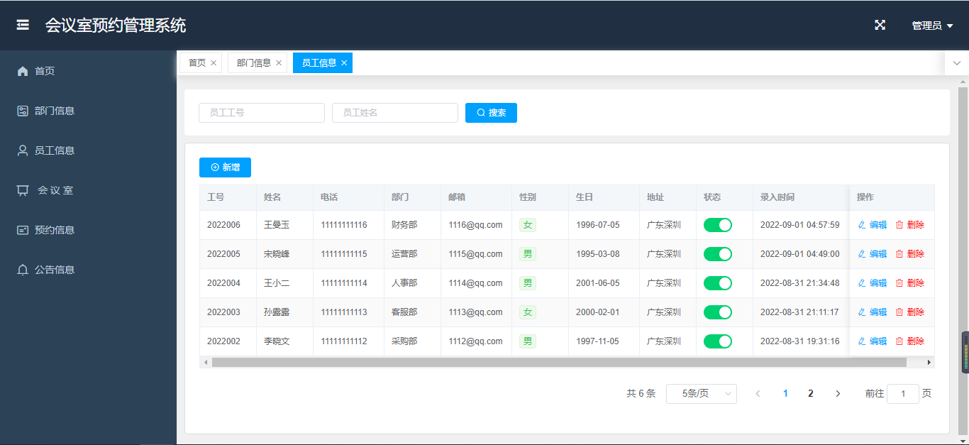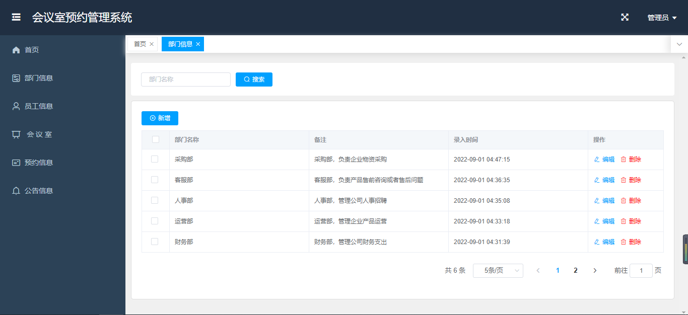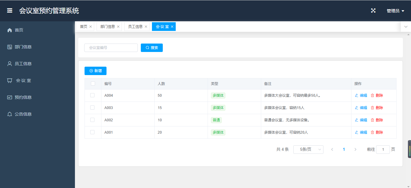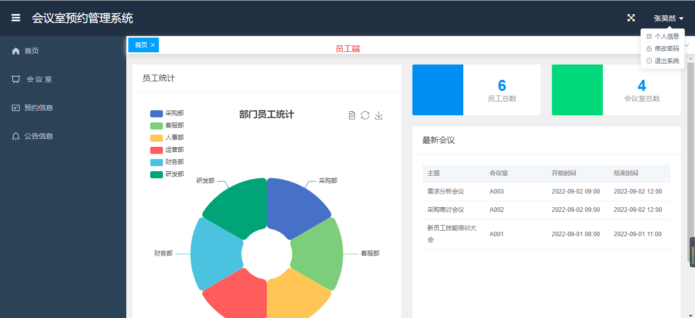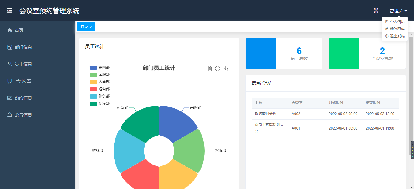 管理员:首页(数据图表统计);部门信息;员工信息;会议室管理;预约信息管理;公告信息管理;个人信息;密码修改;