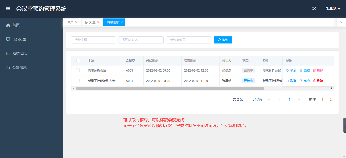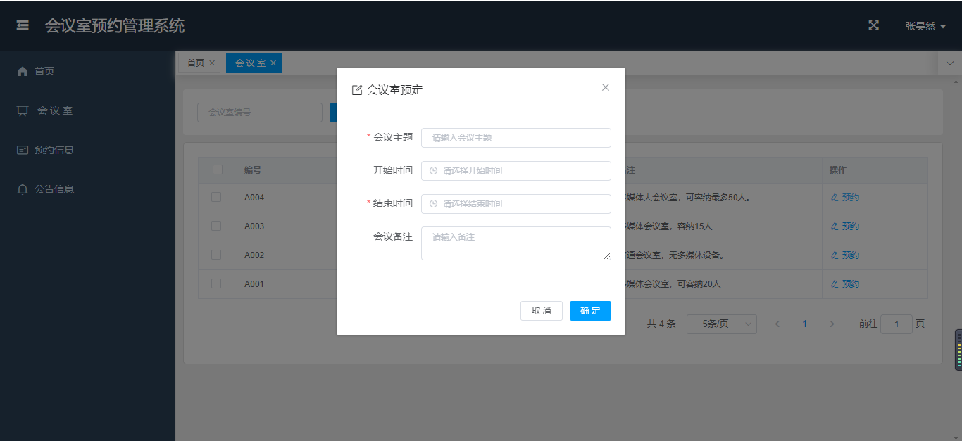 基于SpringBoot+Vue前后端分离的会议室预约管理系统,本人原创开发。
