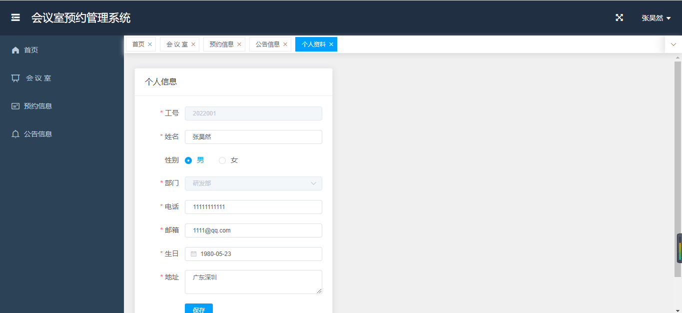 基于Springboot+Vue前后端分离的会议室预约管理系统,系统包含管理员、员工角色,功能如下: