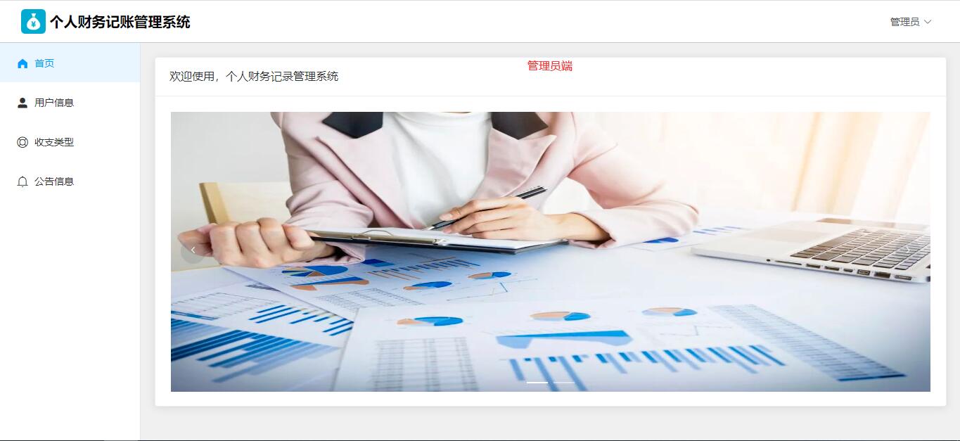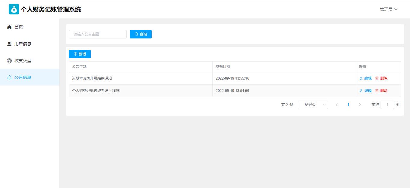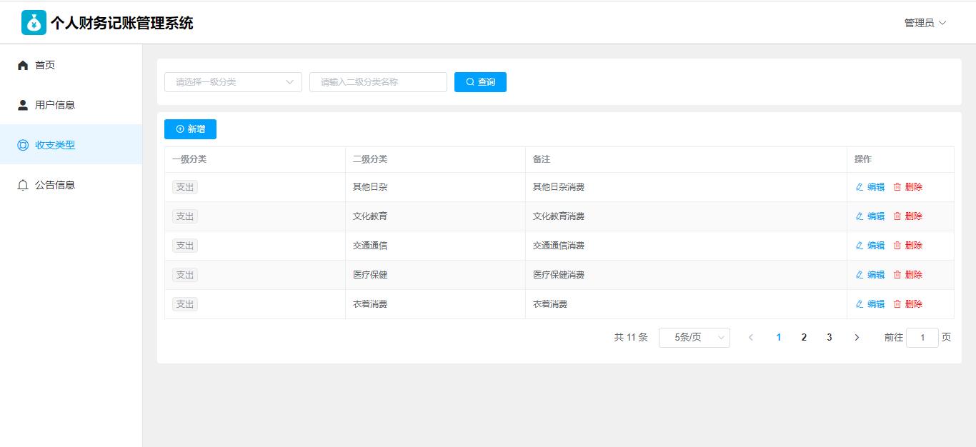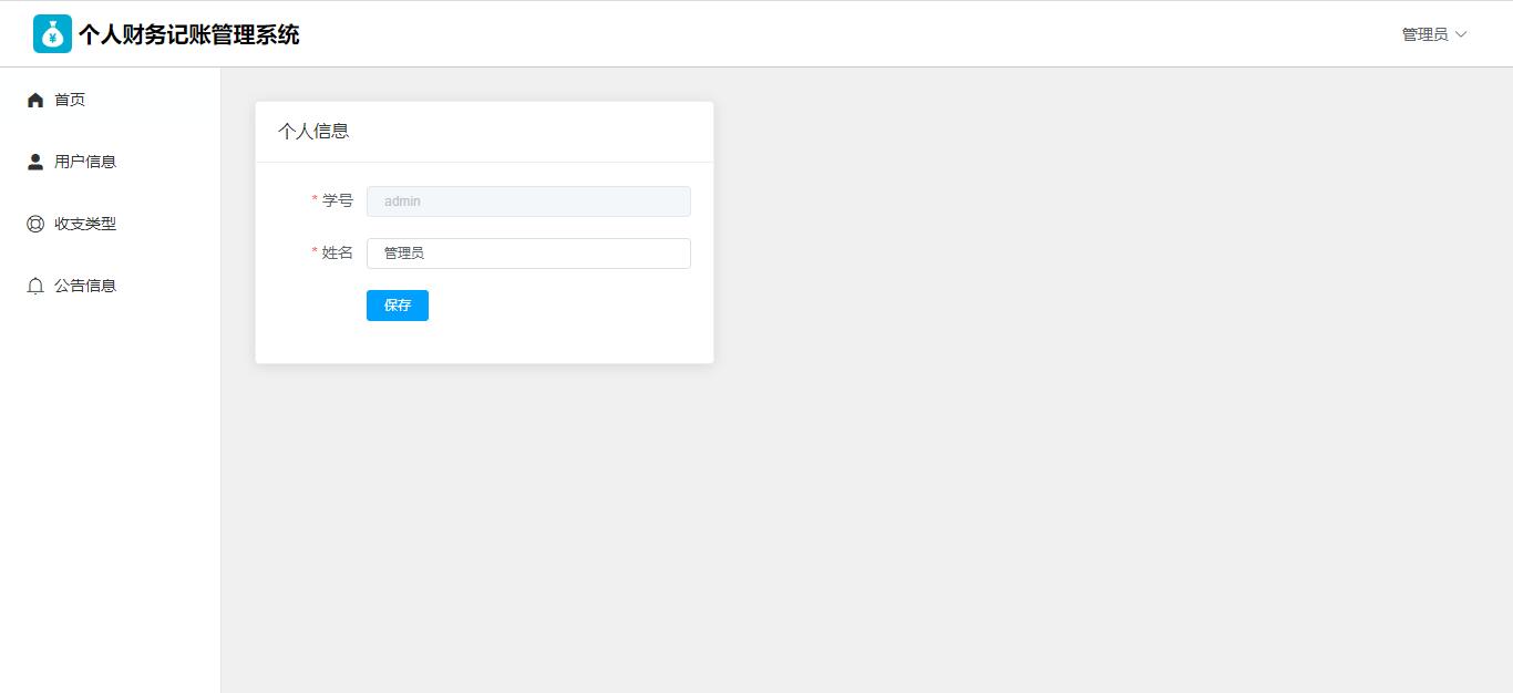管理员:用户信息管理;收支类型管理;公告信息管理;个人信息;密码修改;