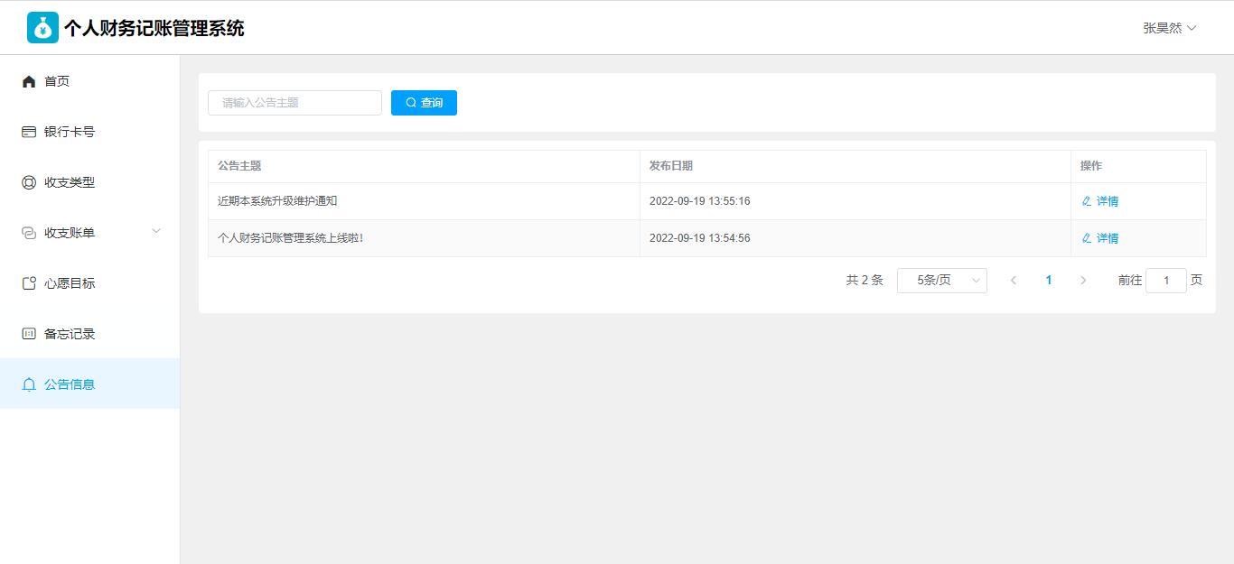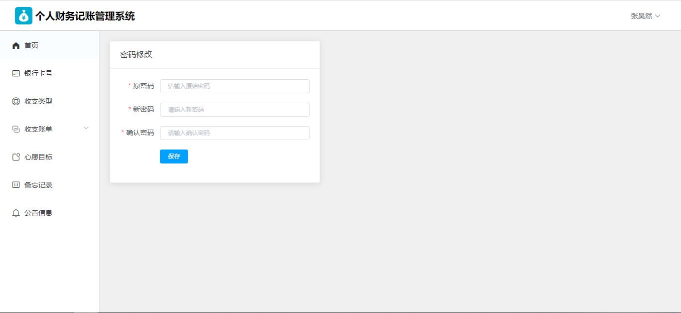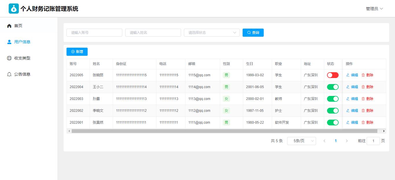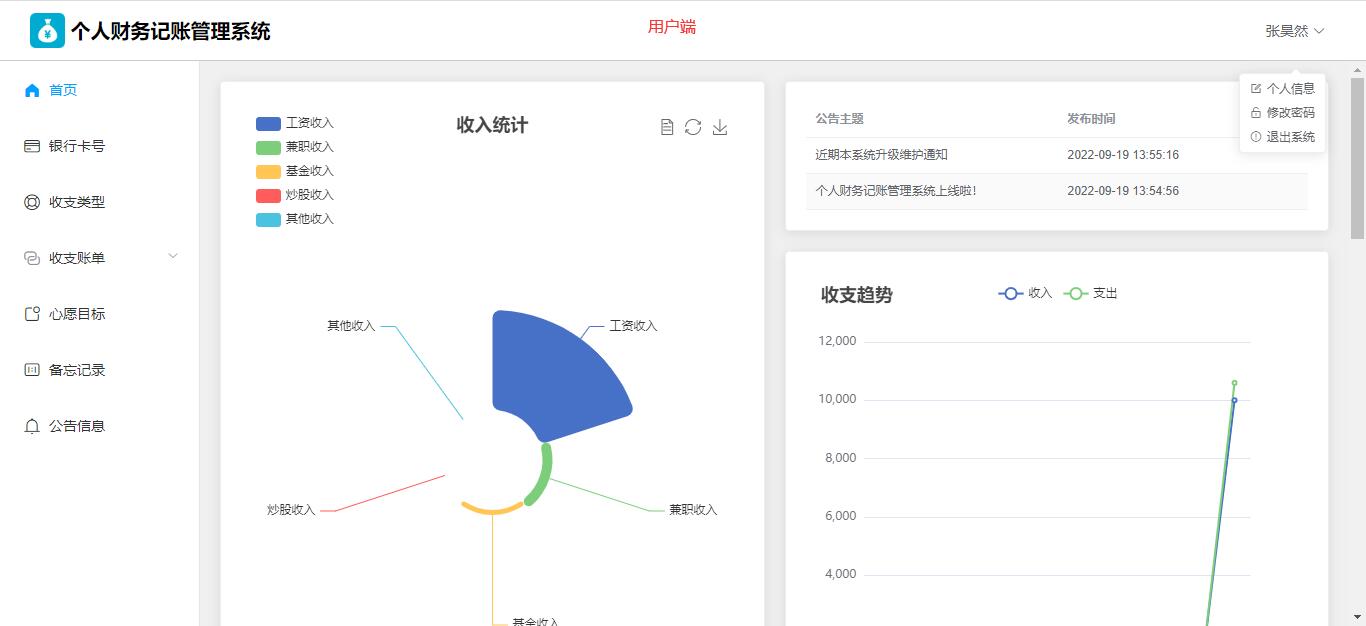 管理员:用户信息管理;收支类型管理;公告信息管理;个人信息;密码修改;