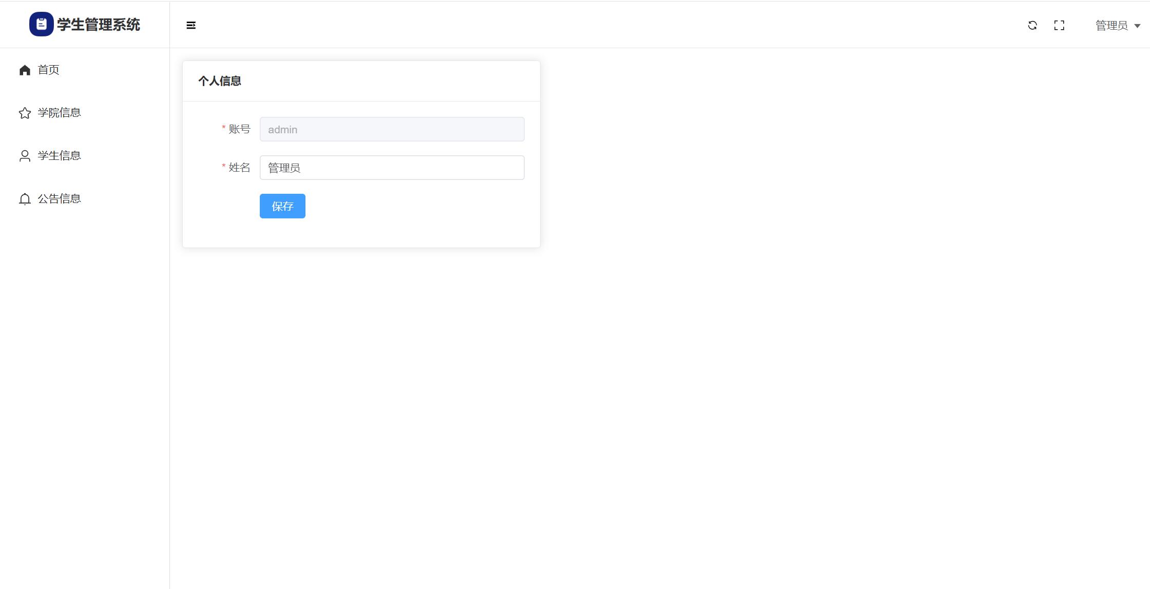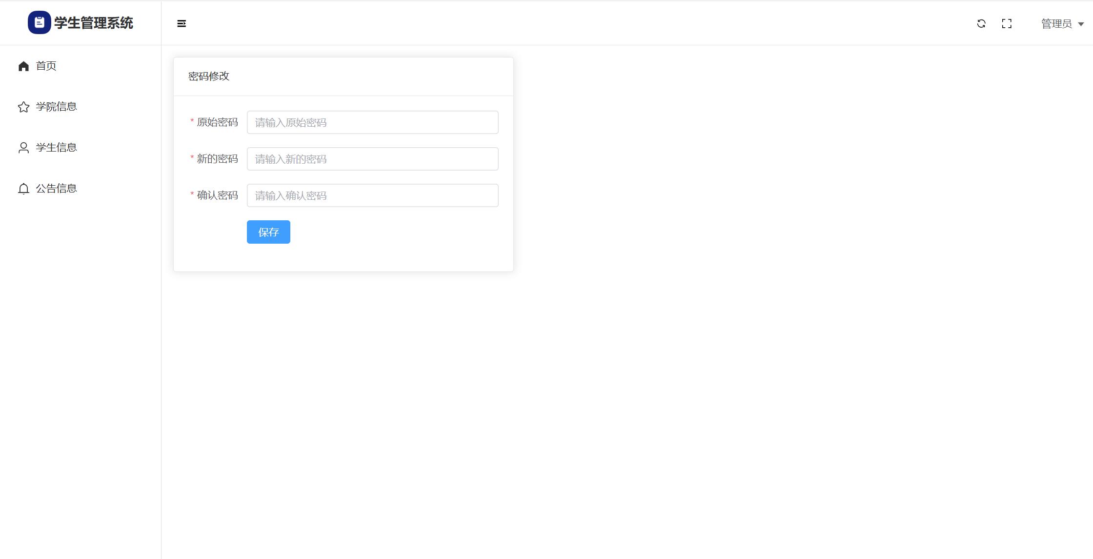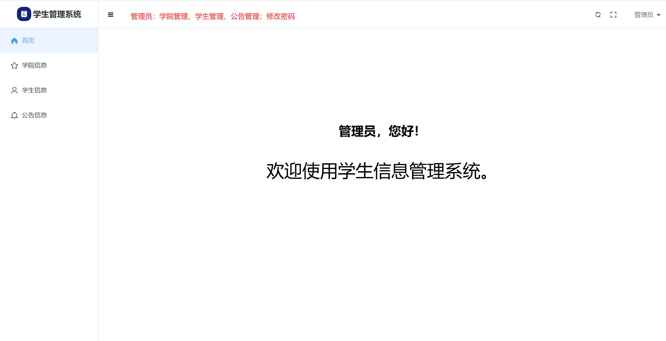 管理员:学院管理;学生管理;公告管理;个人信息;密码修改;