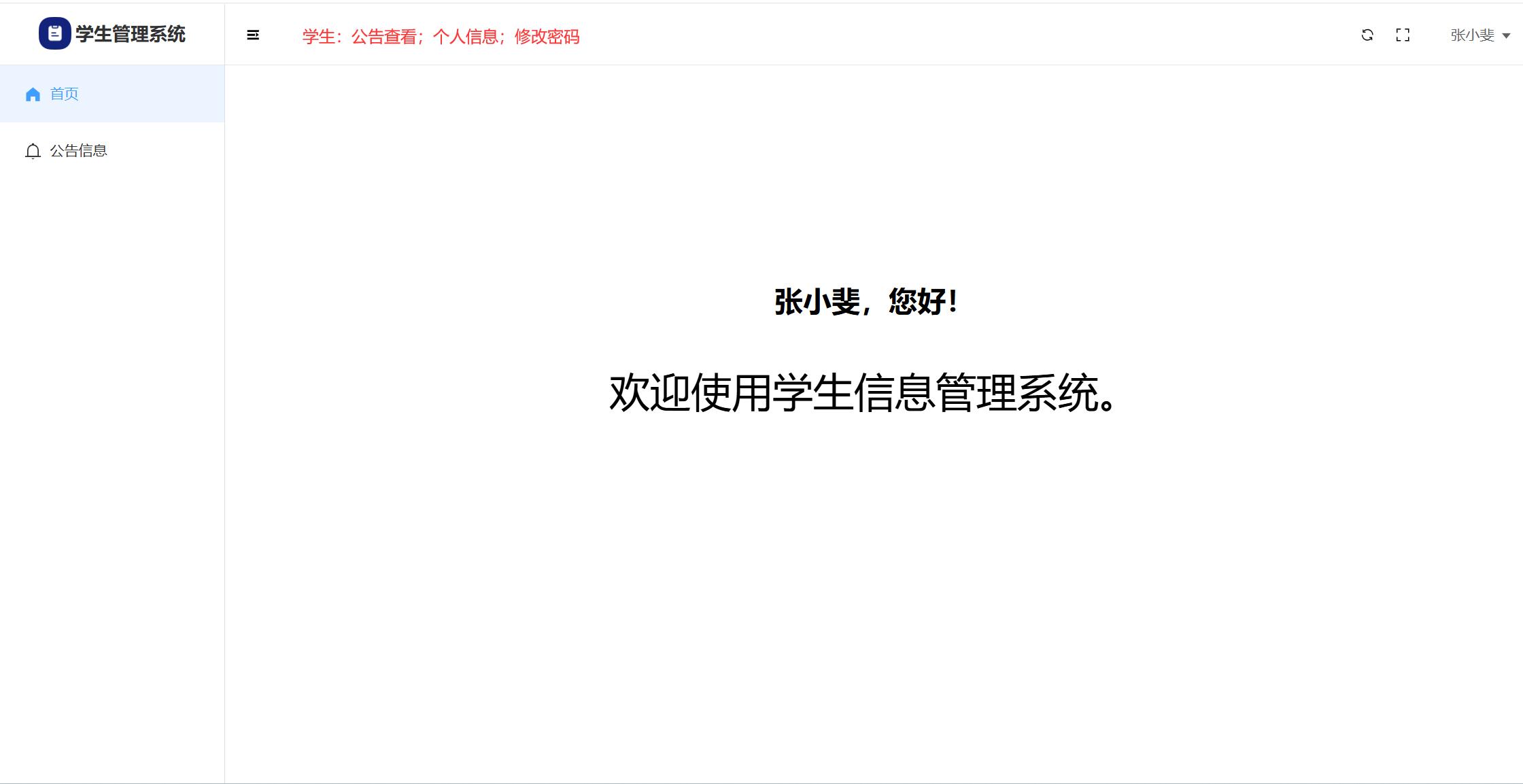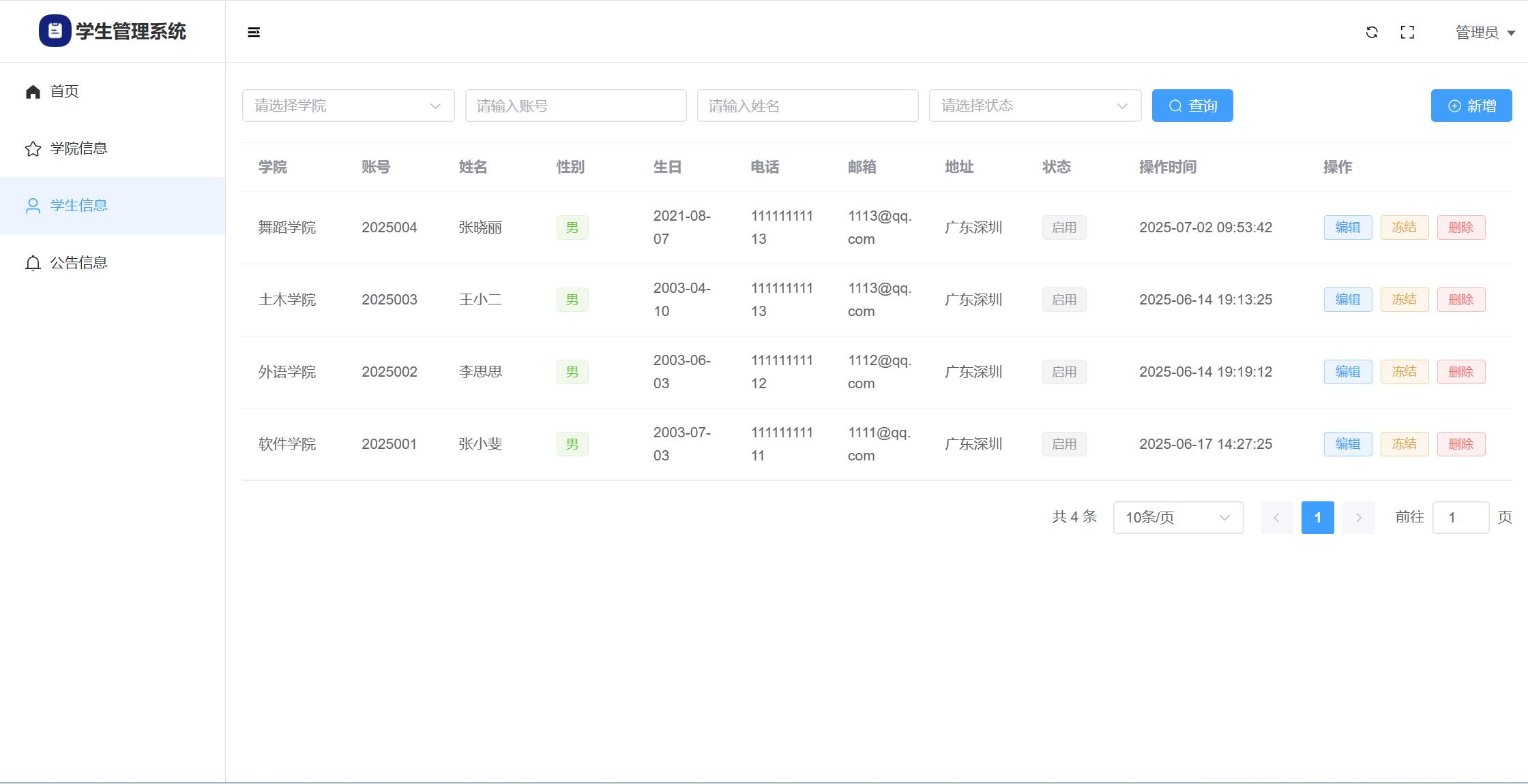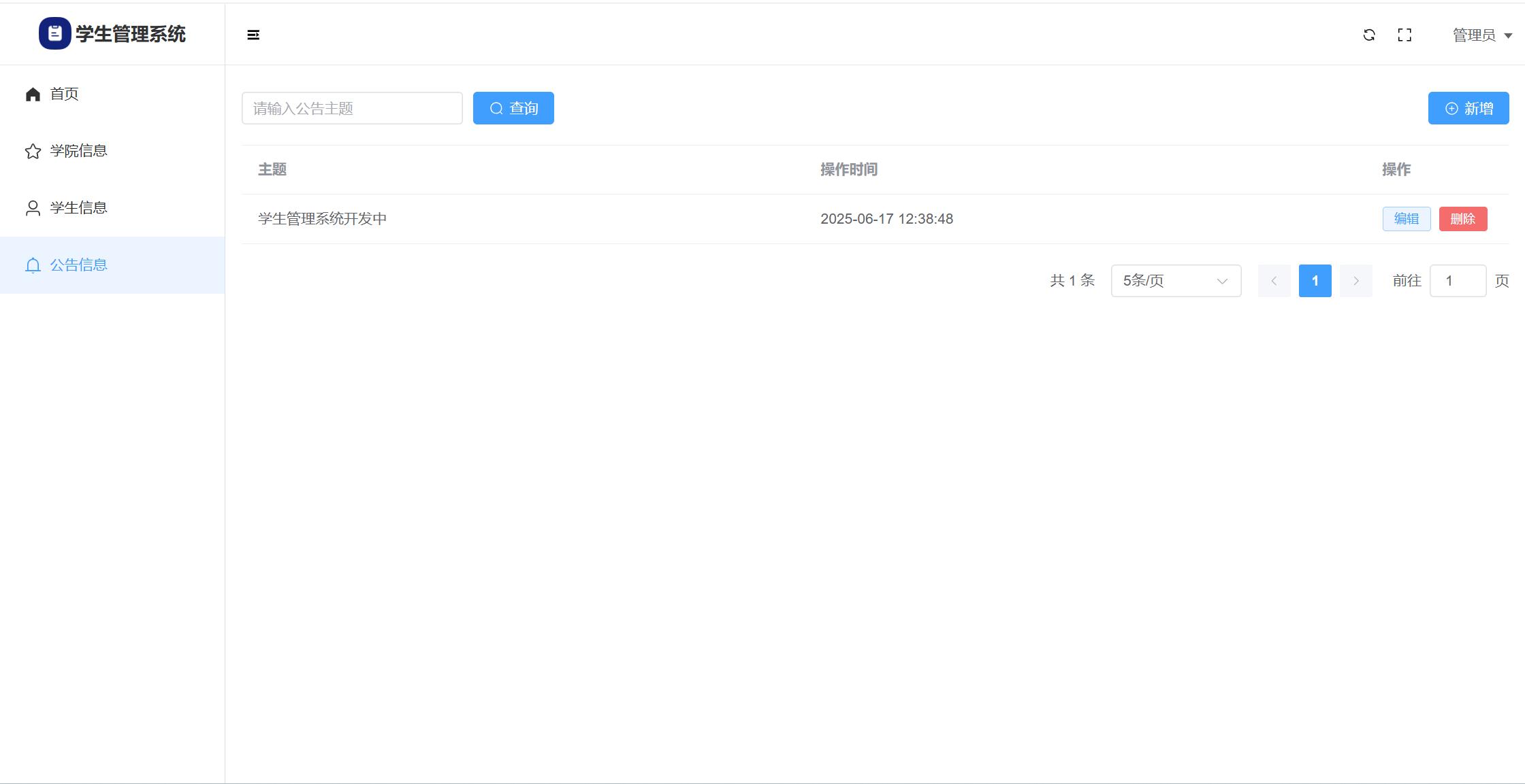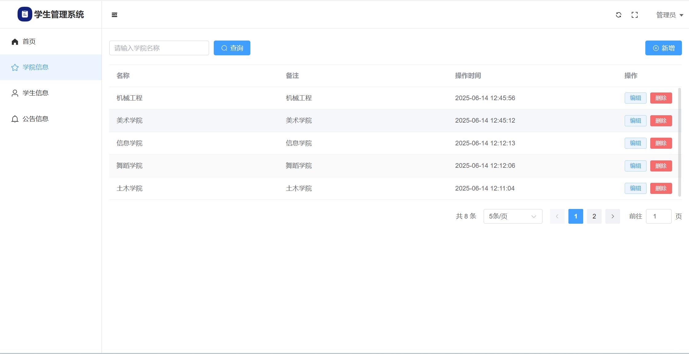 管理员:学院管理;学生管理;公告管理;个人信息;密码修改;