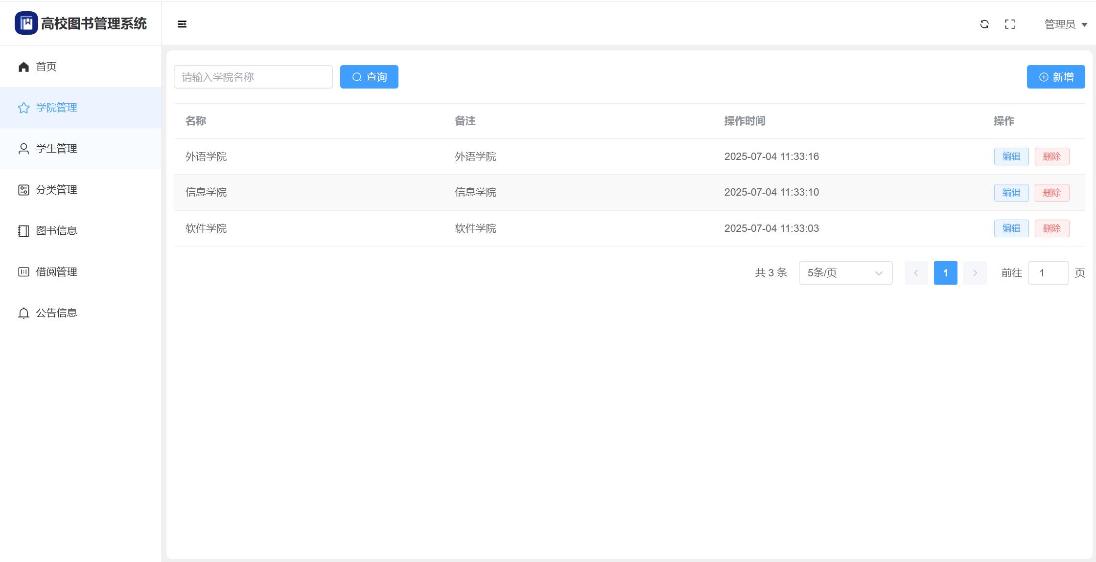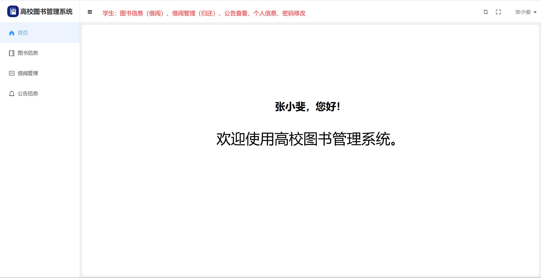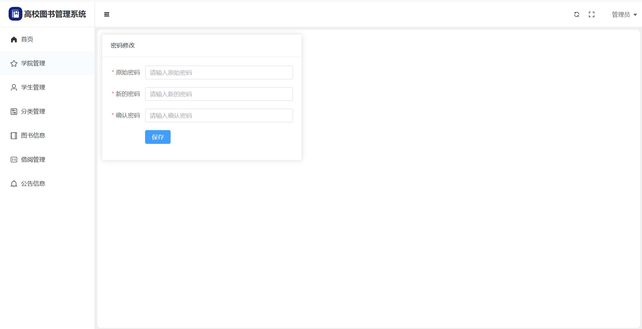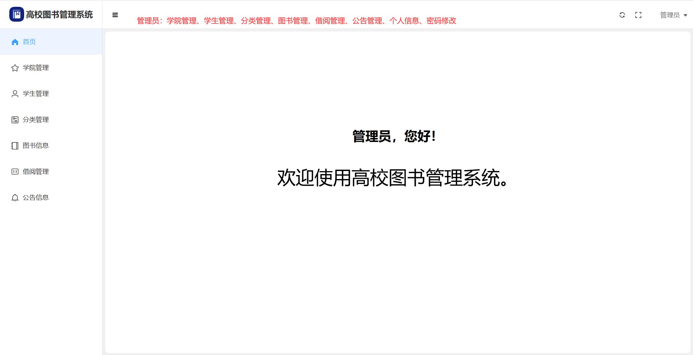 管理员:学院管理;学生管理;分类管理;图书信息;借阅管理;公告信息;个人信息;密码修改;