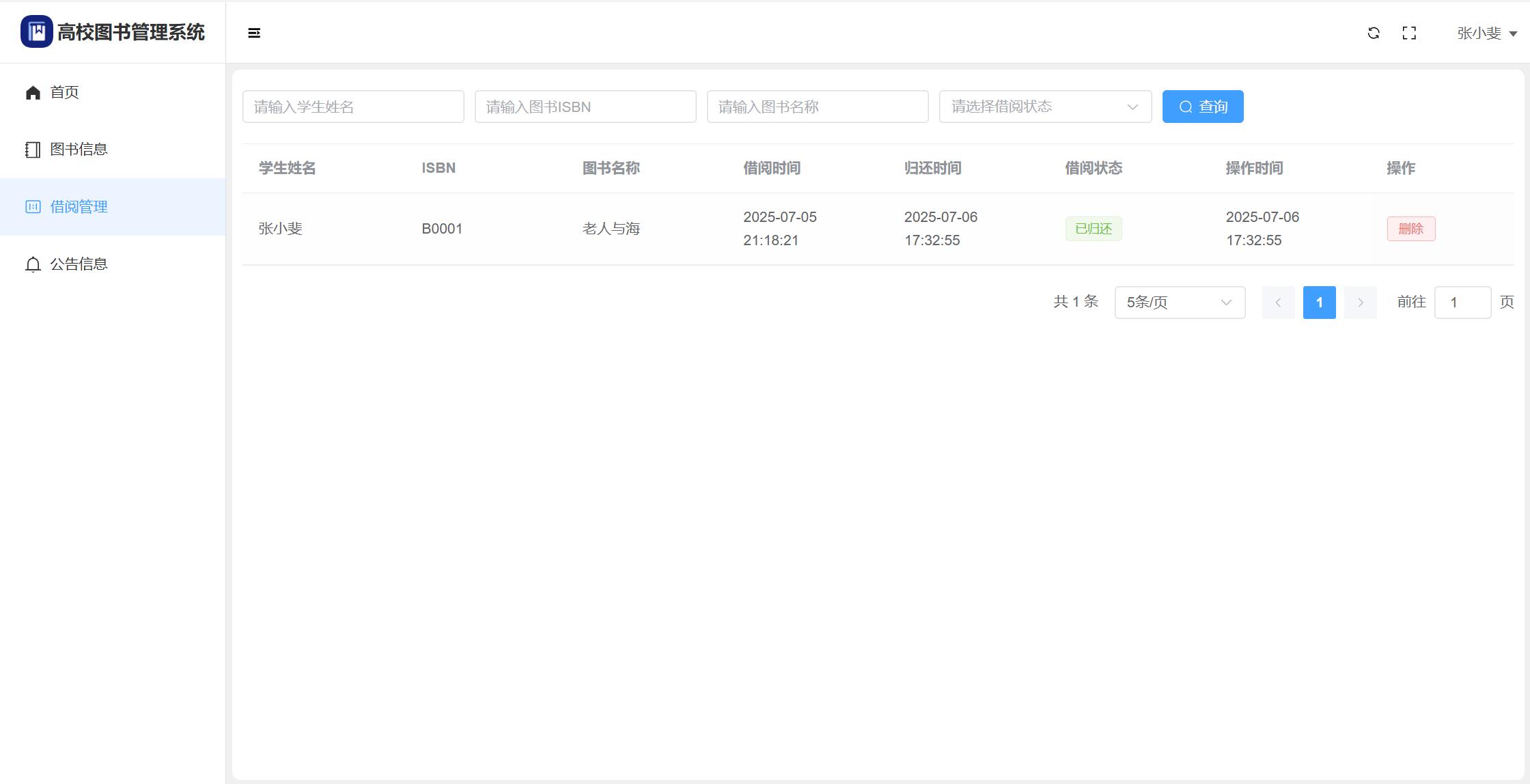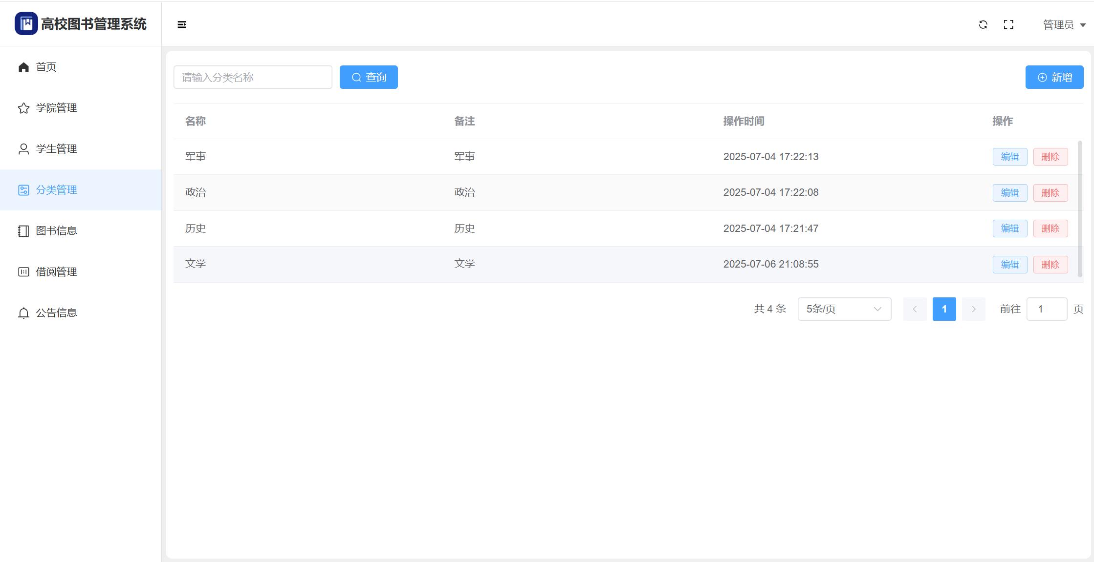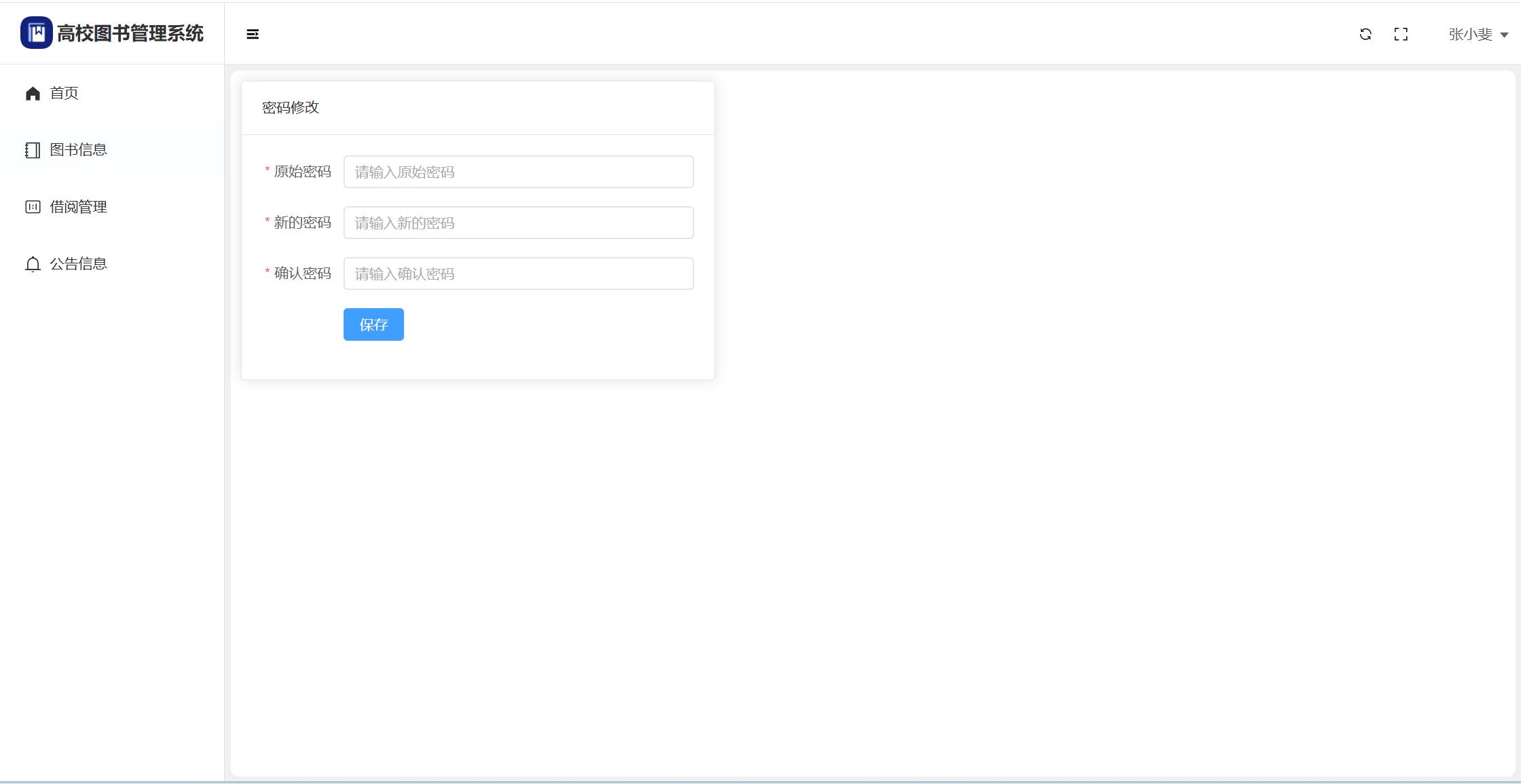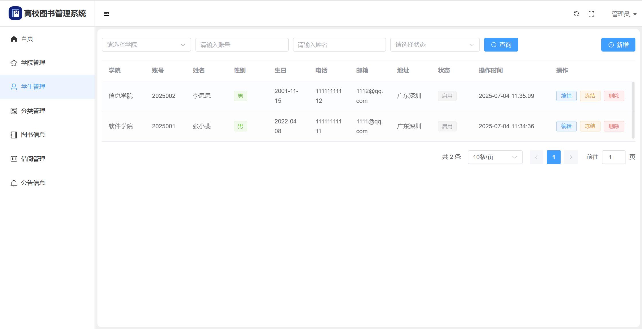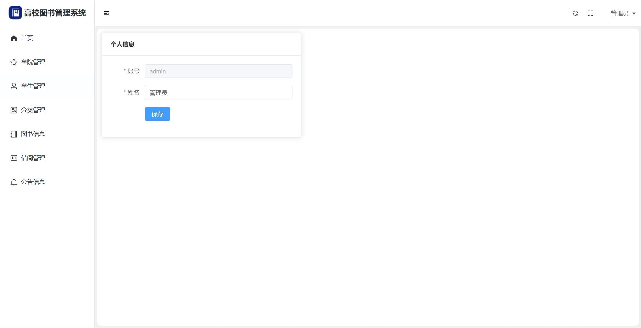 管理员:学院管理;学生管理;分类管理;图书信息;借阅管理;公告信息;个人信息;密码修改;