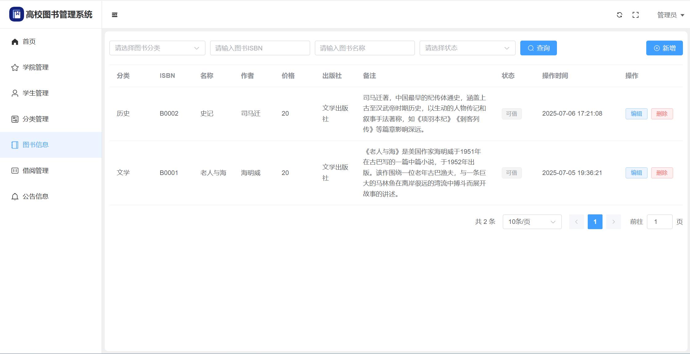 基于SpringBoot3+Vue3前后端分离的高校图书管理系统,系统包含管理员、学生角色,功能如下: