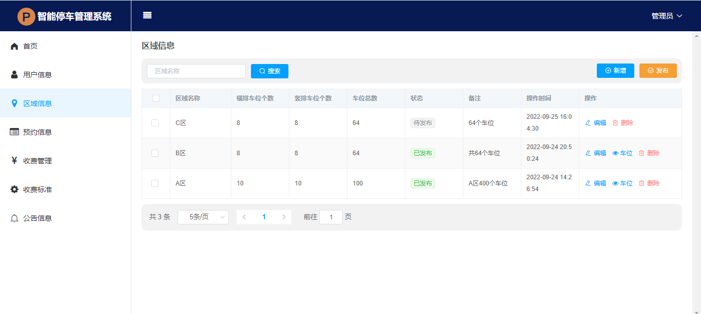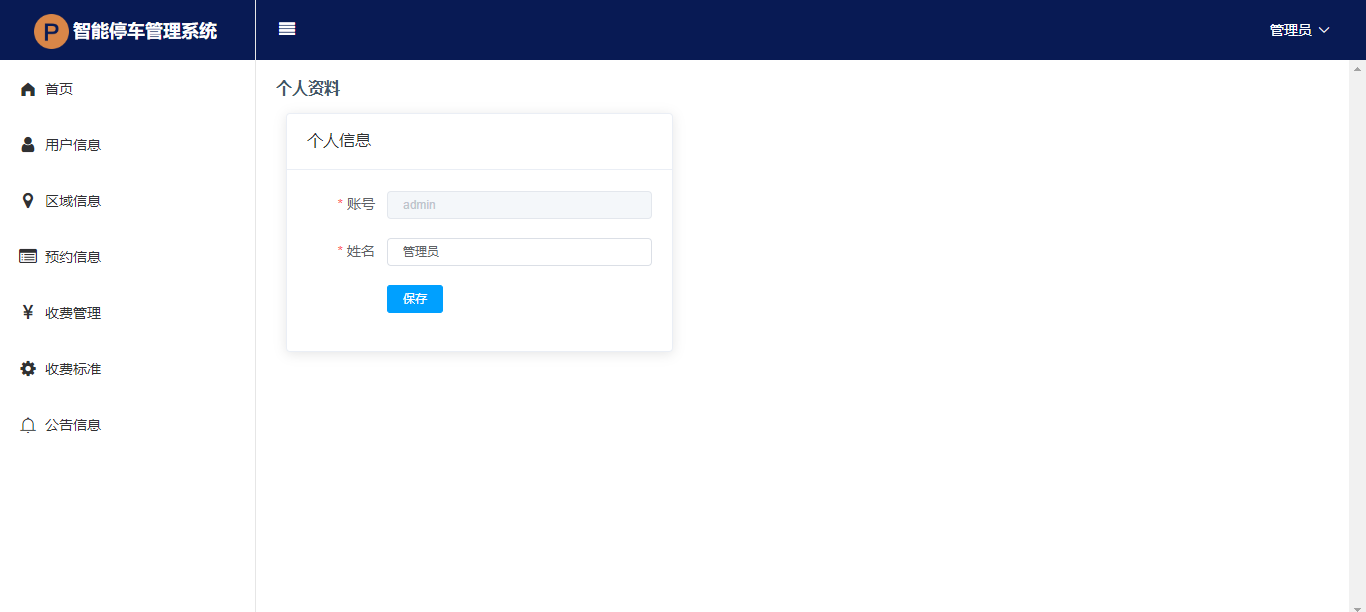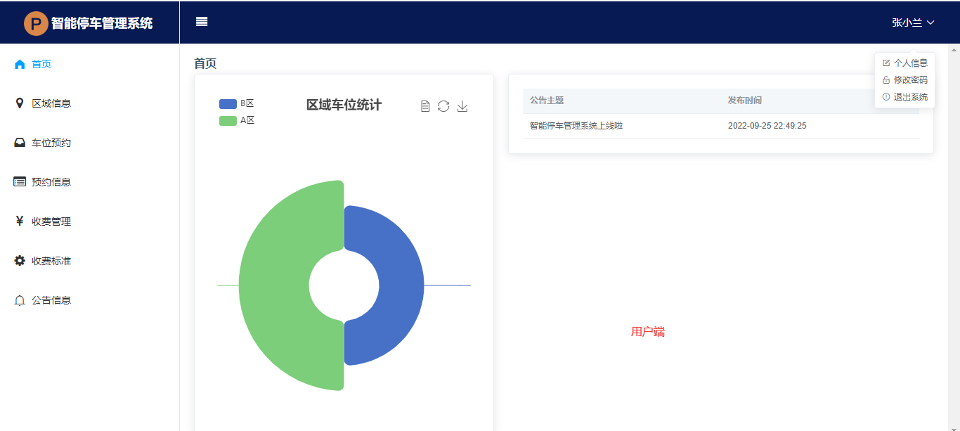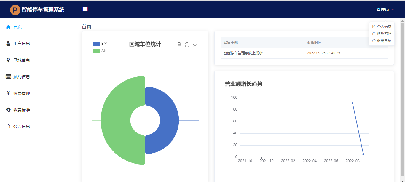 管理员:首页(区域车位统计图,营业额增长趋势图);用户信息(充值);区域信息;预约信息;收费管理;收费标准;公告信息;个人信息;密码修改;