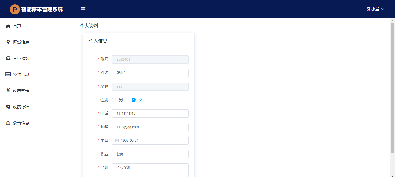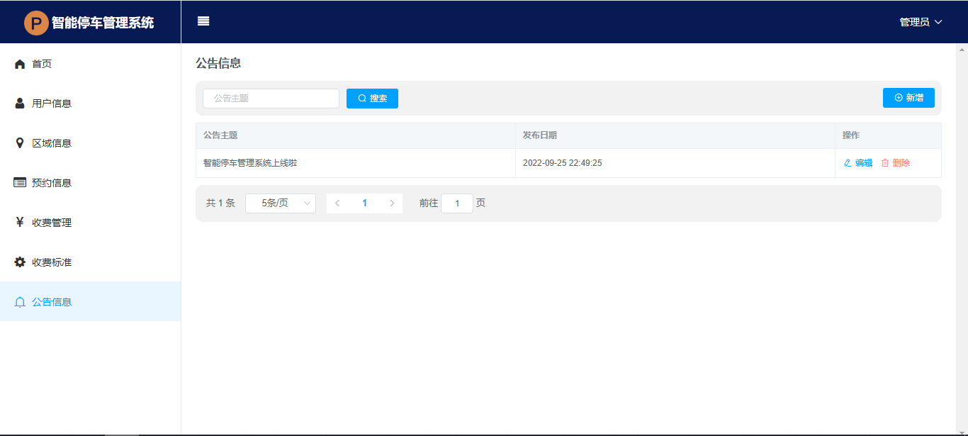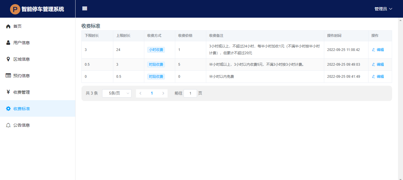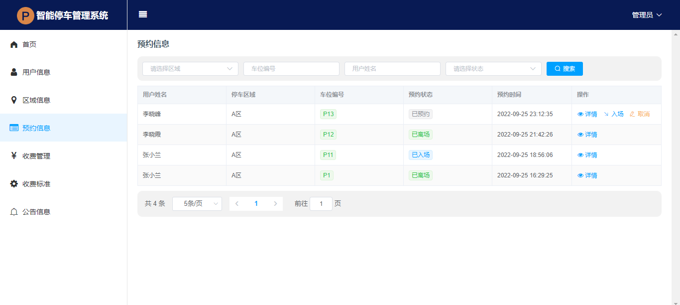 管理员:首页(区域车位统计图,营业额增长趋势图);用户信息(充值);区域信息;预约信息;收费管理;收费标准;公告信息;个人信息;密码修改;