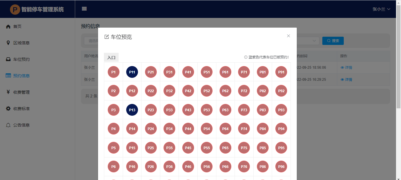 基于SpringBoot+Vue前后端分离的智能停车管理系统(预约停车收费管理),系统包含管理员、用户角色,功能如下: