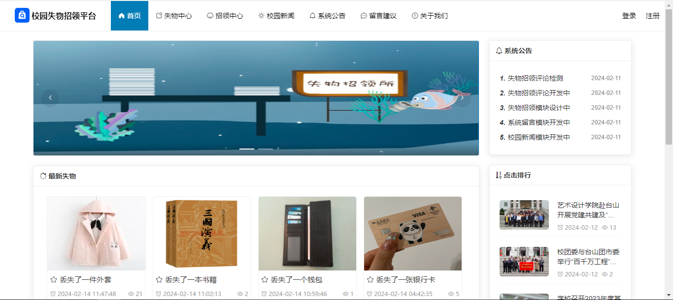 项目介绍:基于SpringBoot+Vue前后端分离的失物招领平台,本人原创开发。主要功能:基于SpringBoot+Vue前后端分离的失物招领平台,系统包含管理员、用户角色,功能如下:用户:注册、登录;首页,失物中心(可以按分类查看失物信息、发送消息、评论);招领中心(按分类查看招领信息、发送消息、评论);可以查看校园新闻;查看系统公告;给平台留言建议;关于我们。用户还具有个人中心功能,我的失物、我的招领、我的私信、私信我的、我的评论、平台建议、个人信息密码修改。管理员:首页统计;用户管理、物品分类、校园新闻管理、失物管理(失物管理、评论信息)、招领管理(招领管理、评论信息)、平台建议管理、公告信息、个人信息密码修改。系统界面美观大方,功能丰富,使用了SpringBoot、Vue、ElementUI、Echarts等技术栈,适合作为毕业设计、课程设计,有需要可提供指导。开发技术:服务器端:SpringBoot2、Mybatis、Mysql前端:Vue2、ElementUI、Axios、VueRouter、Echarts开发工具:服务器端:JDK1.8、IDEA2023以上、Mysql5.6以上前端:VSCode、Nodejs14以上包含项目:源码、数据库、远程安装、数据库表结构设计文档部分截图: -