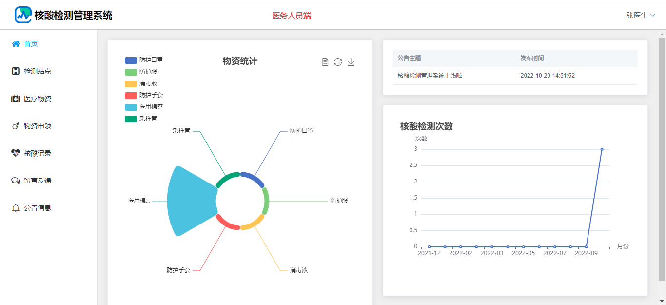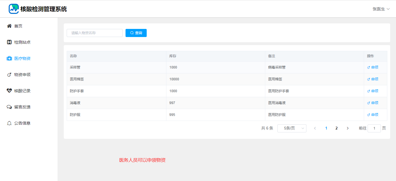 医务人员:登录;首页;检测站点和人员查看;医疗物资申领;物资申领;核酸记录(录入);留言反馈;公告信息;个人信息修改;密码修改。