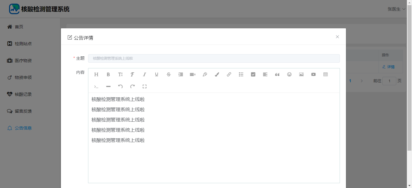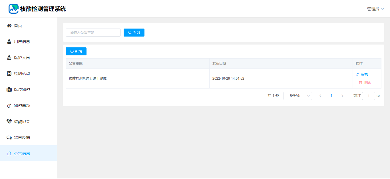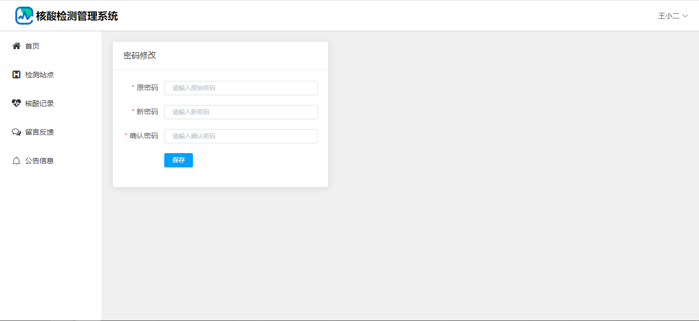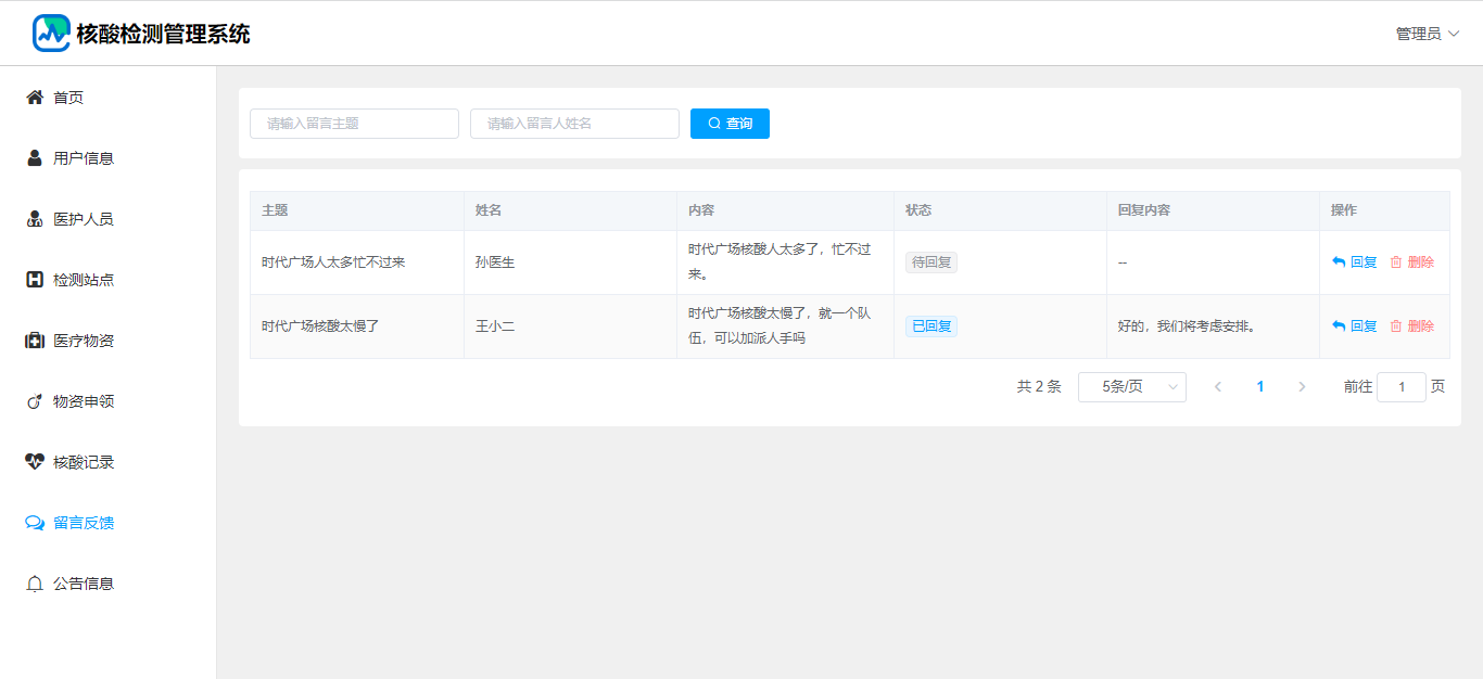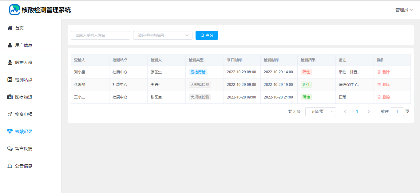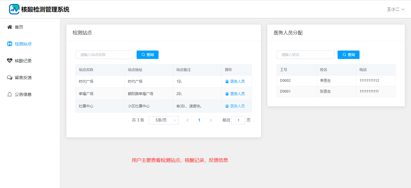 用户:注册、登录系统;首页;检测站点和人员查看;核酸记录;留言反馈;公告;个人信息密码修改。