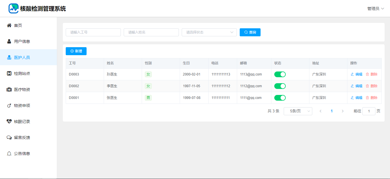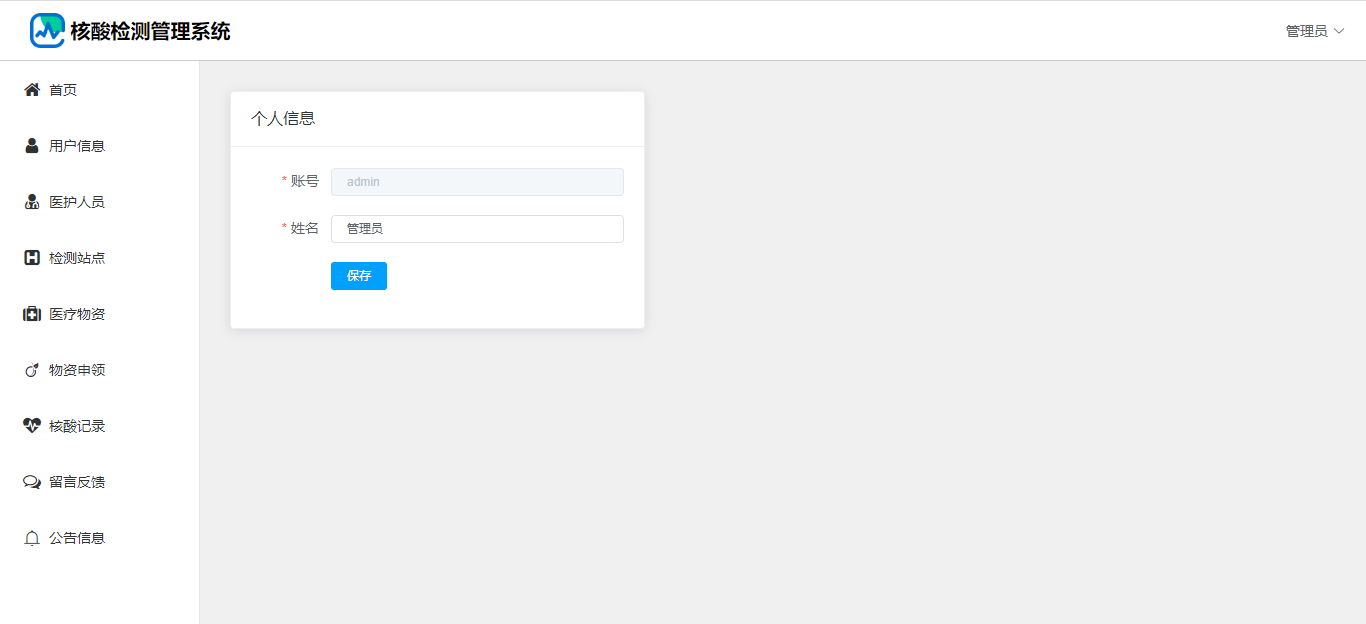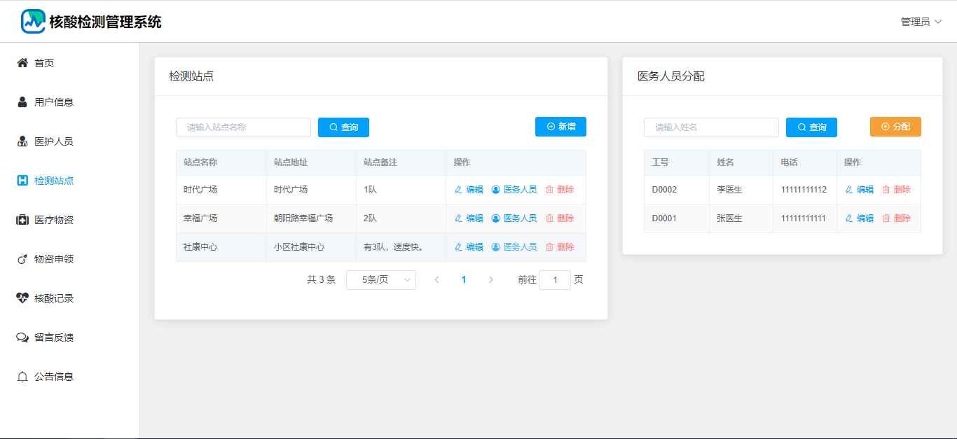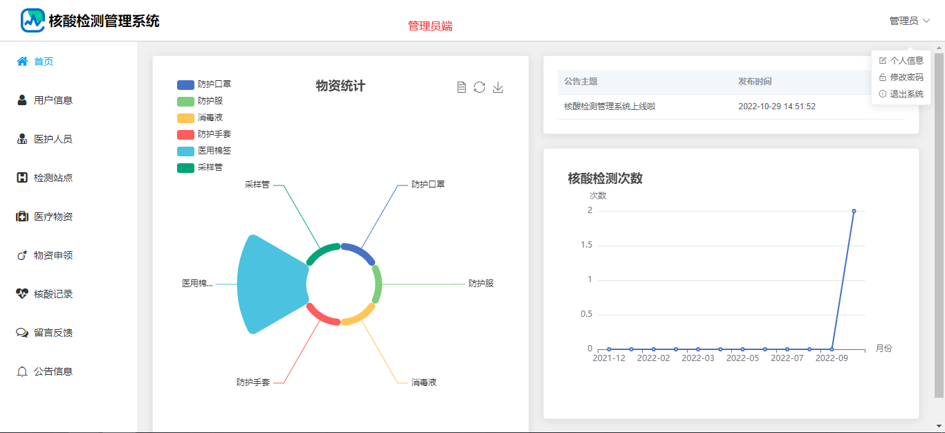管理员:登录;首页(物资统计、核酸检测次数统计);用户信息;医护人员信息;检测站点管理(站点医务人员分配);医疗物资;物资申领(审核);核酸记录;留言反馈(回复);公告信息;个人信息;密码修改;