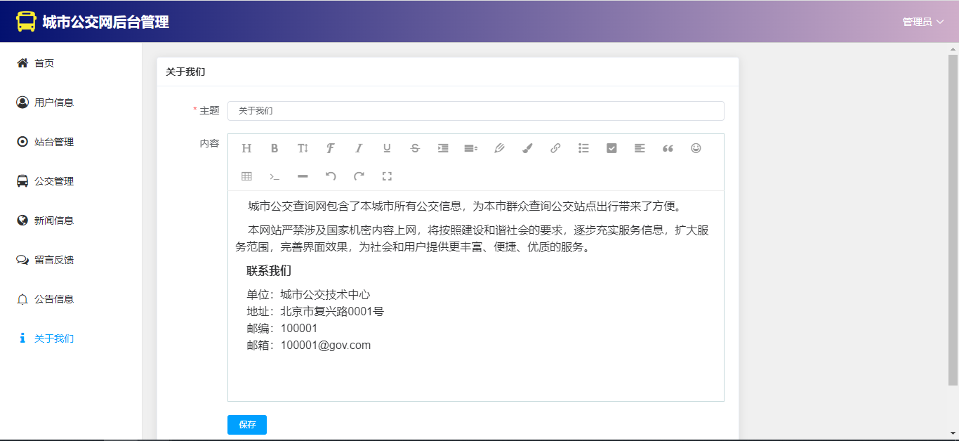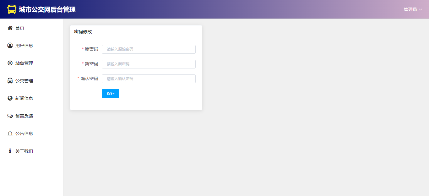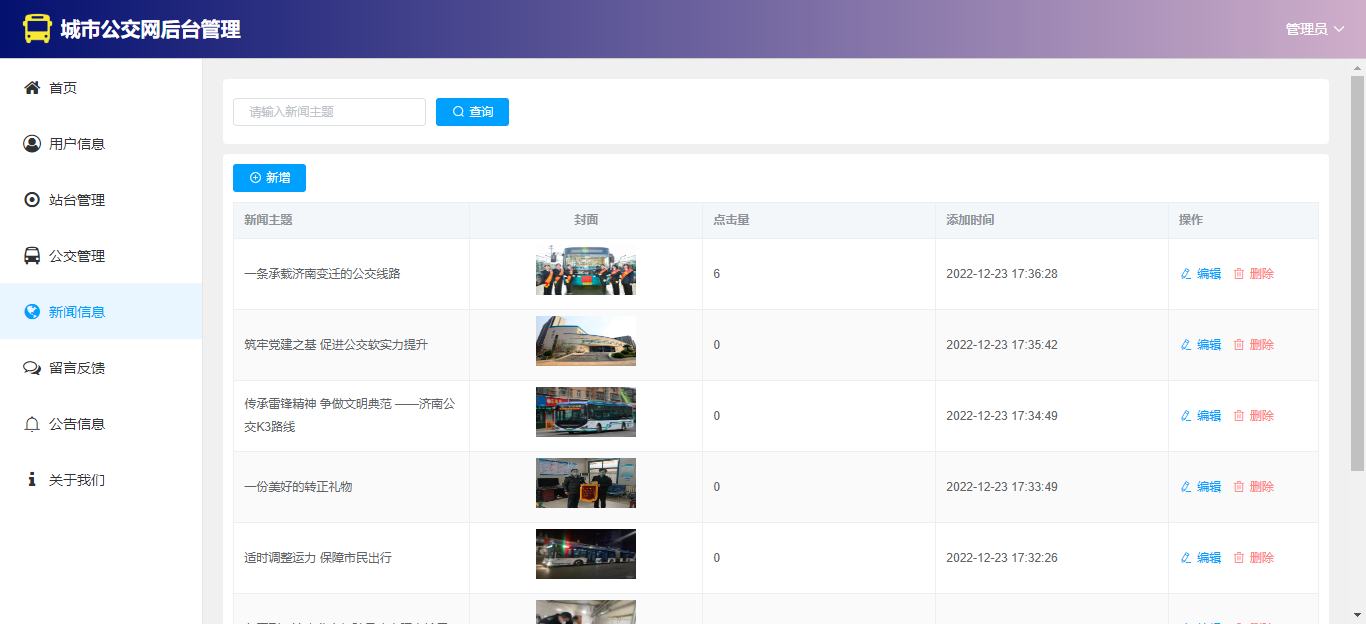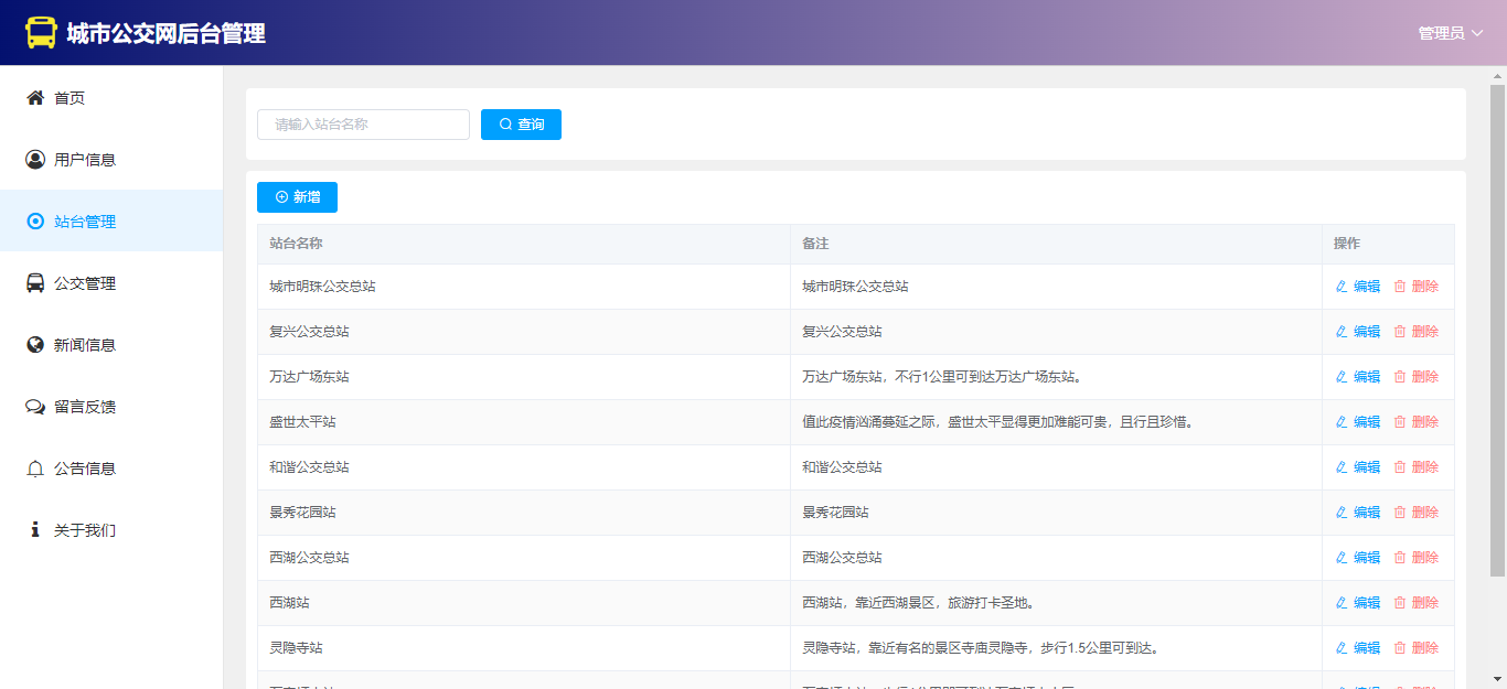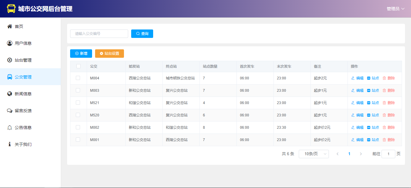 管理员:登录,用户管理;站台管理;公交管理(公交途径站点管理);新闻管理;留言反馈;公告信息;关于我们;