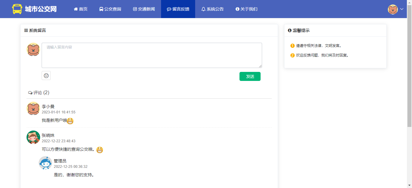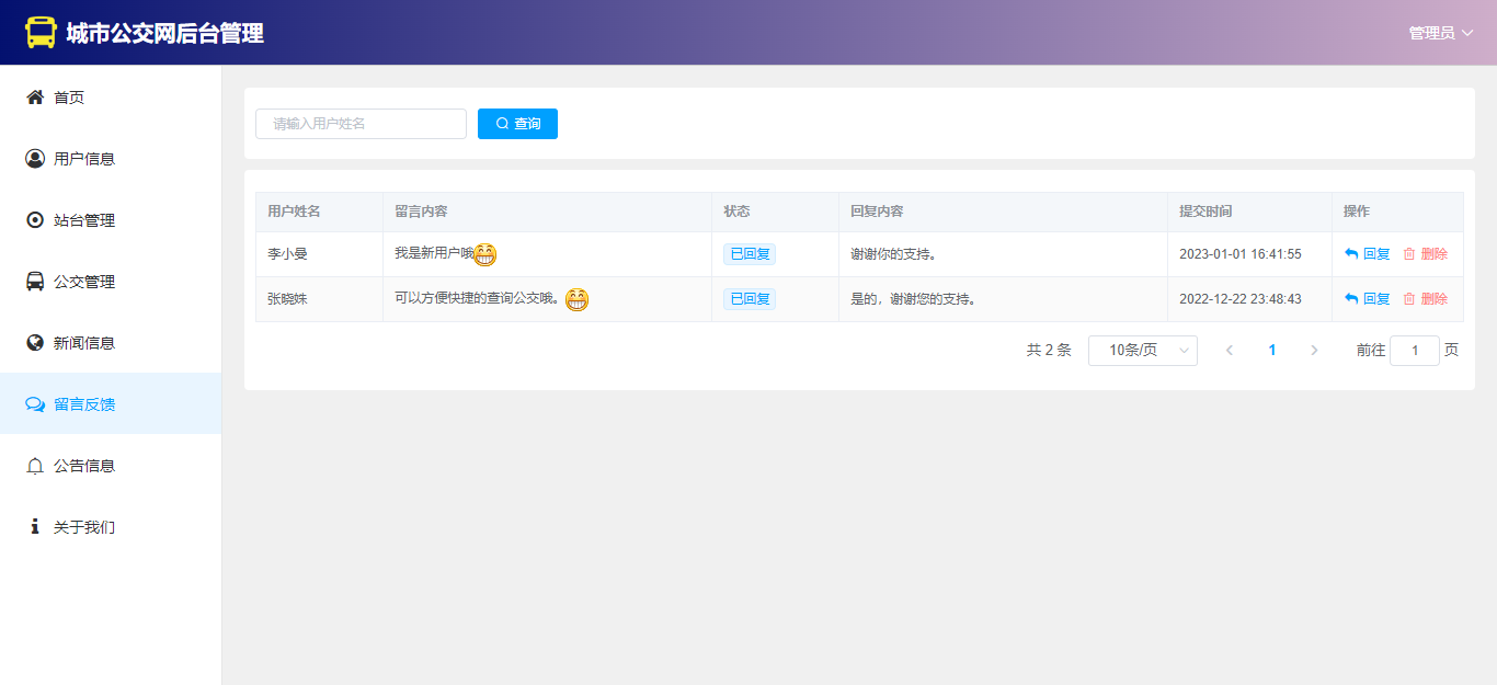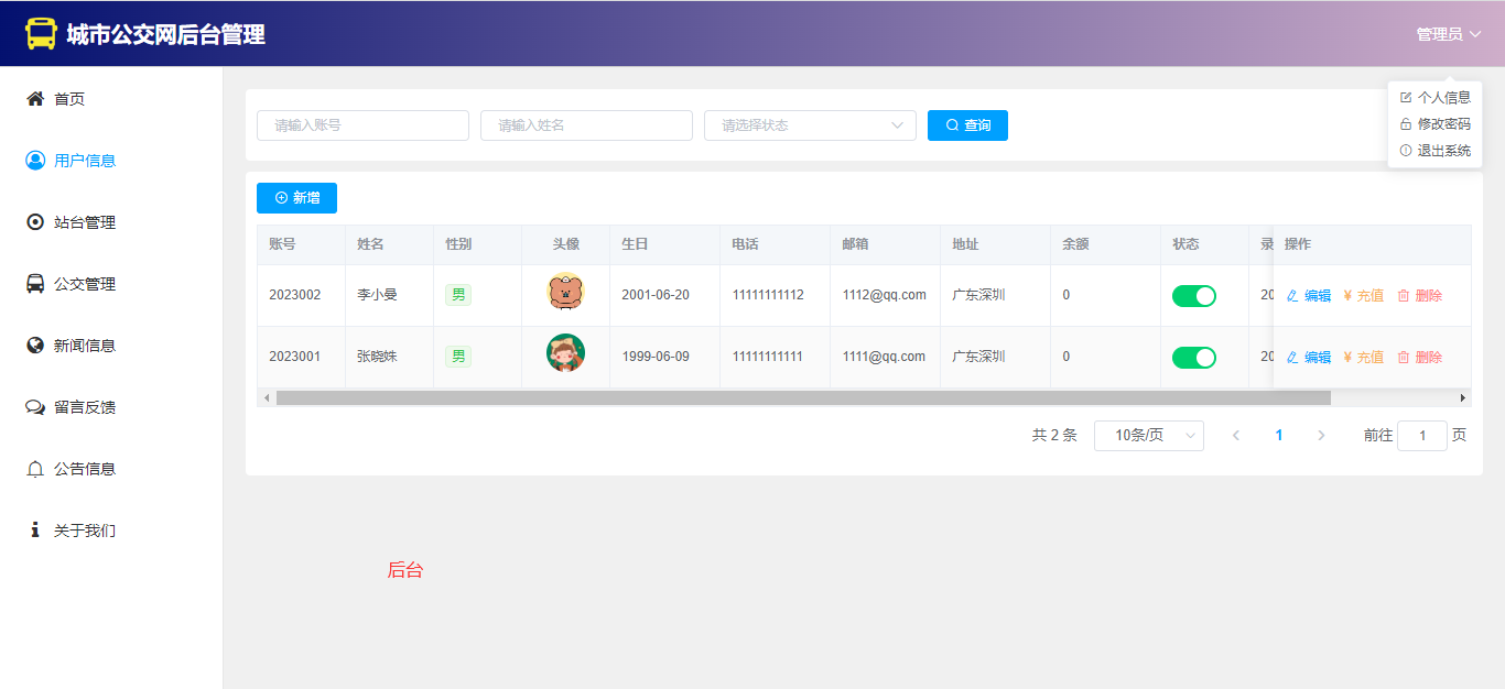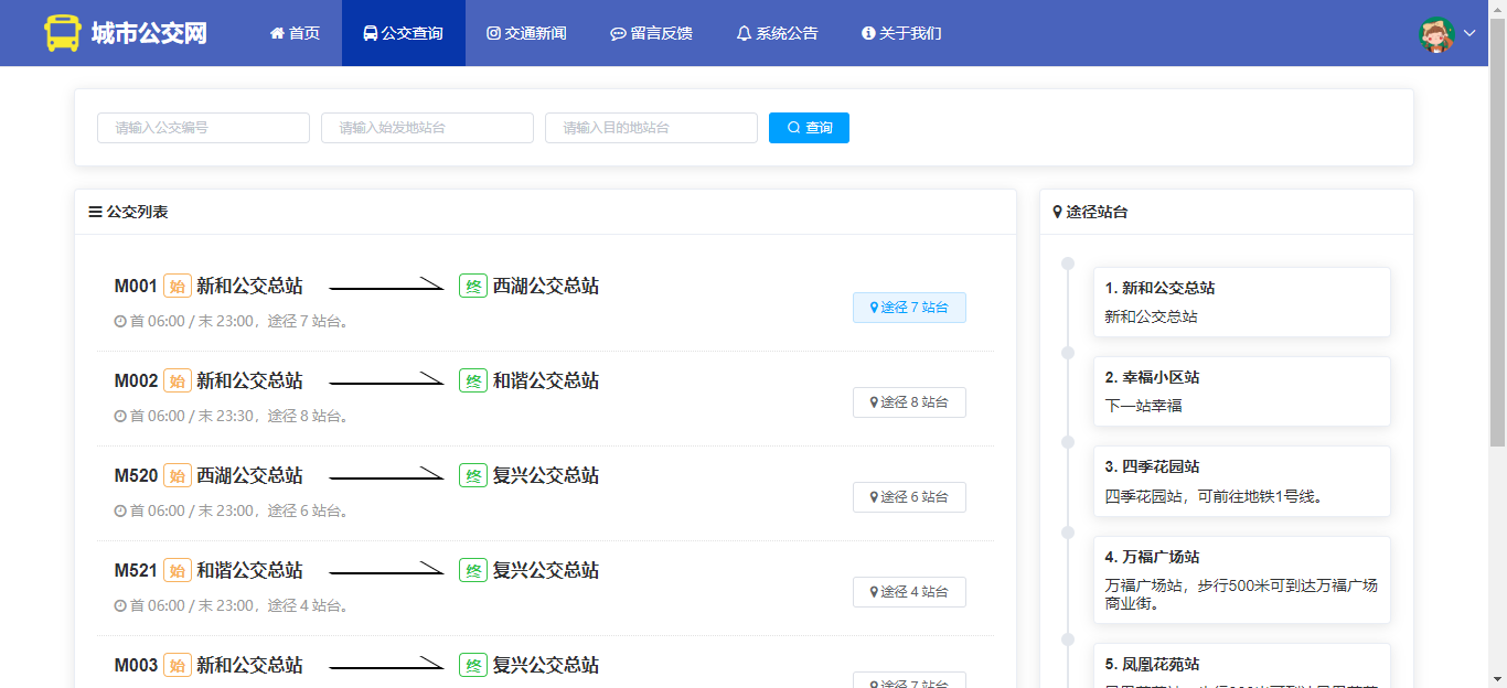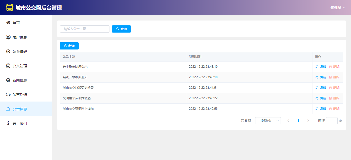 管理员:登录,用户管理;站台管理;公交管理(公交途径站点管理);新闻管理;留言反馈;公告信息;关于我们;