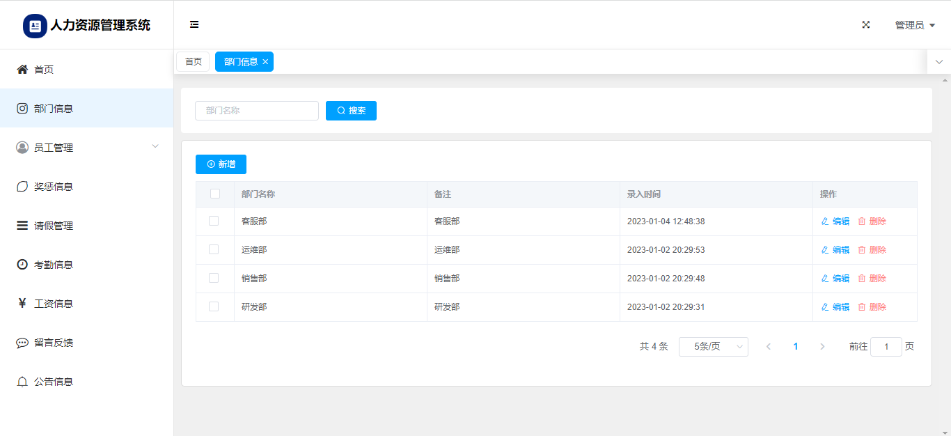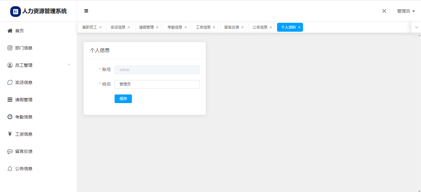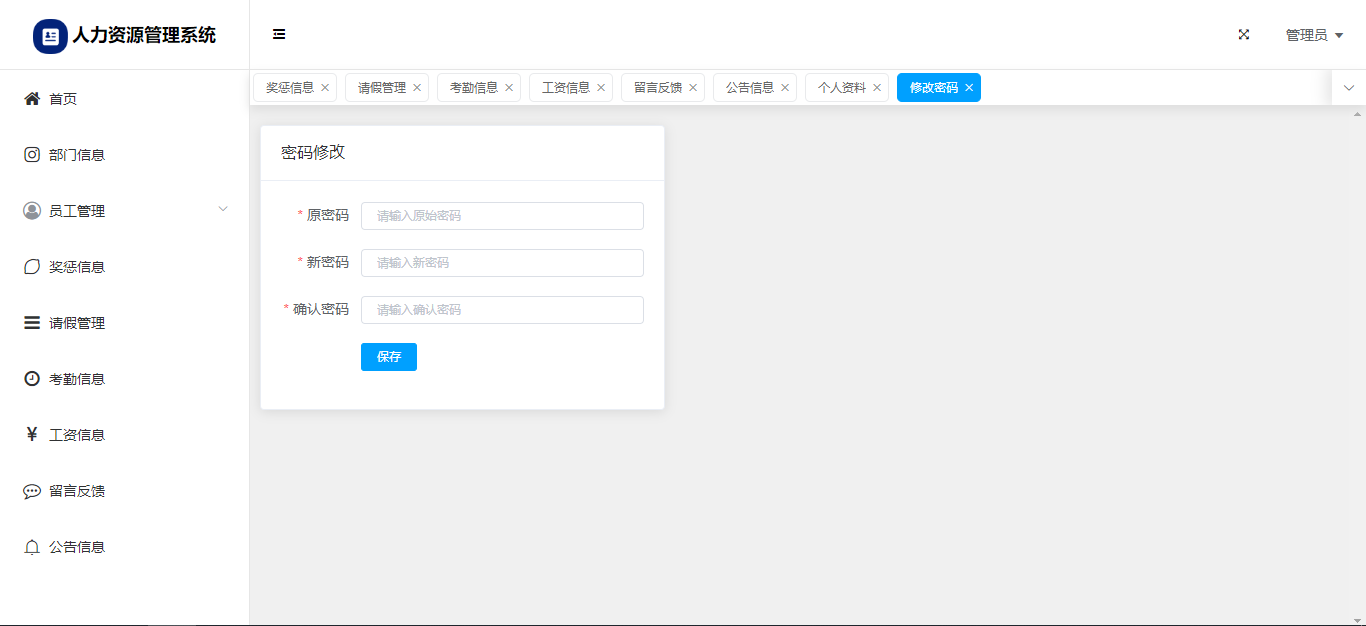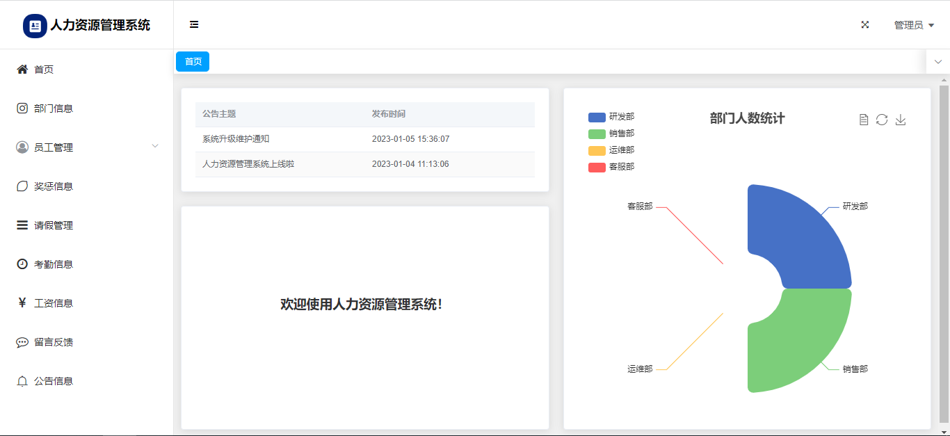 管理员:登录;首页(统计);部门信息;员工管理;奖惩信息;请假管理(审核);考勤信息;工资信息(发放);留言反馈(回复);公告信息;个人信息;密码修改;