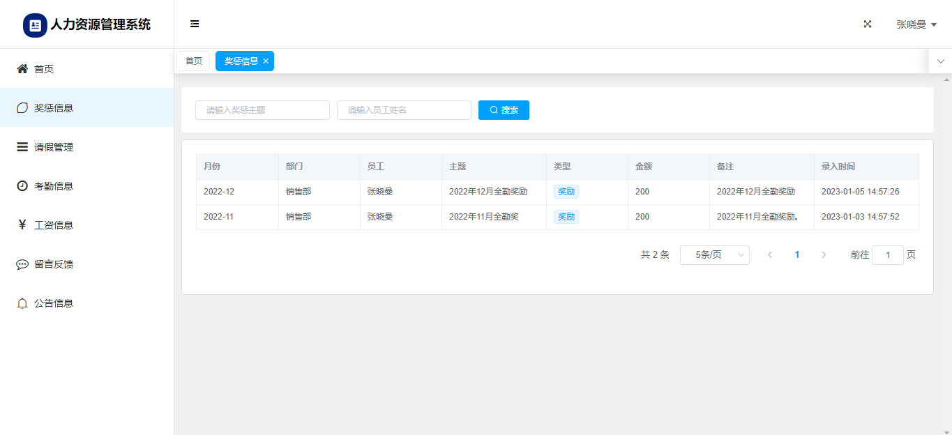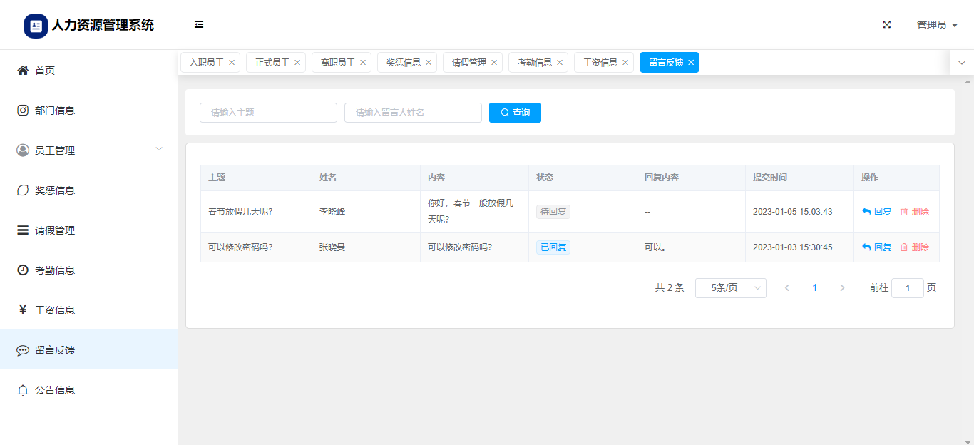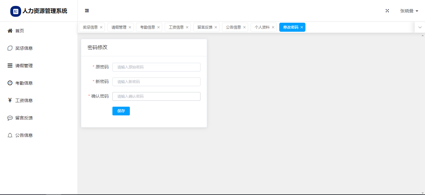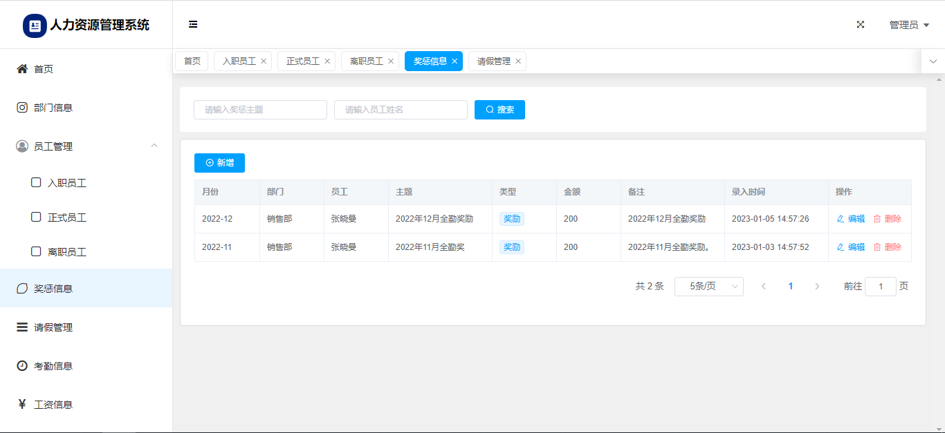 管理员:登录;首页(统计);部门信息;员工管理;奖惩信息;请假管理(审核);考勤信息;工资信息(发放);留言反馈(回复);公告信息;个人信息;密码修改;