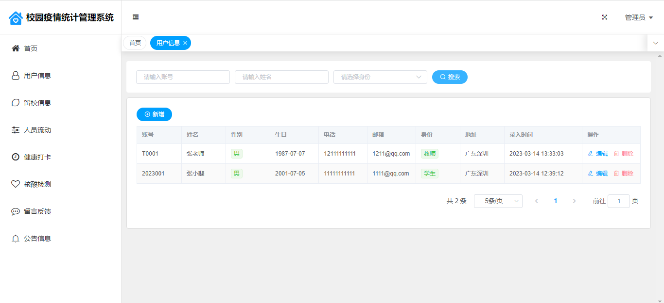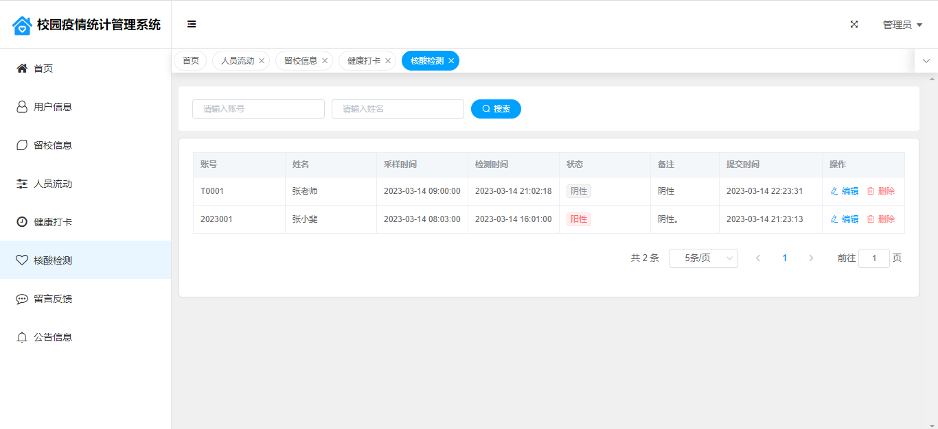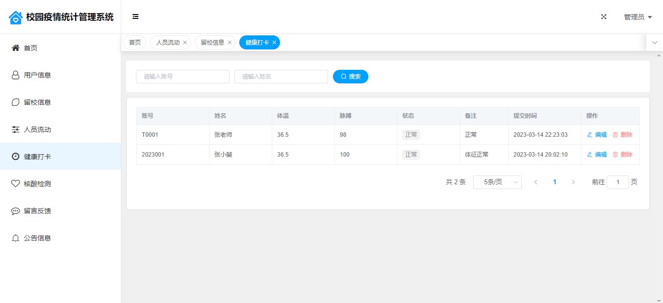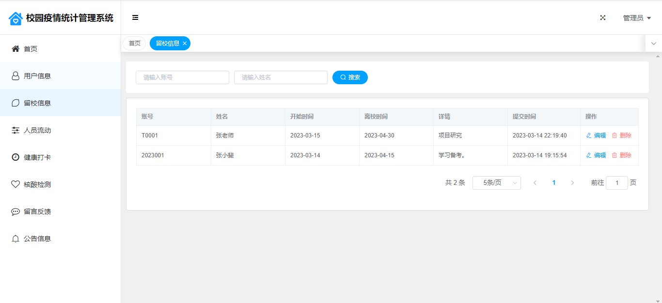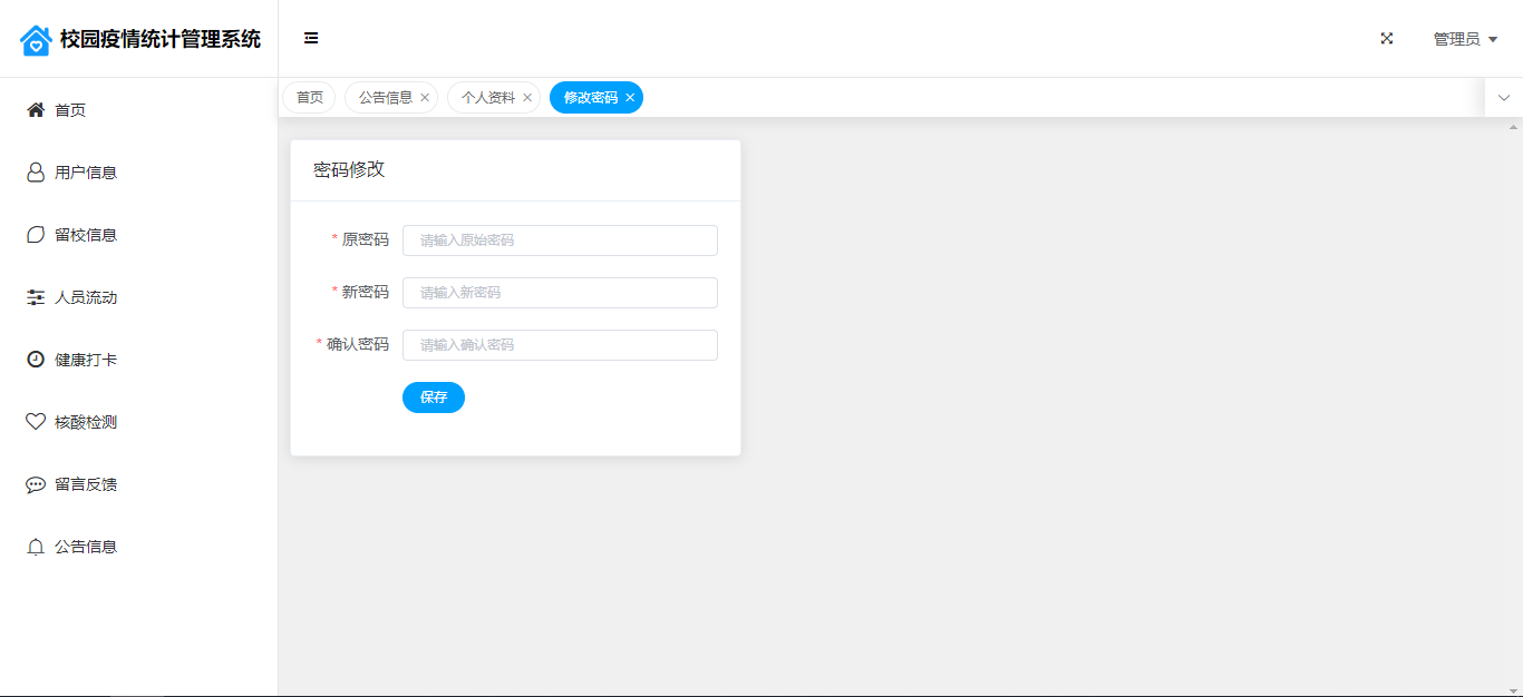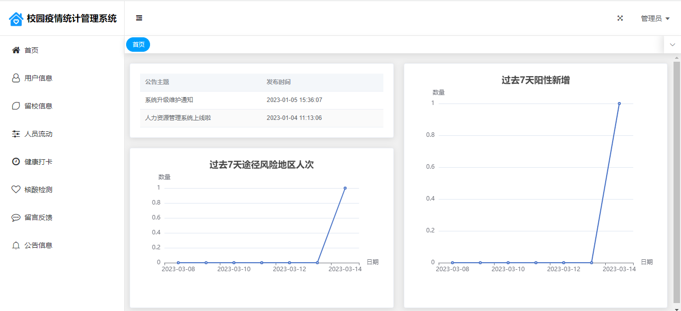 管理员:登录;首页数据统计(图表);用户信息;留校信息;人员流动;健康打卡;核酸检测;留言反馈;公告信息;个人信息;密码修改;