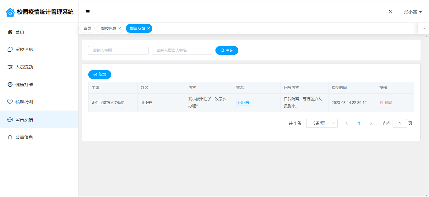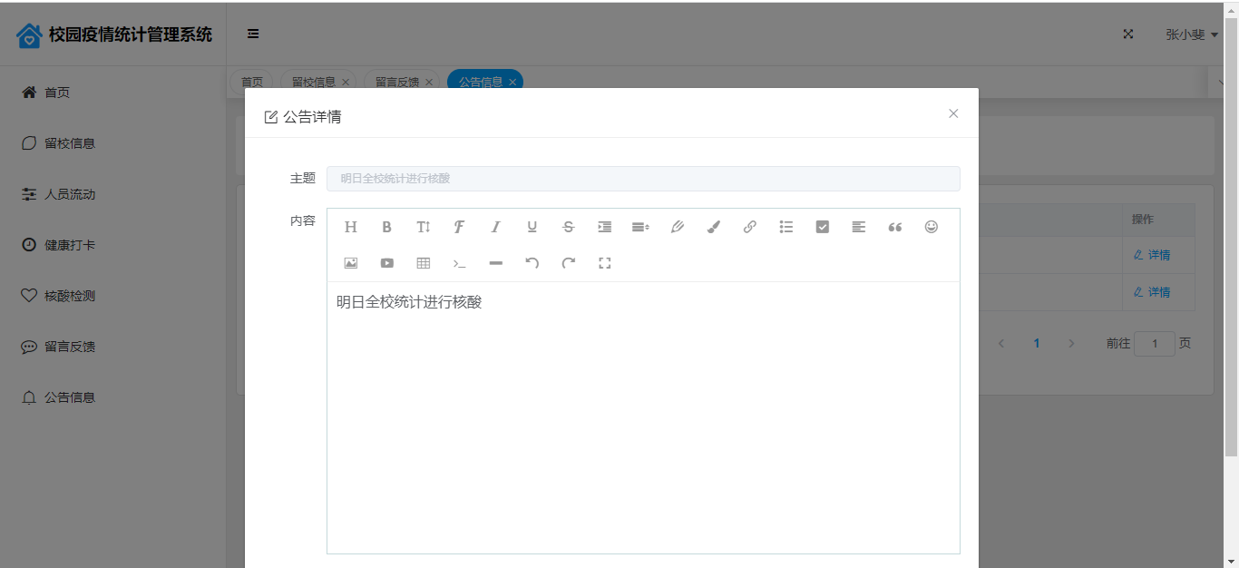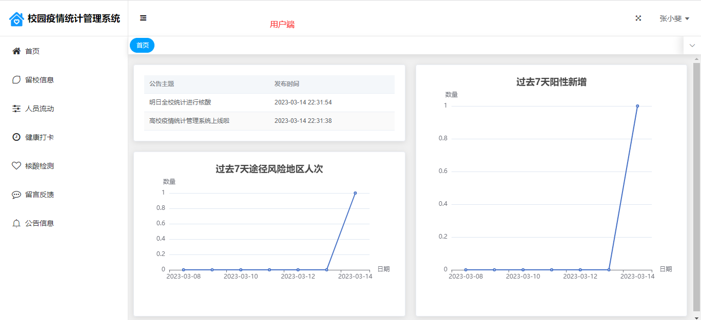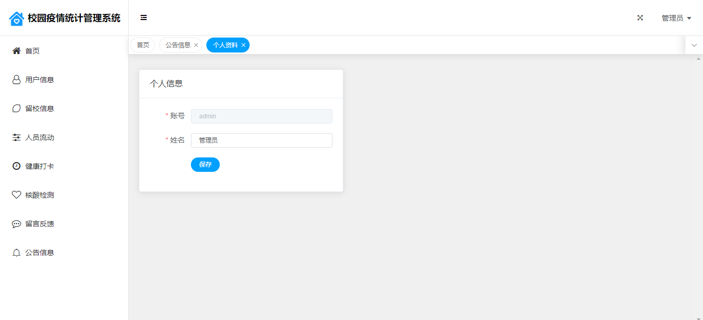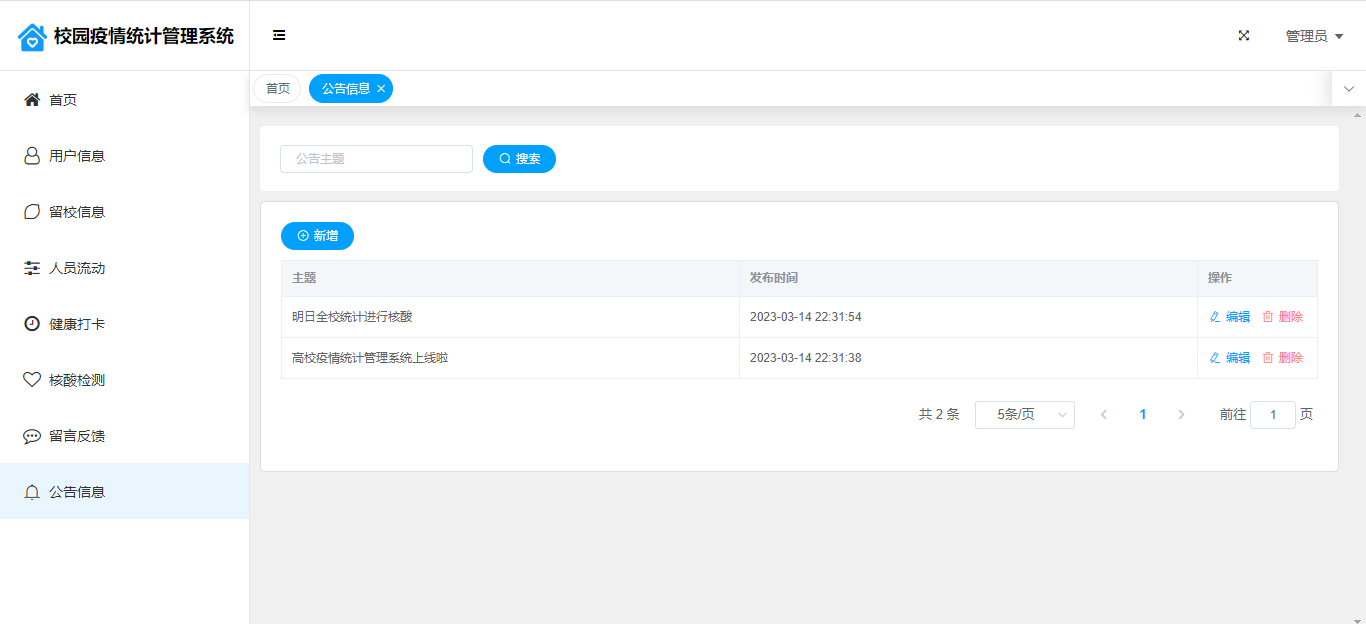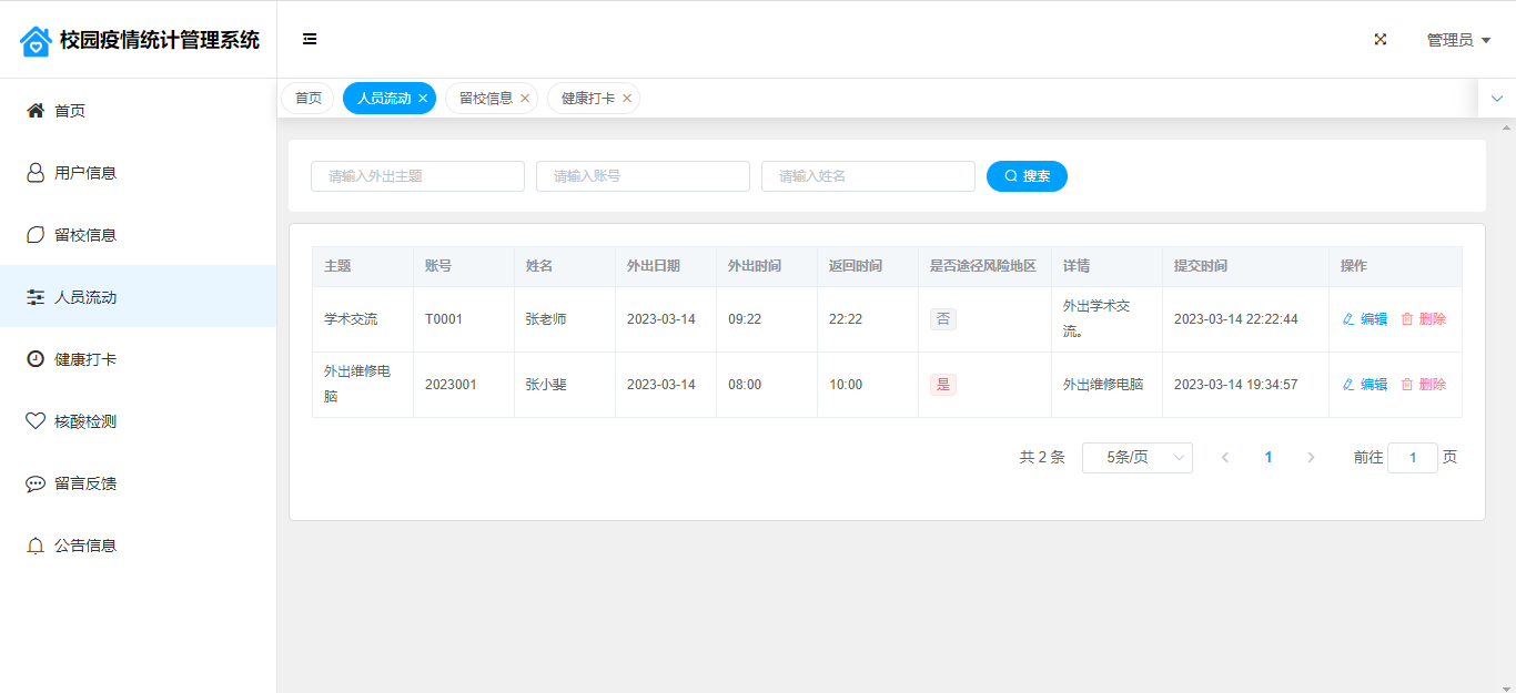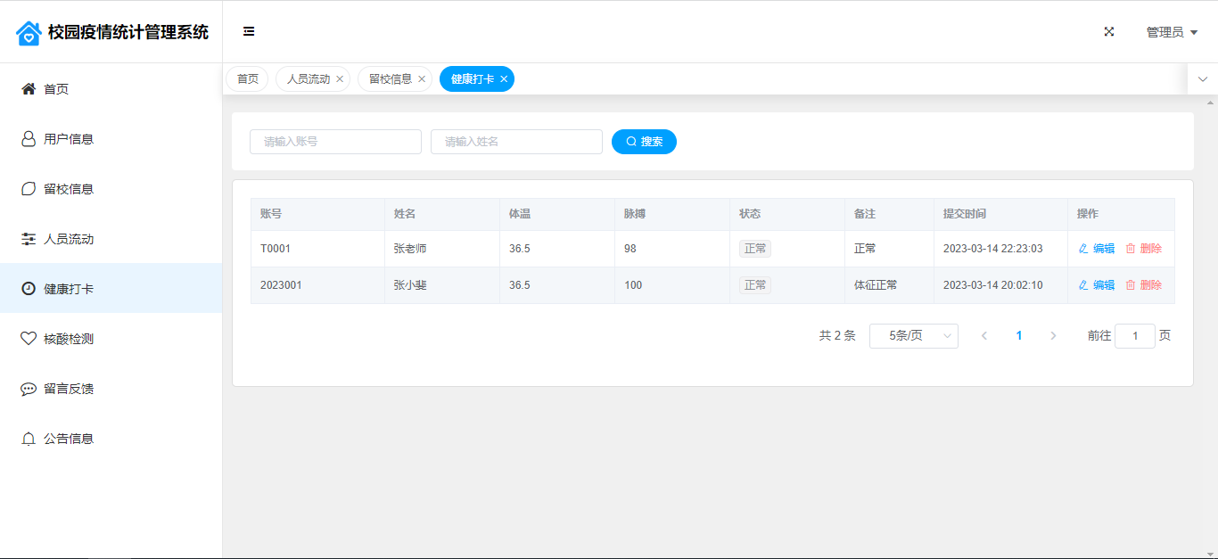 管理员:登录;首页数据统计(图表);用户信息;留校信息;人员流动;健康打卡;核酸检测;留言反馈;公告信息;个人信息;密码修改;