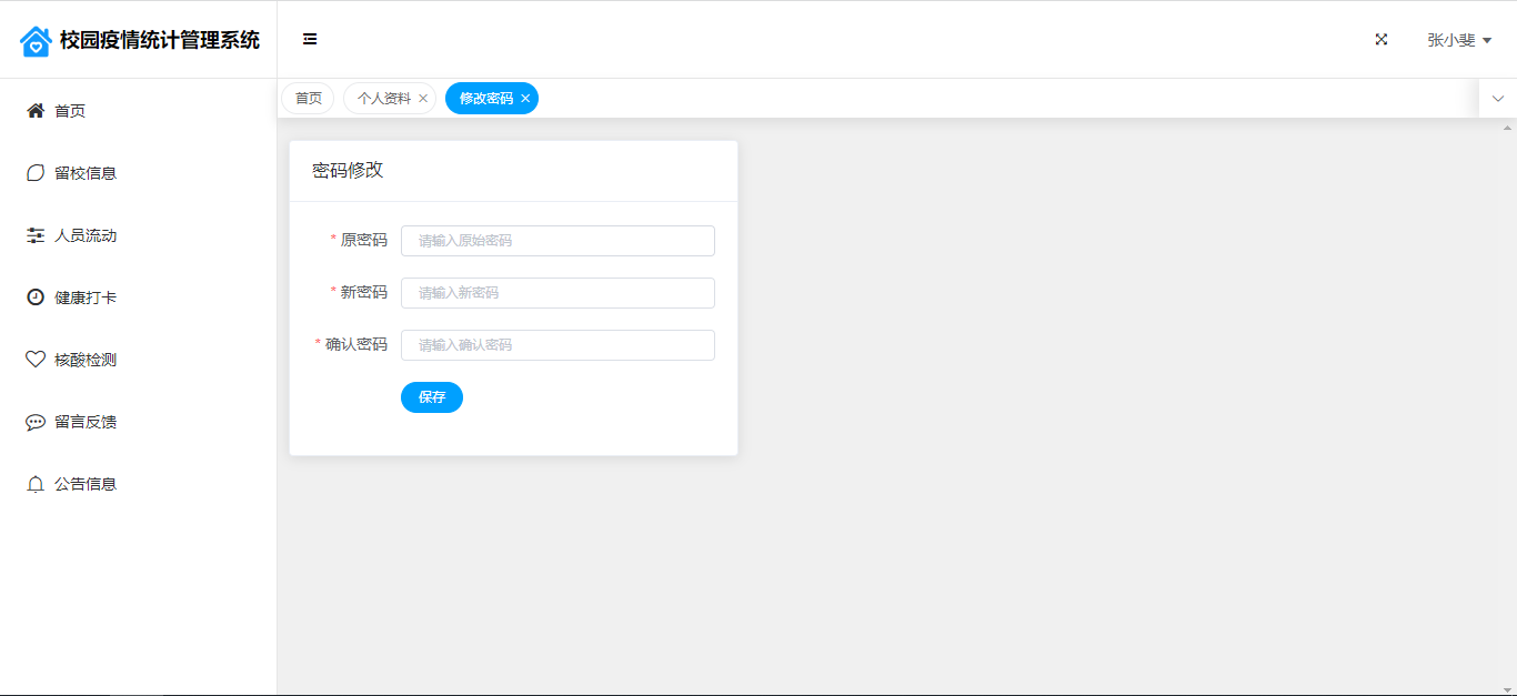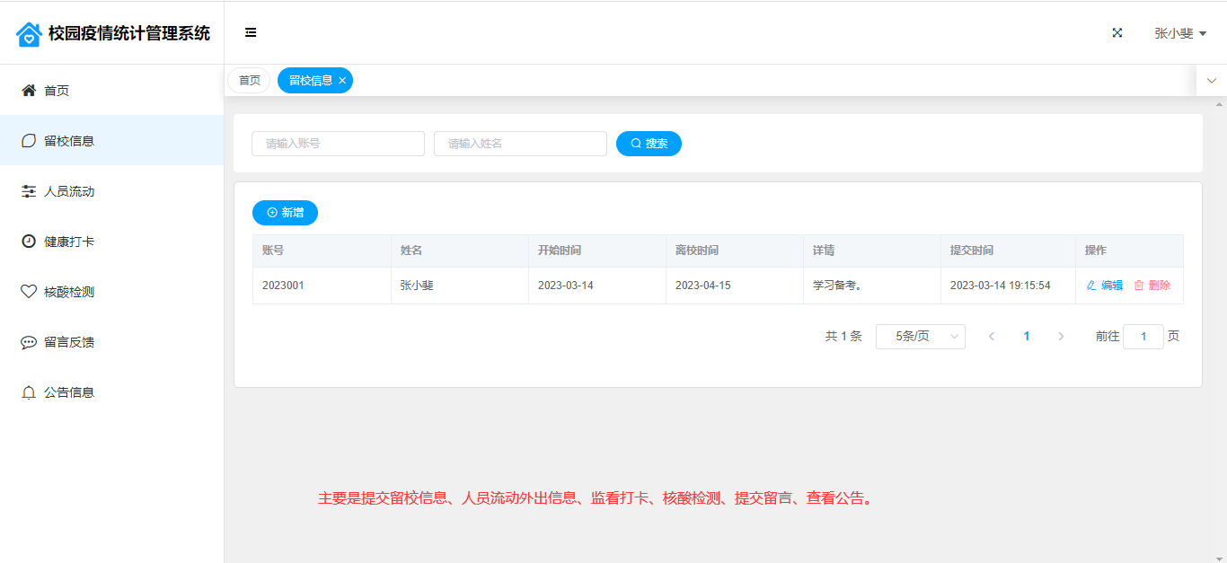 用户:留校信息;人员流动;健康打卡;核酸检测;留言反馈;公告信息;个人信息;密码修改;