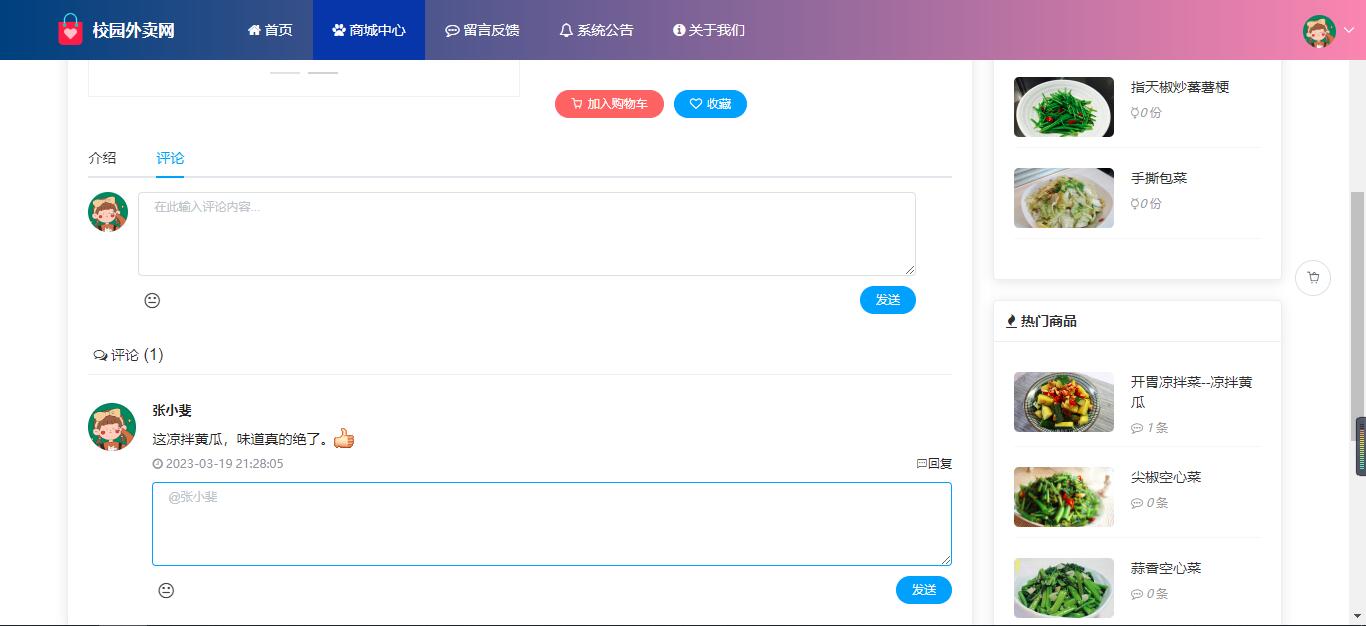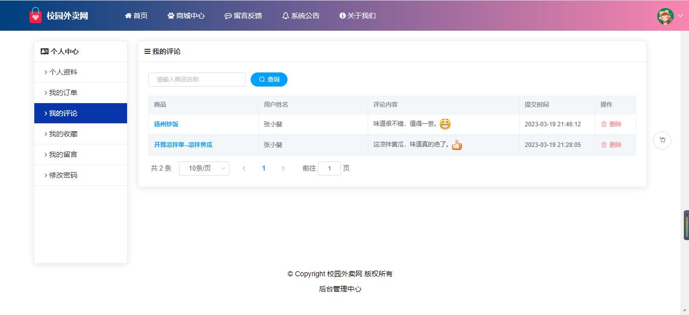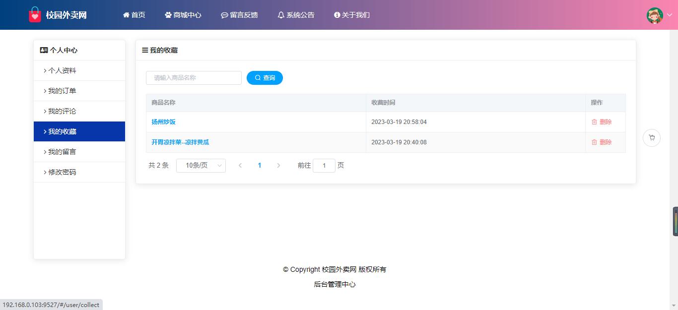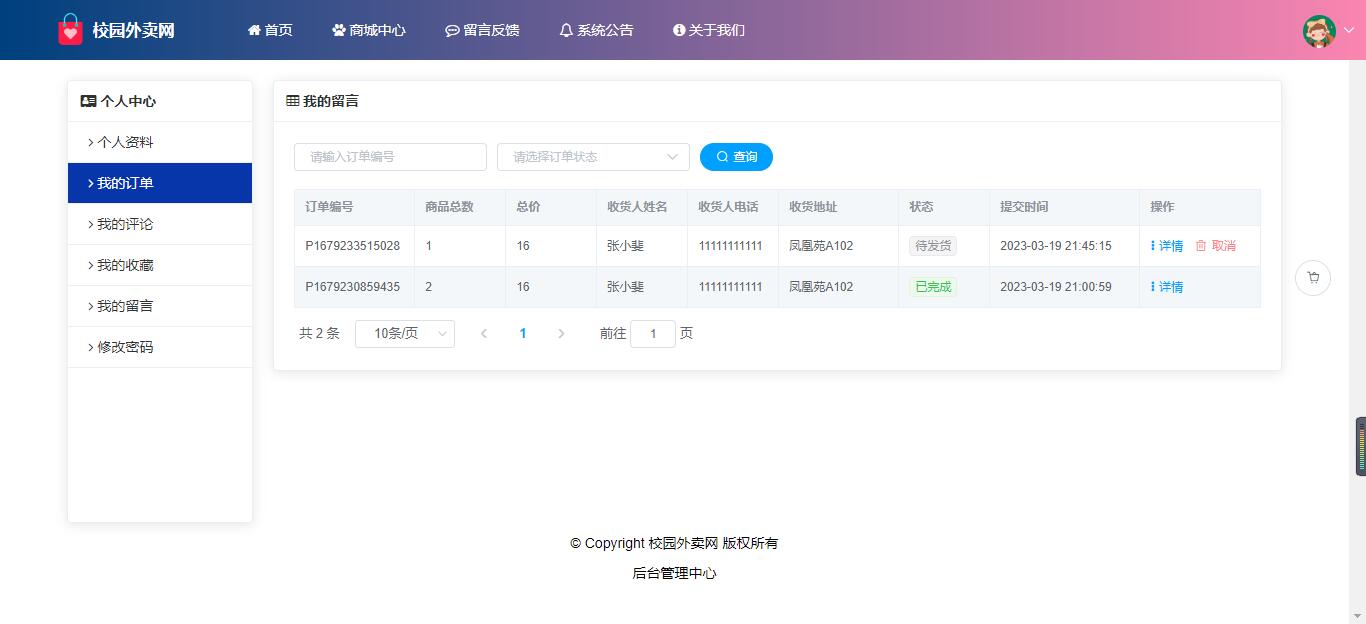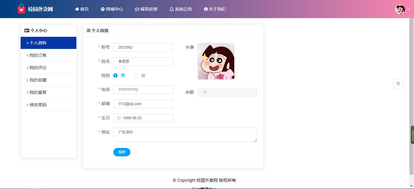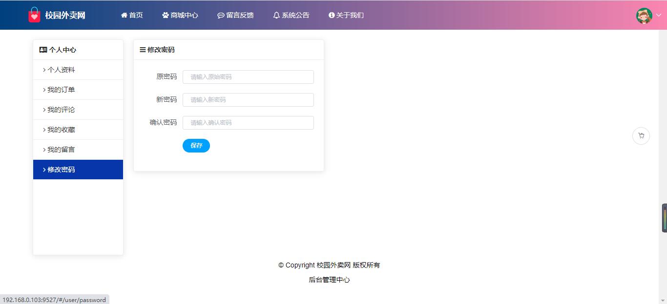 用户还具备个人中心功能:个人资料修改(头像上传);我的订单;我的评论;我的收藏;我的留言;修改密码;