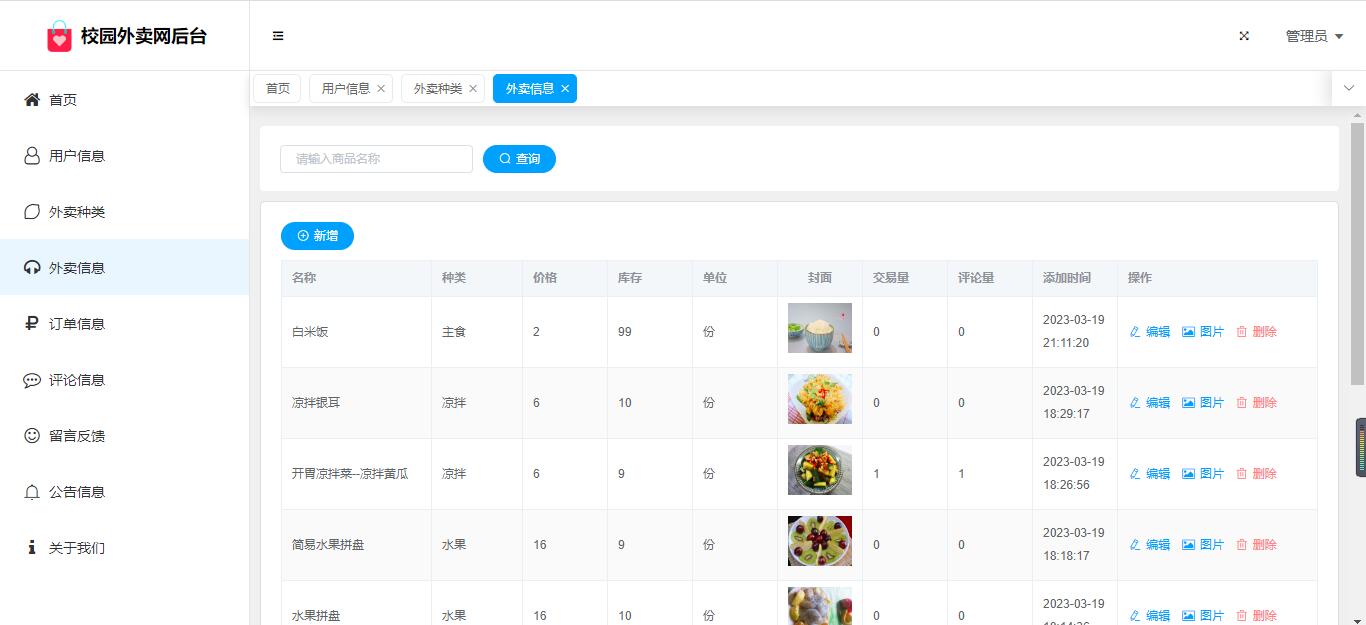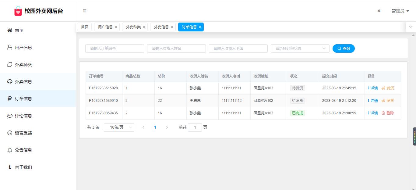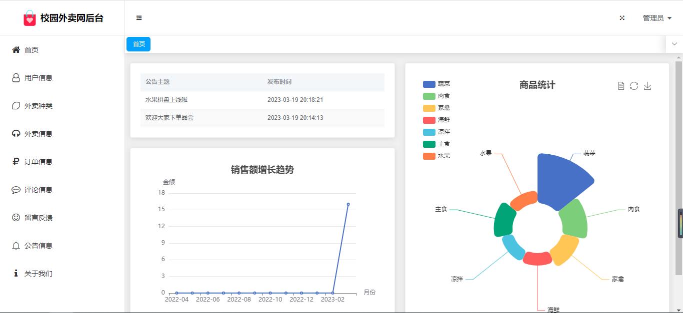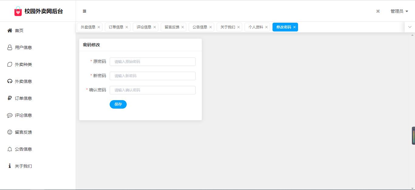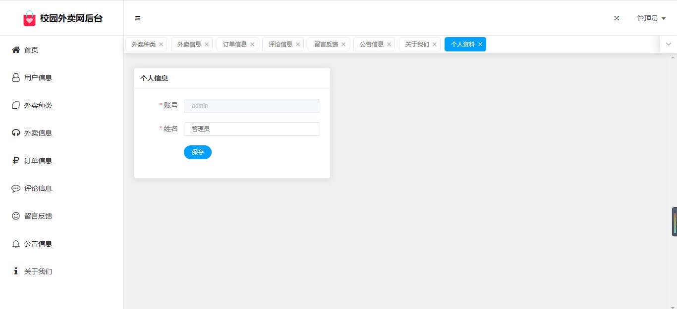 管理员:登录;首页数据统计(图表);用户信息;外卖种类;外卖信息;订单信息(发货);评论信息;留言反馈(回复);公告信息;关于我们;个人信息;密码修改;