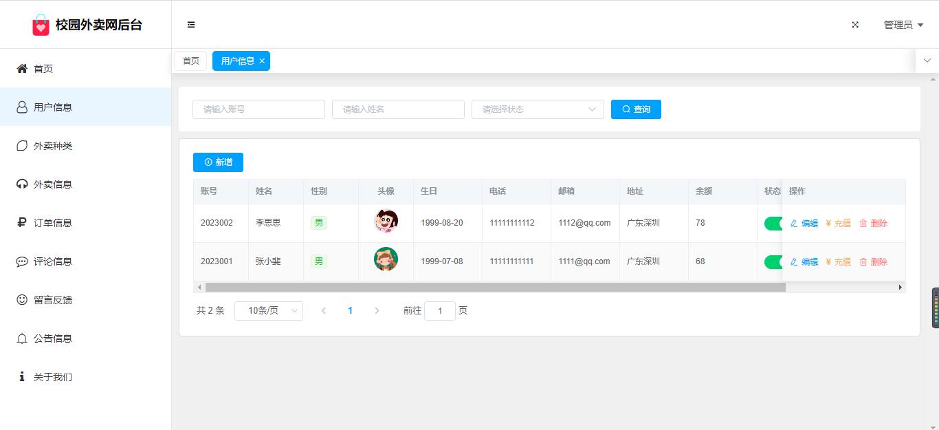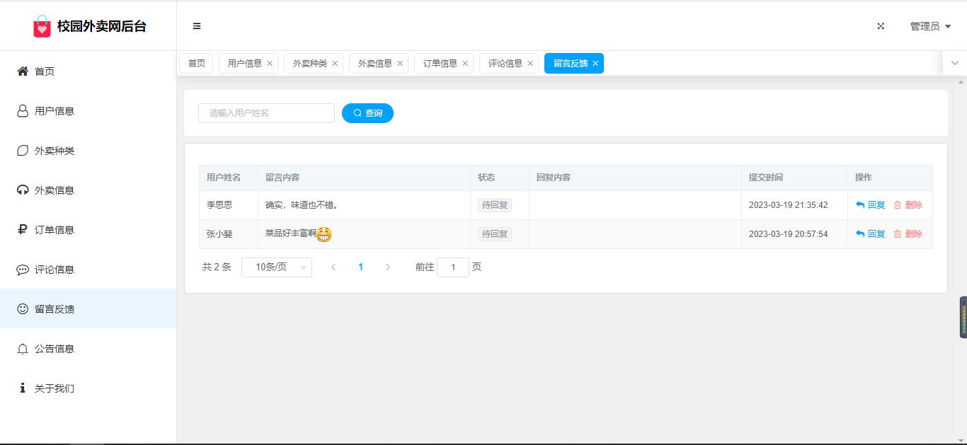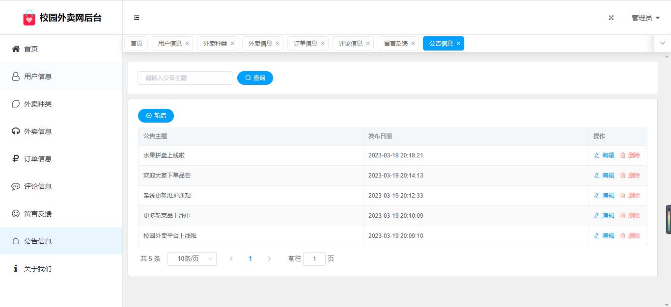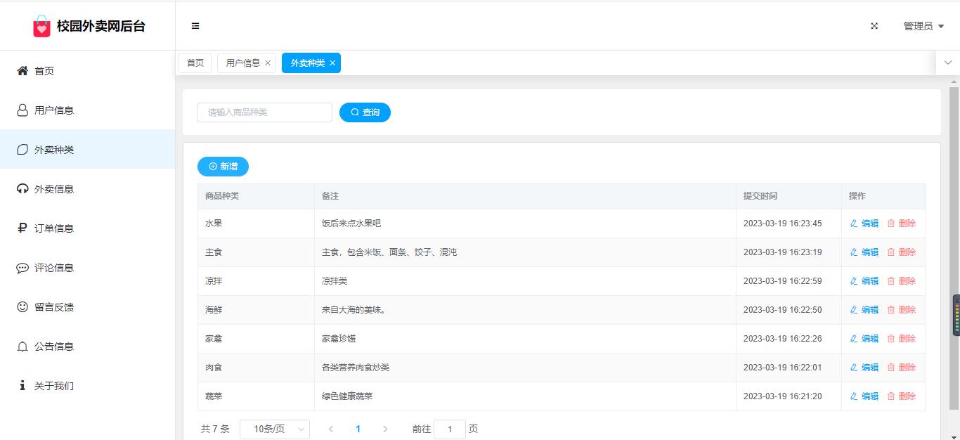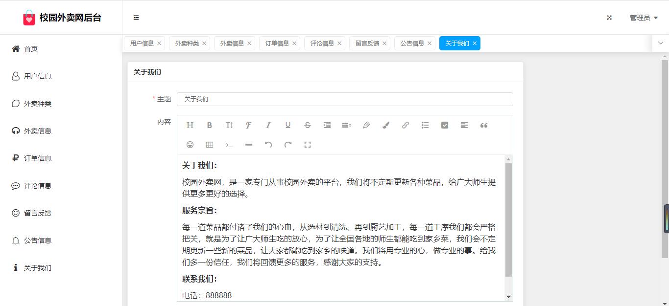 管理员:登录;首页数据统计(图表);用户信息;外卖种类;外卖信息;订单信息(发货);评论信息;留言反馈(回复);公告信息;关于我们;个人信息;密码修改;