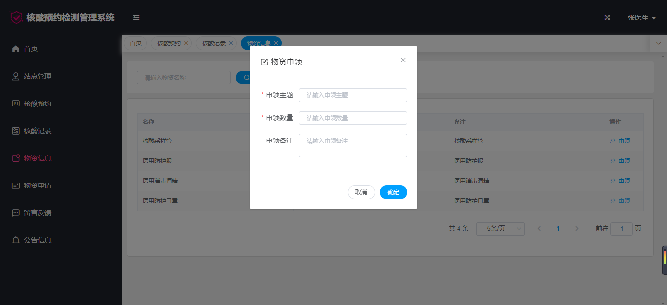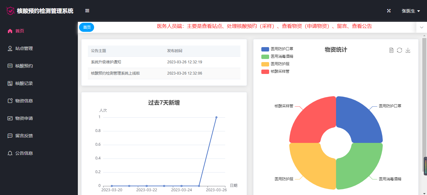 医务人员:登录、首页;站点查看;核酸预约(采样);核酸记录;物资信息;物资申请;留言反馈;公告信息;个人信息;密码修改;