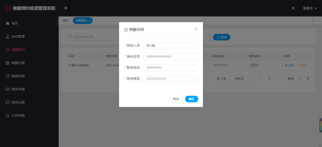 基于SpringBoot+Vue前后端分离的核酸预约检测管理系统,系统包含管理员、医务人员、用户角色,功能如下: