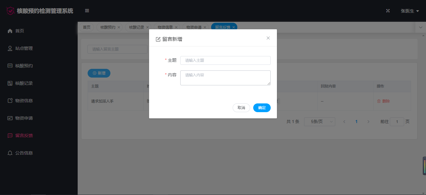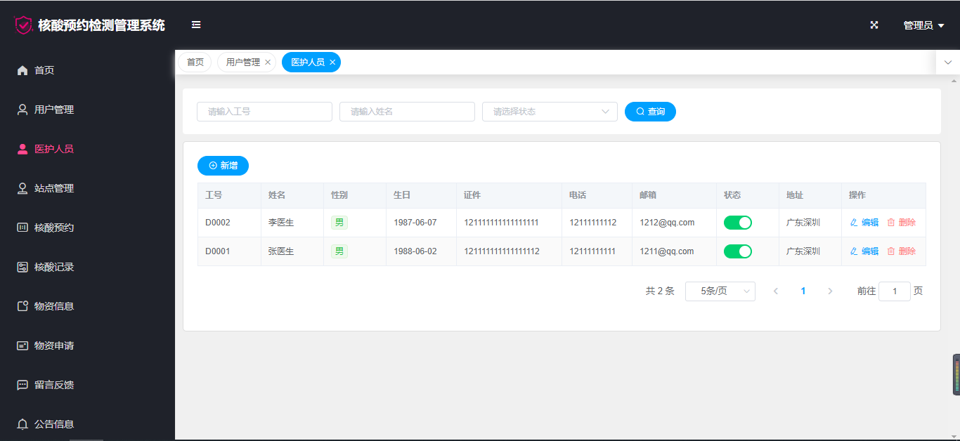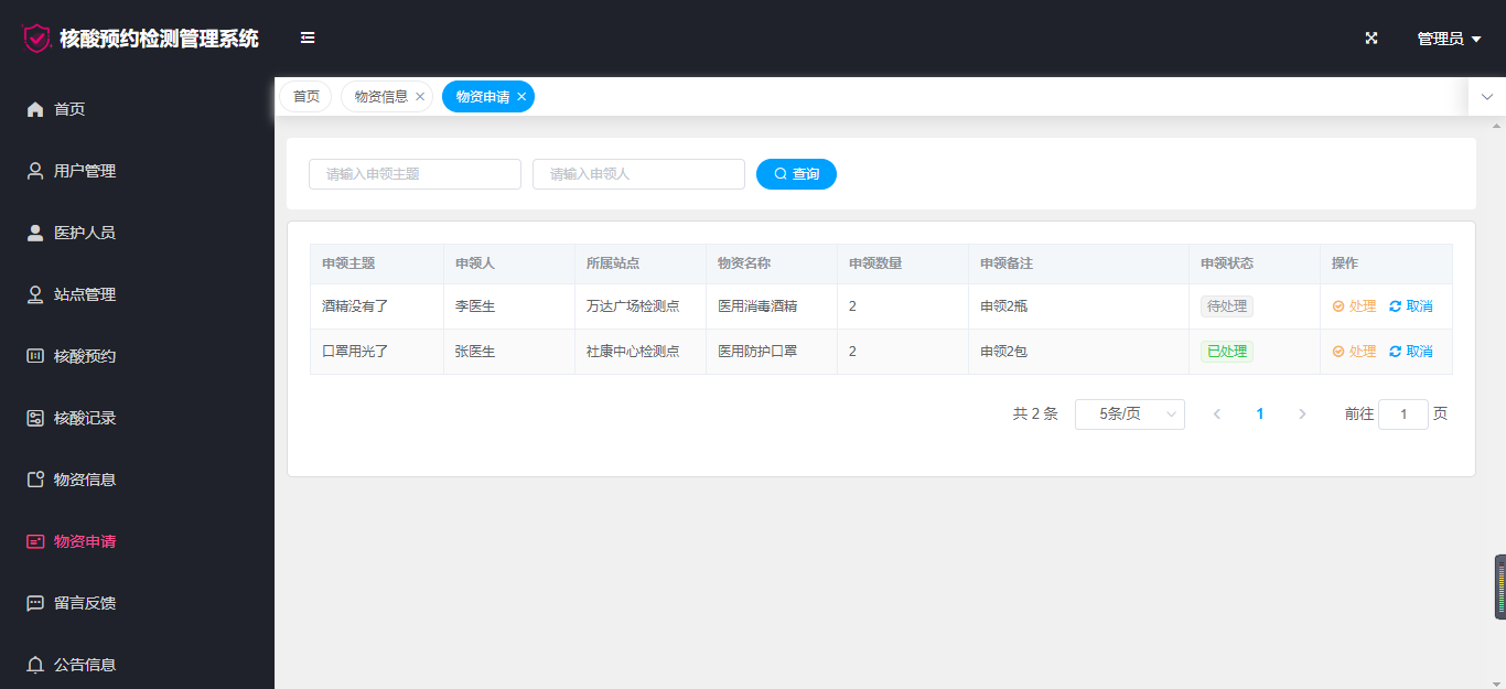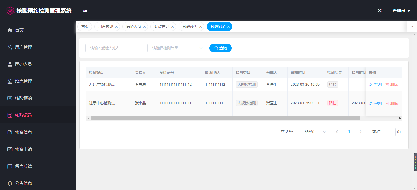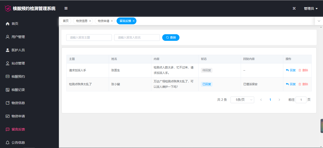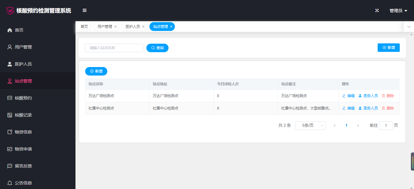 管理员:登录;首页数据统计(图表);用户管理;医务人员管理;站点管理(人员分配);核酸预约;核酸记录(录入检测结果);物资管理;物资申请(处理);留言反馈(回复);公告信息;个人信息;密码修改;