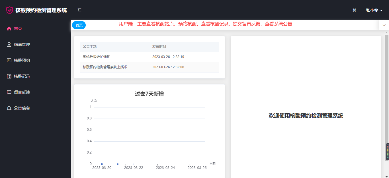 用户:登录系统;首页;站点管理(核酸预约);核酸预约记录(取消预约);核酸记录查看;留言反馈;系统公告;修改个人信息;修改密码。