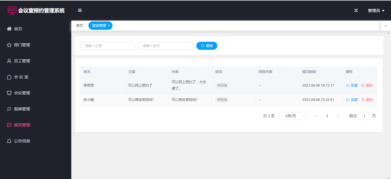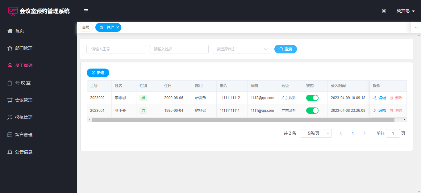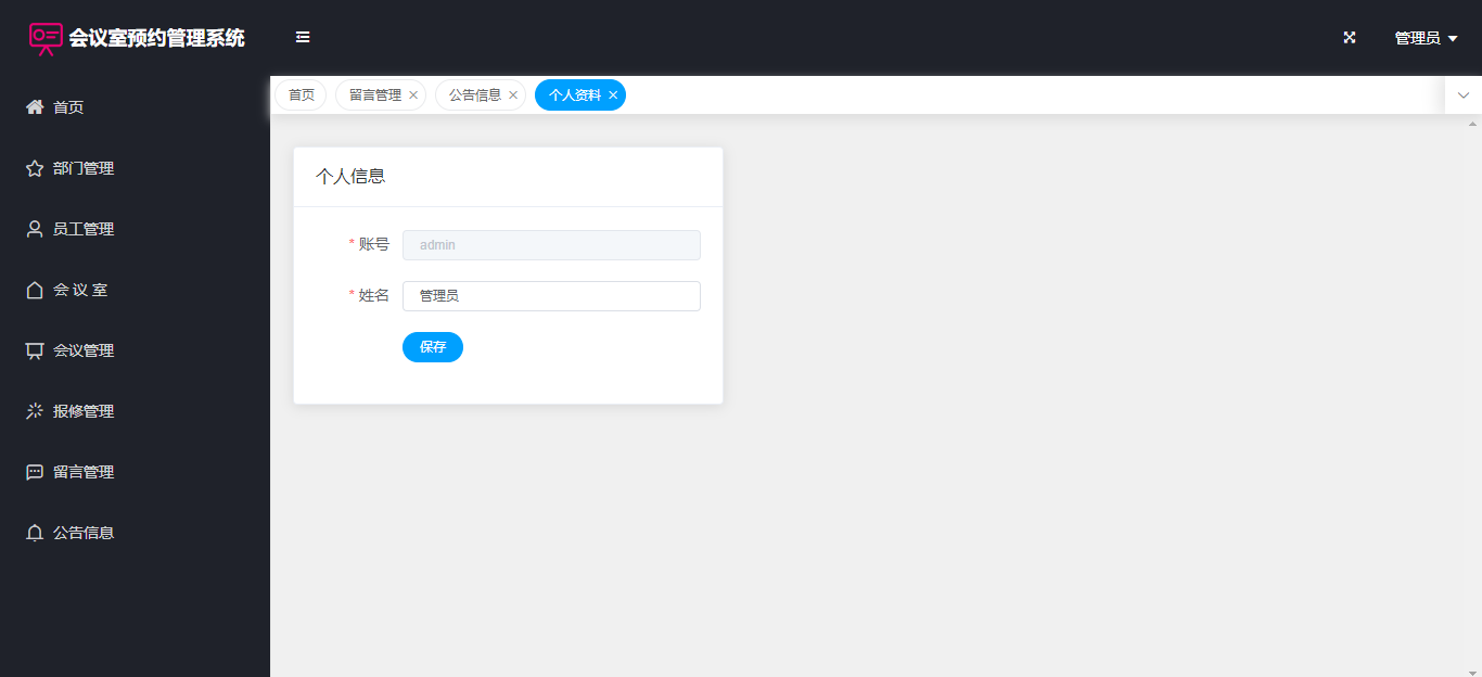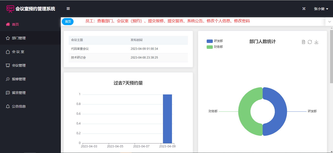 管理员:登录;首页数据统计(表格、饼状图、柱状图、折线图);部门管理;员工管理;会议室管理;会议管理;报修管理;;留言反馈(回复);公告信息;个人信息;密码修改;