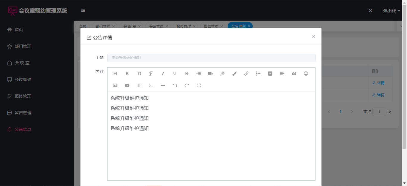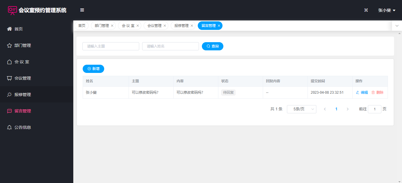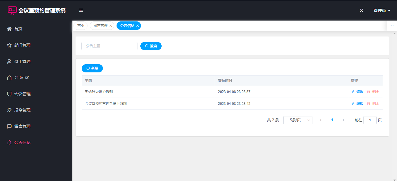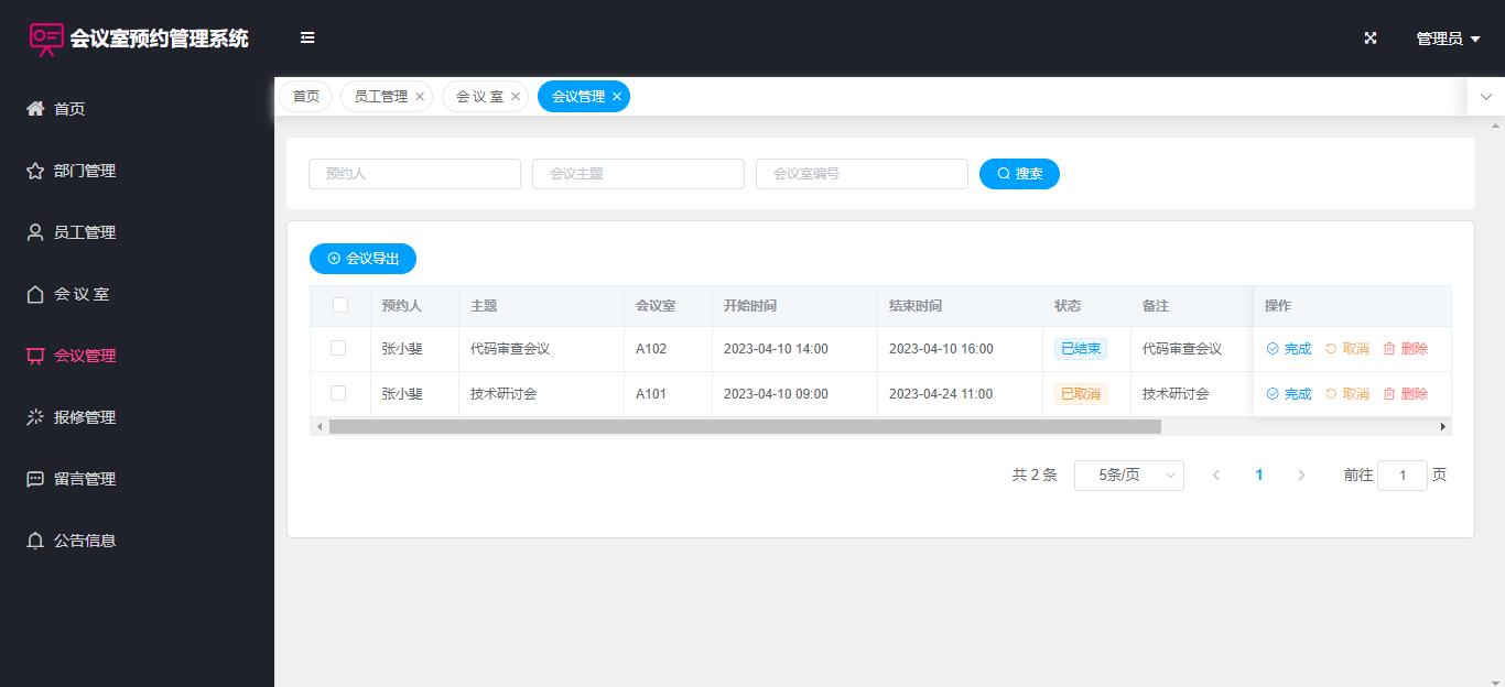 管理员:登录;首页数据统计(表格、饼状图、柱状图、折线图);部门管理;员工管理;会议室管理;会议管理;报修管理;;留言反馈(回复);公告信息;个人信息;密码修改;