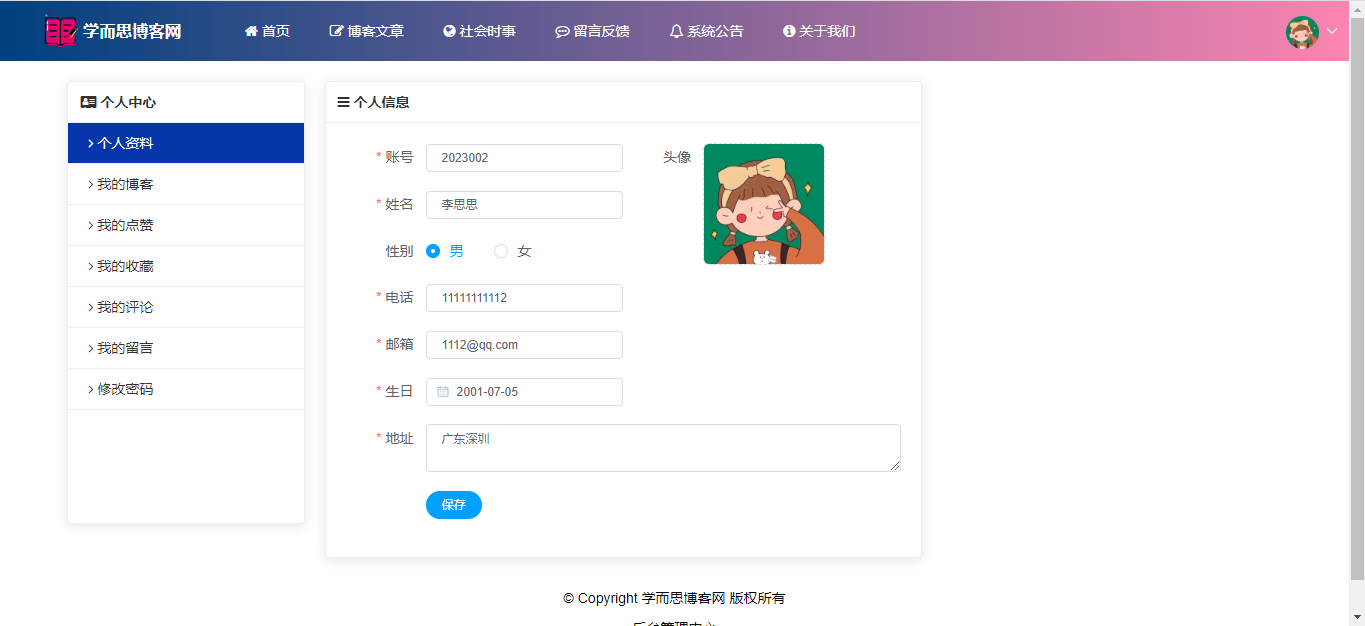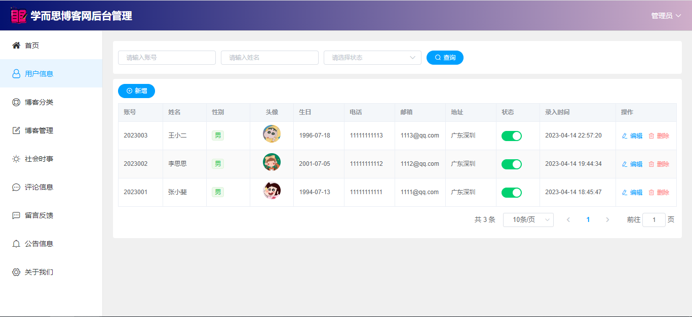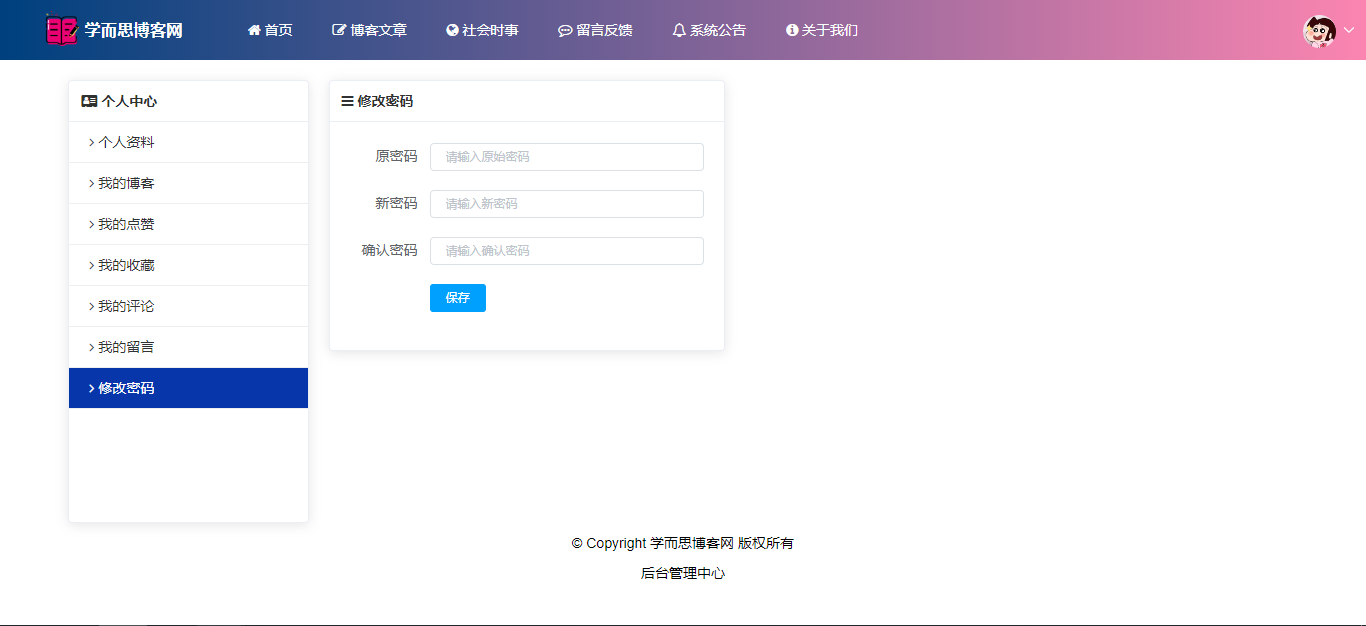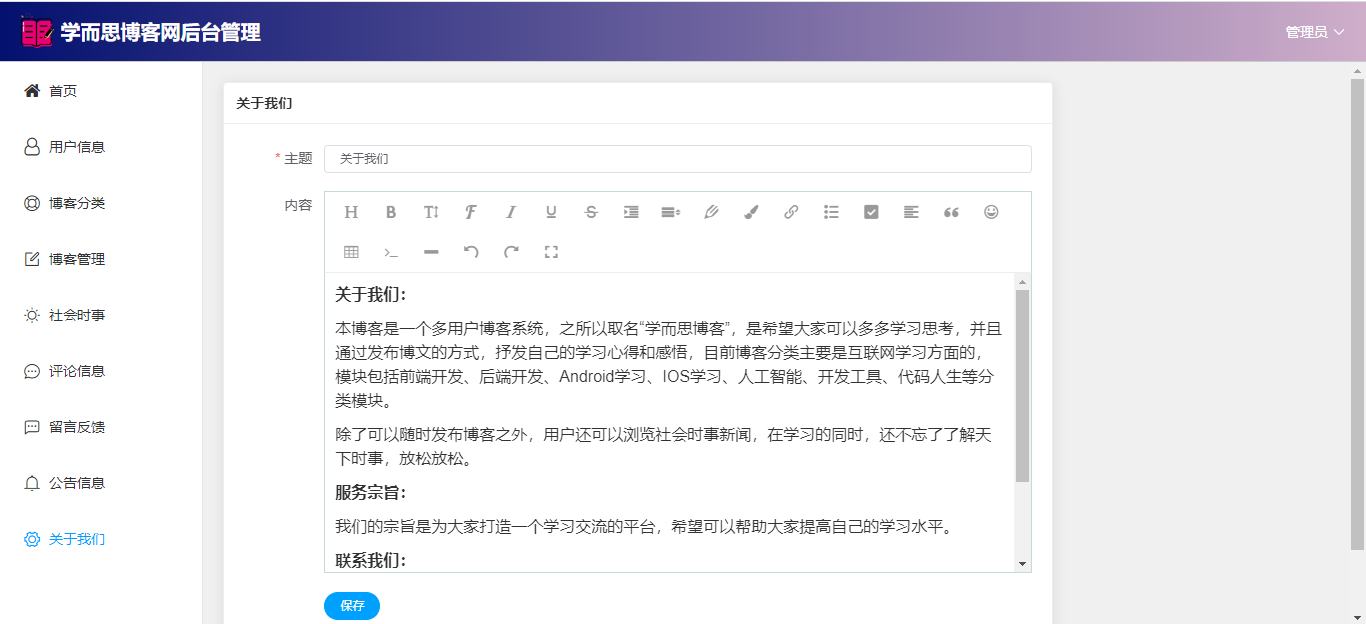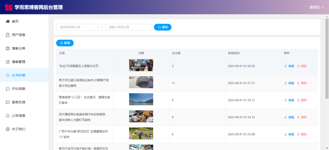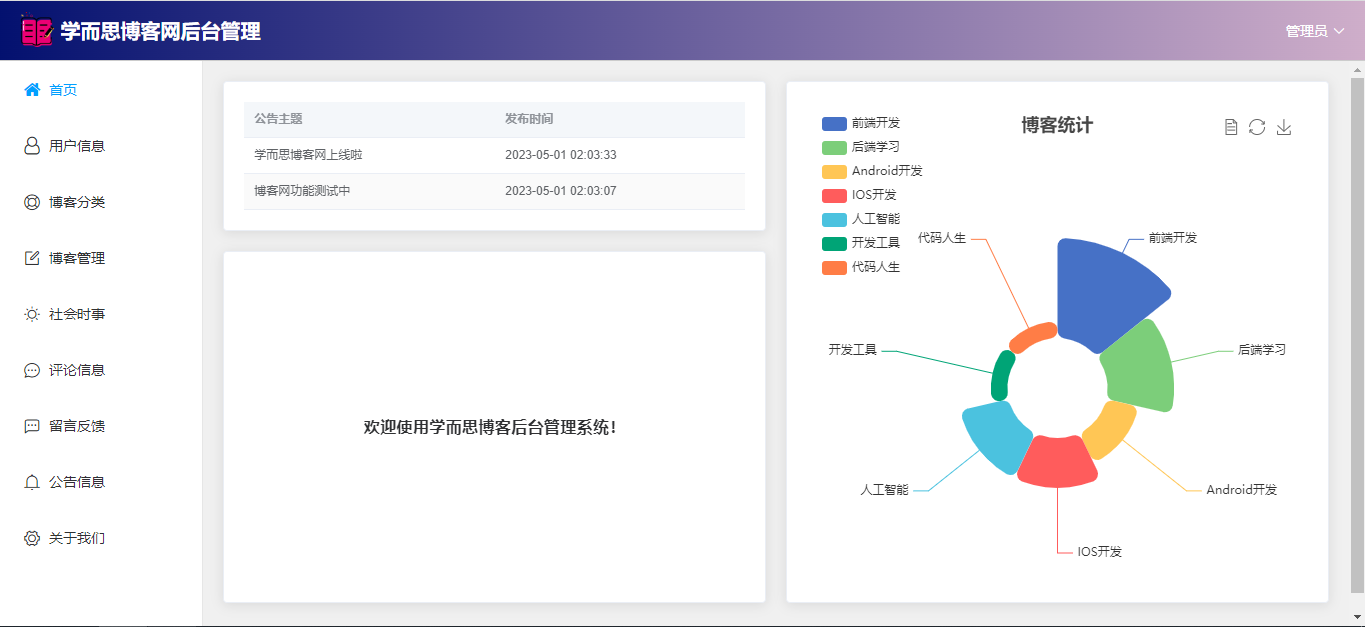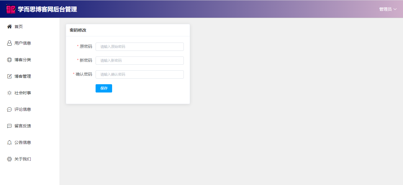 管理员:首页(数据统计);用户管理;博客分类;博客管理(审核);社会时事新闻;评论信息;留言反馈(回复);公告信息;关于我们;个人信息;密码修改;