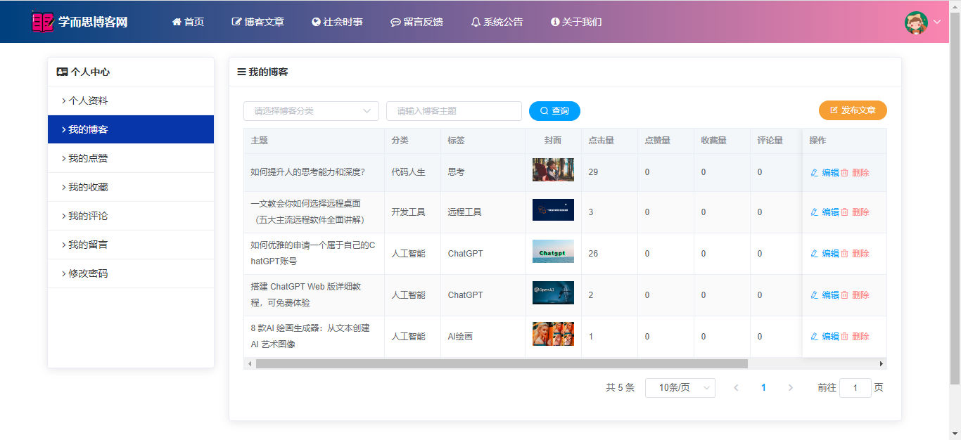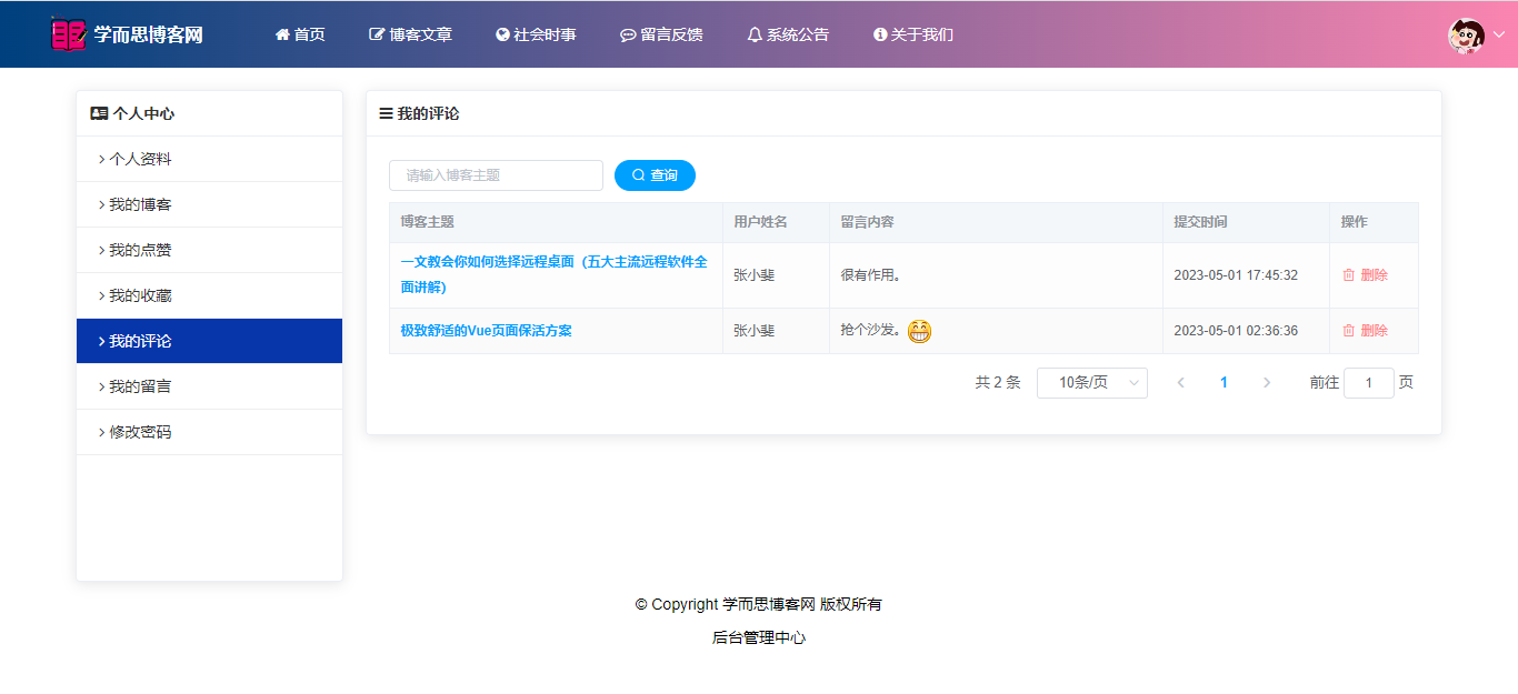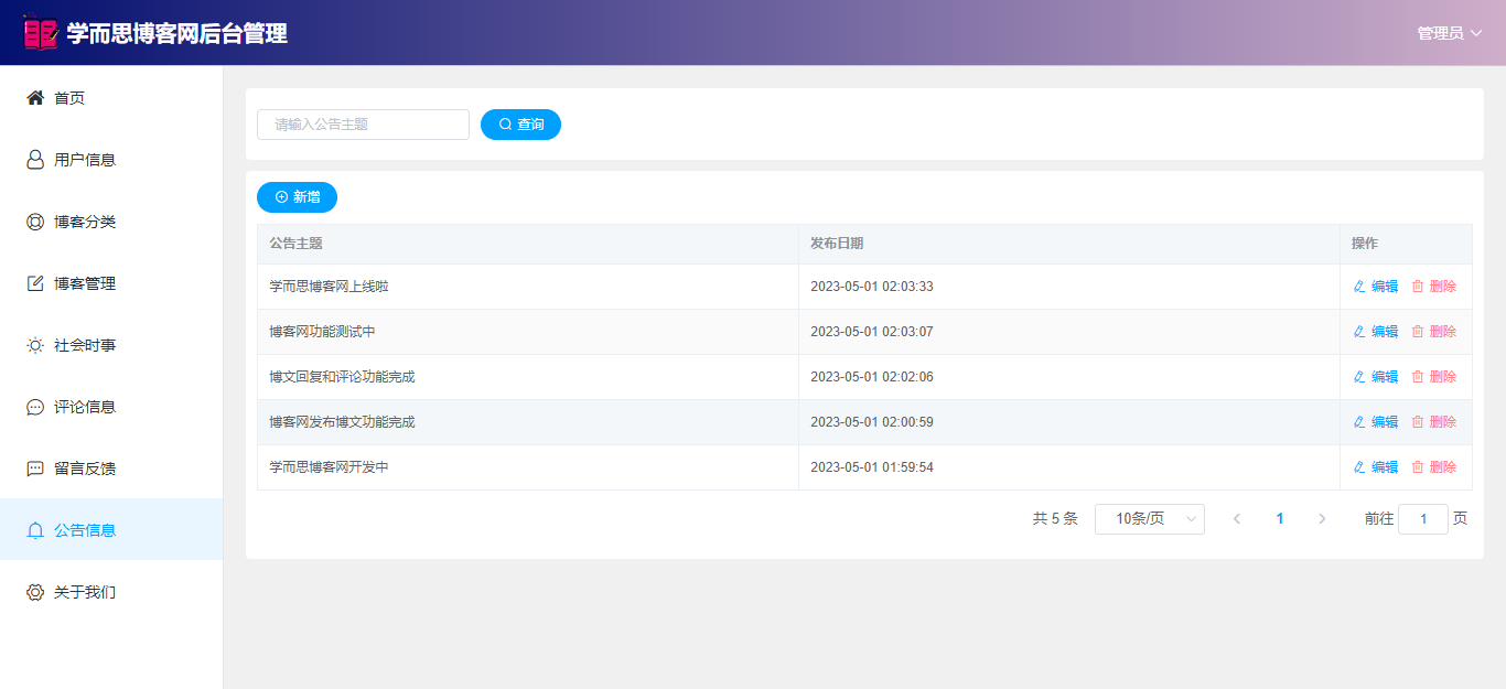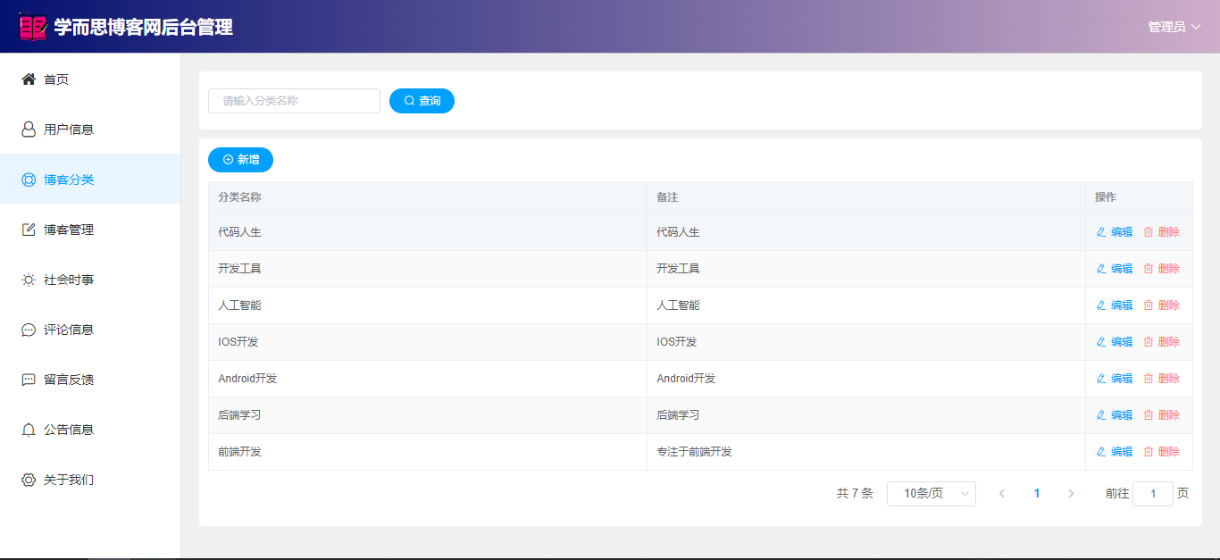 基于SpringBoot+Vue前后端分离的学而思博客网站系统,系统包含管理员、用户角色,功能如下: