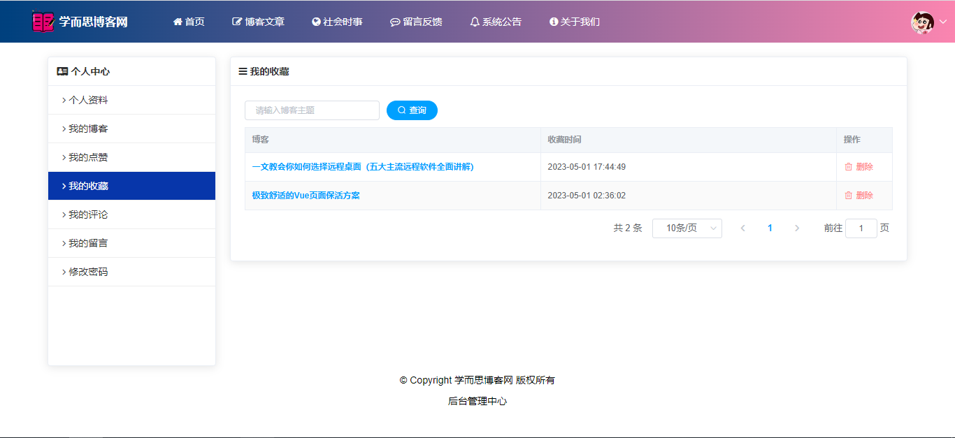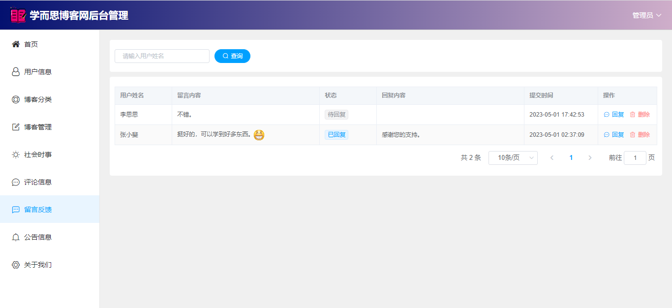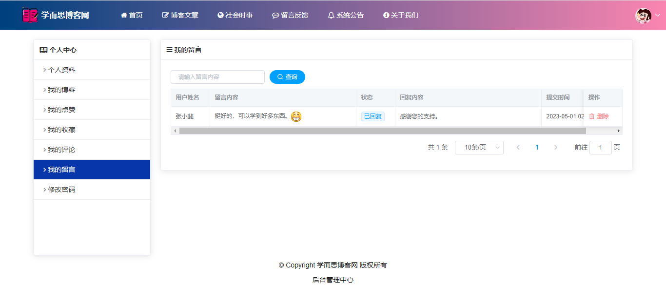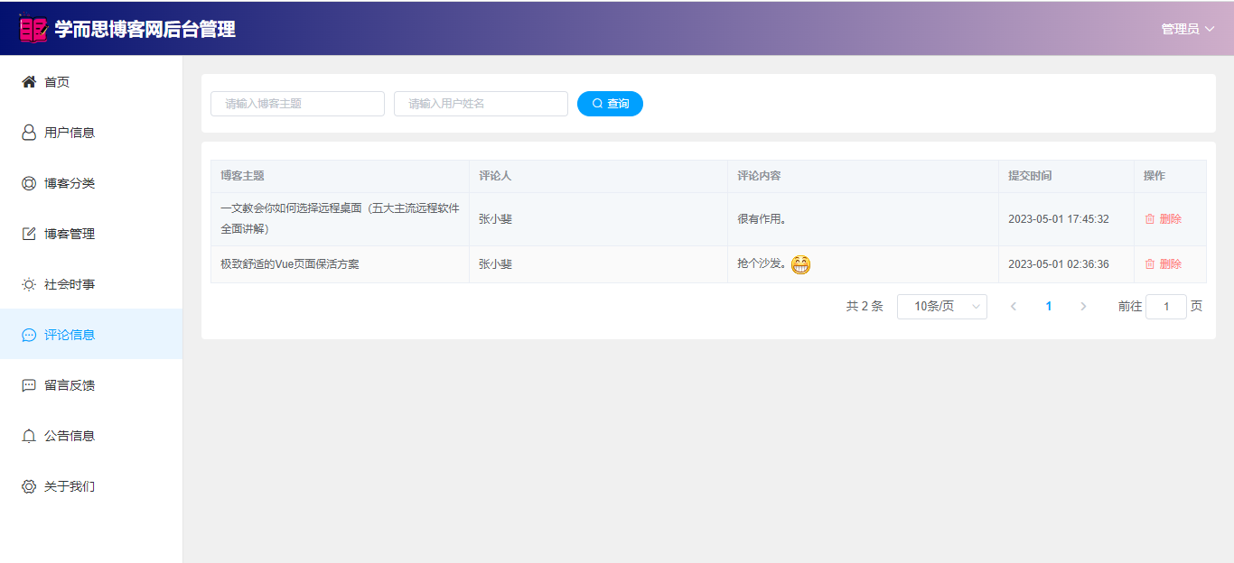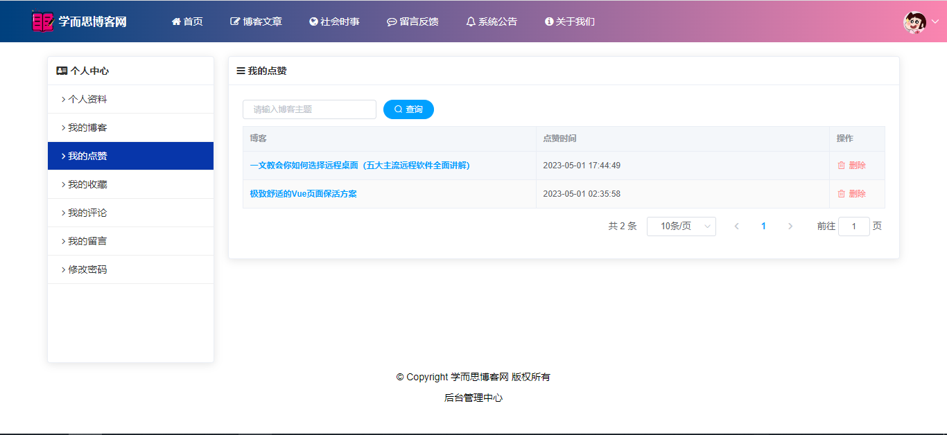 基于SpringBoot+Vue前后端分离的学而思博客网站系统,系统包含管理员、用户角色,功能如下: