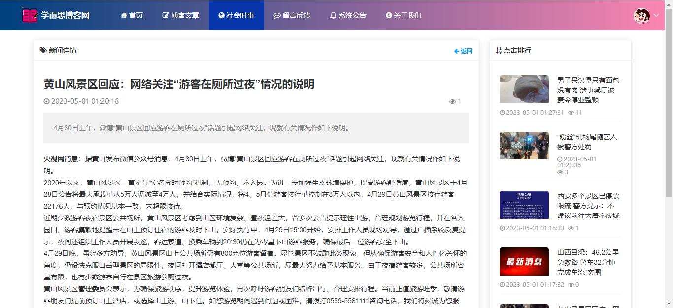 用户:注册、登录系统;首页;博客文章(分类查看、评论、点赞、收藏);社会时事新闻;留言管理;系统公告;关于我们;个人信息;密码修改。