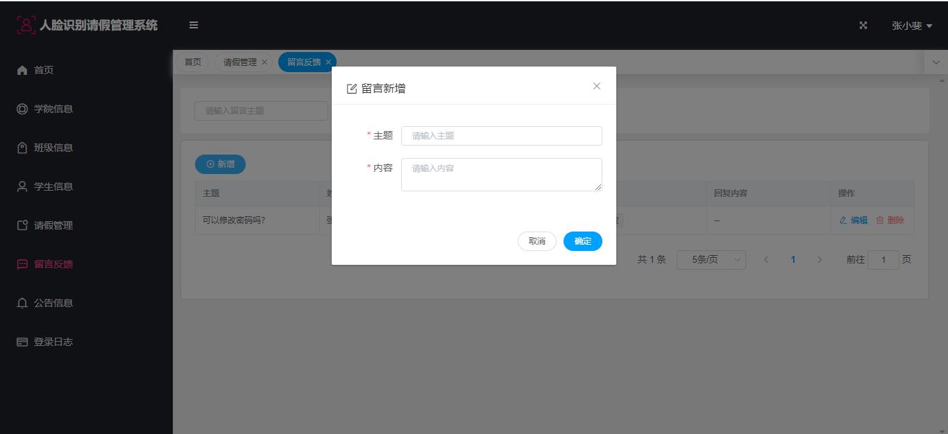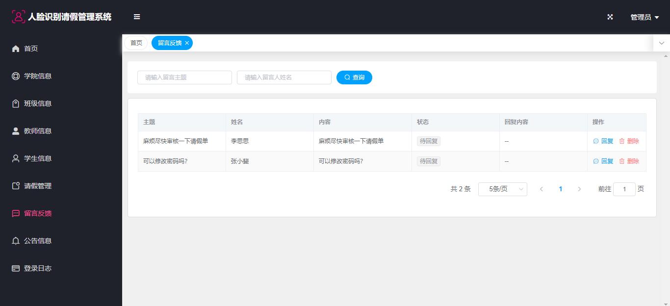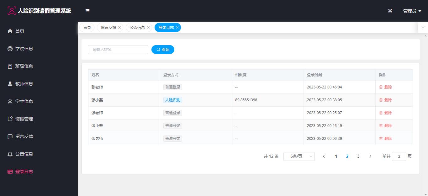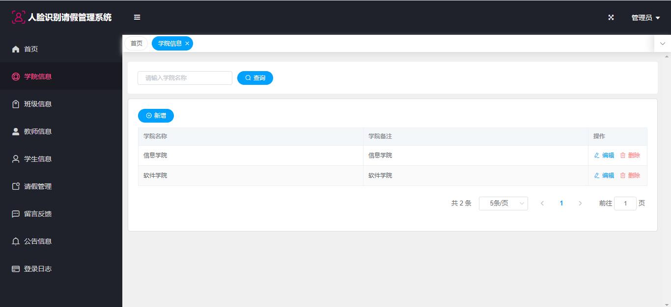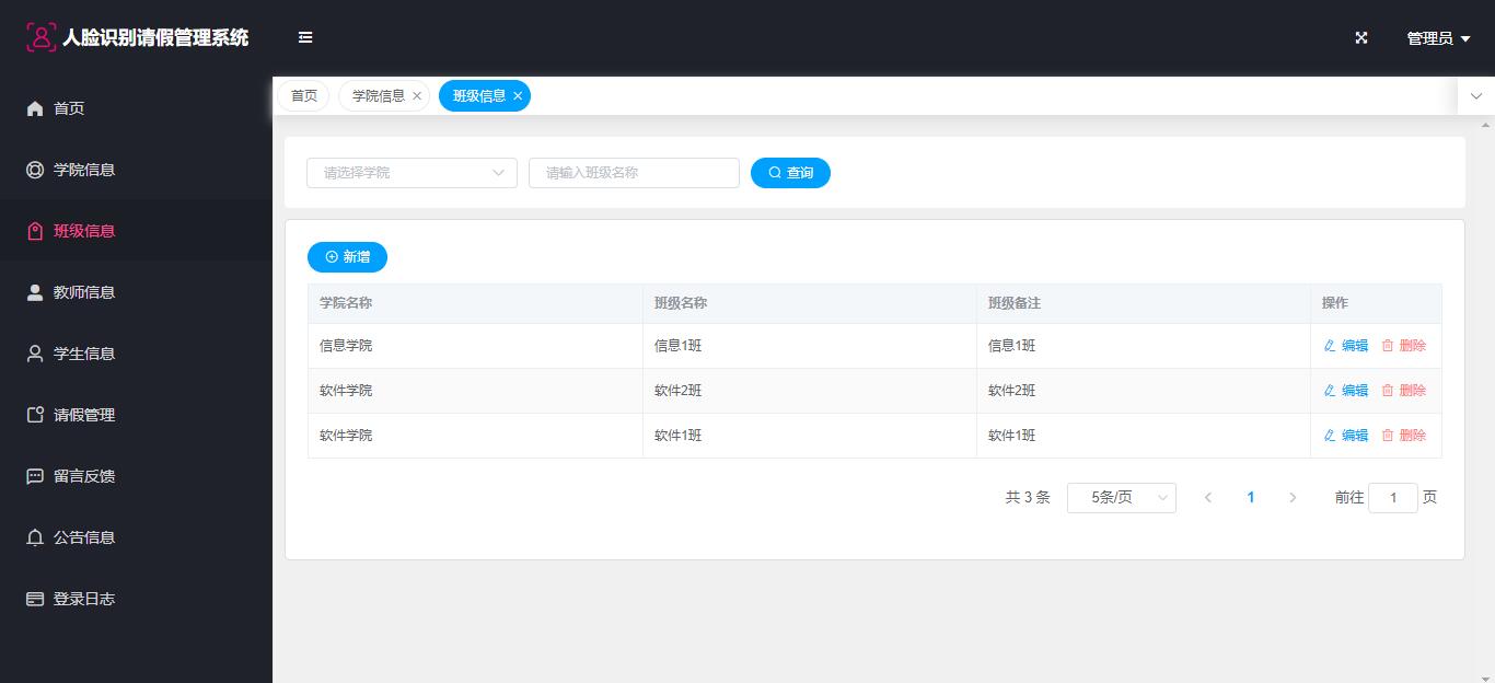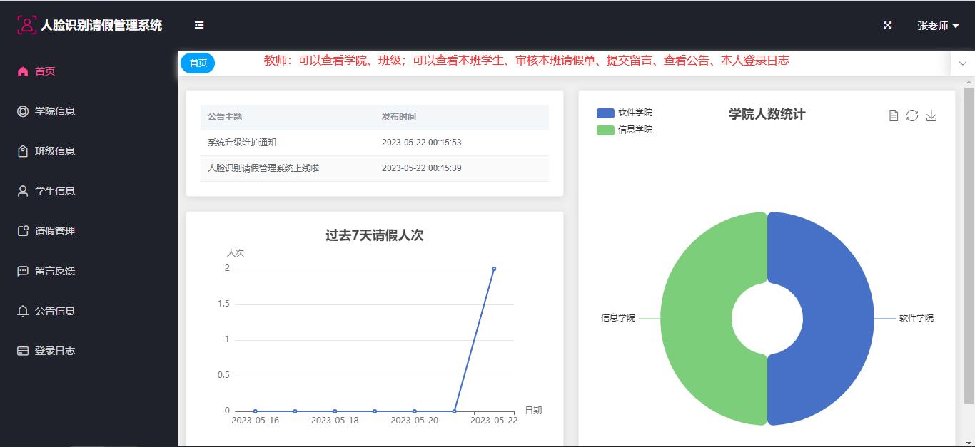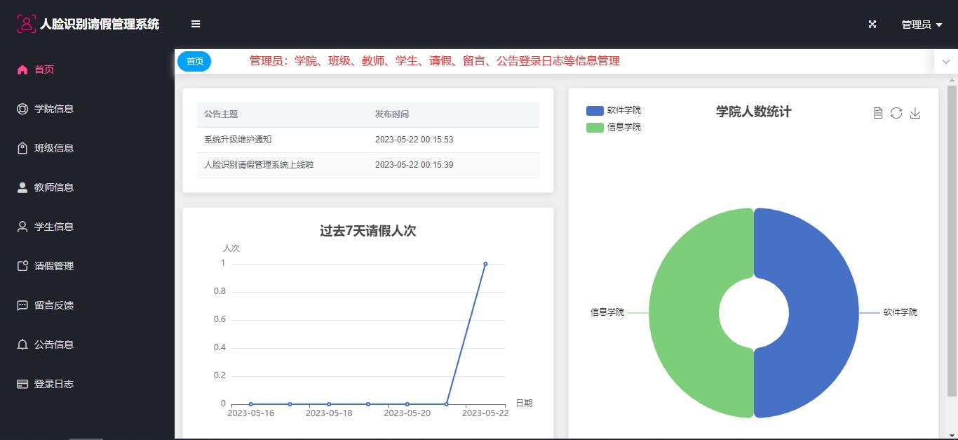 管理员:首页(数据统计);学院信息;班级信息;教师信息;学生信息;请假管理;留言反馈;公告信息;登录日志;个人信息;密码修改;