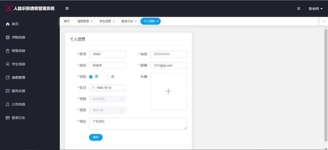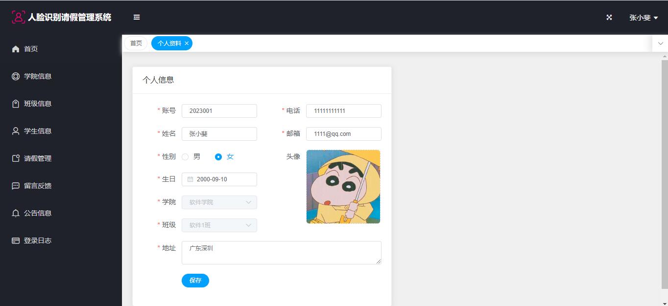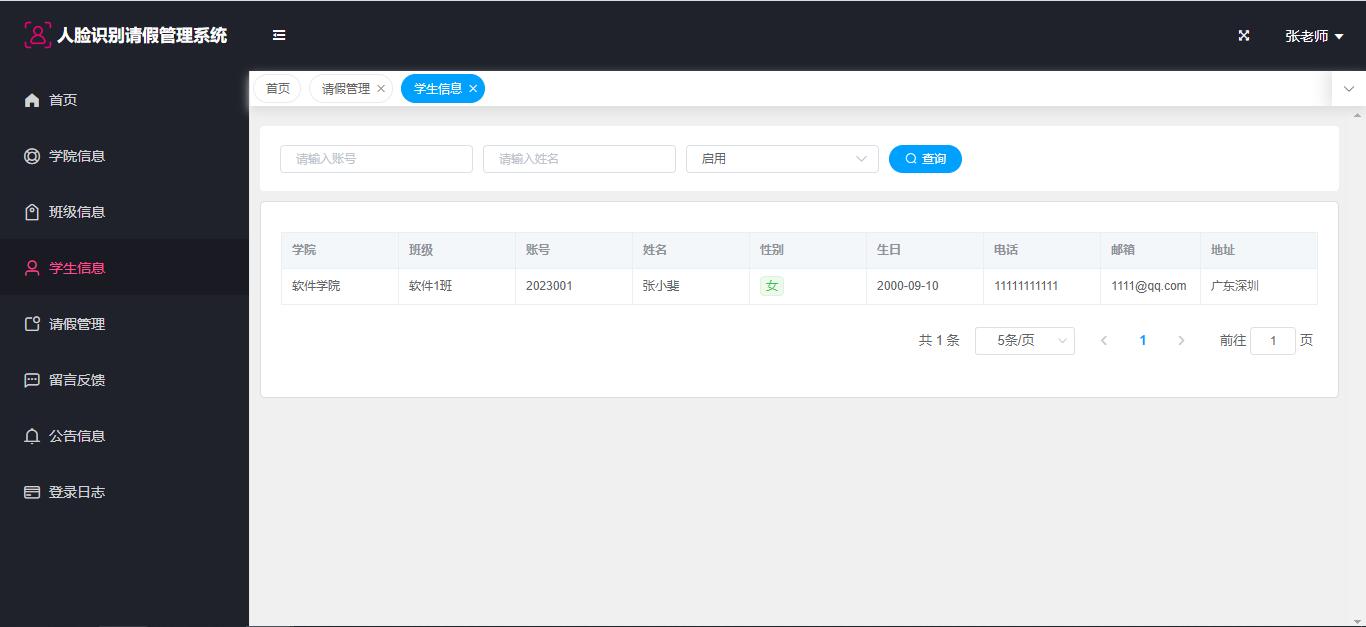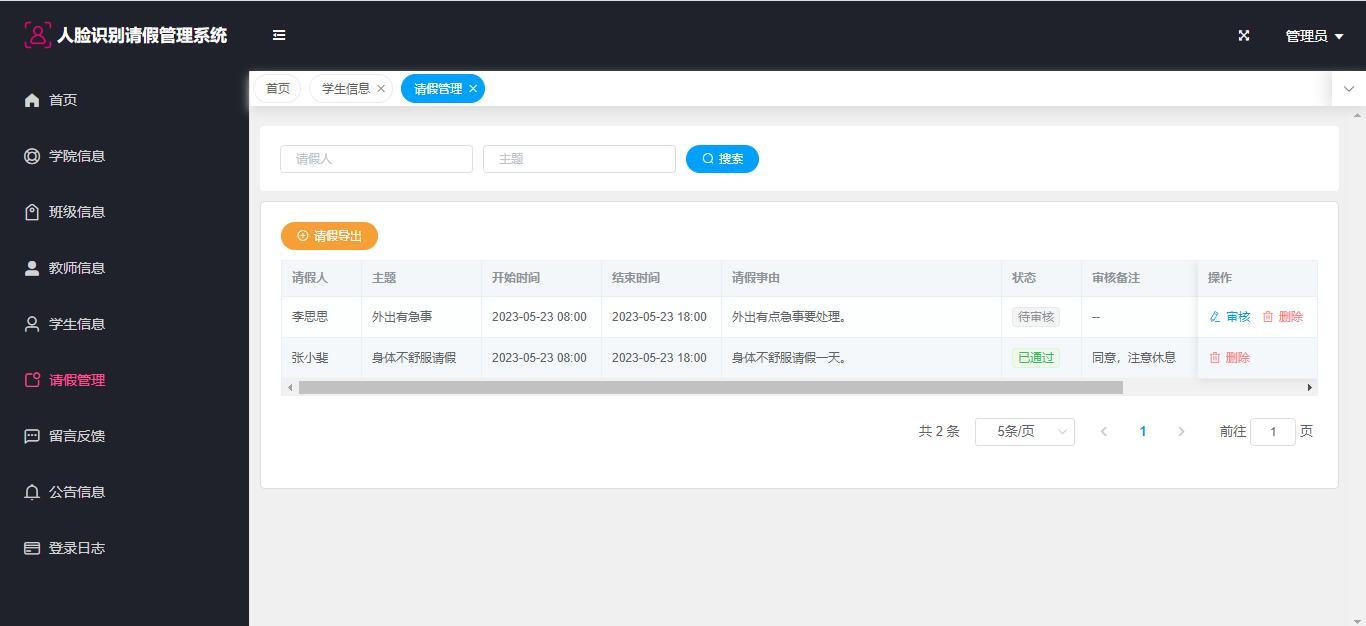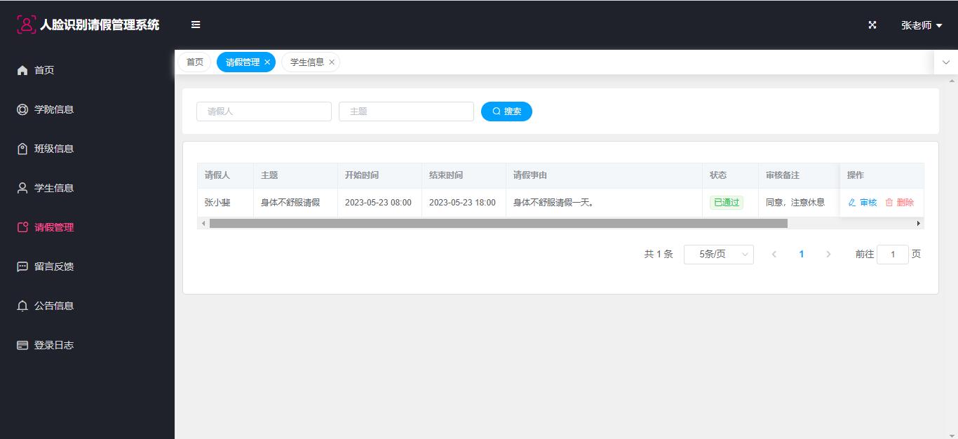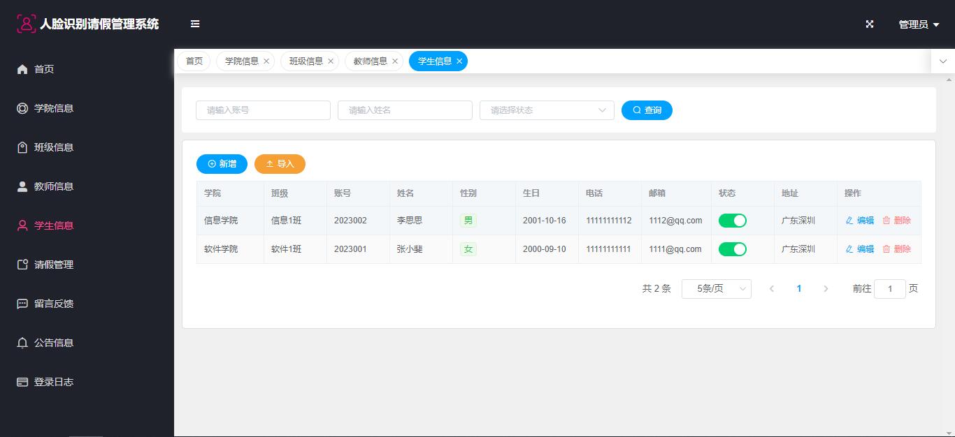 基于SpringBoot+Vue前后端分离的人脸识别请假管理系统,系统包含管理员、教师、学生角色,功能如下: