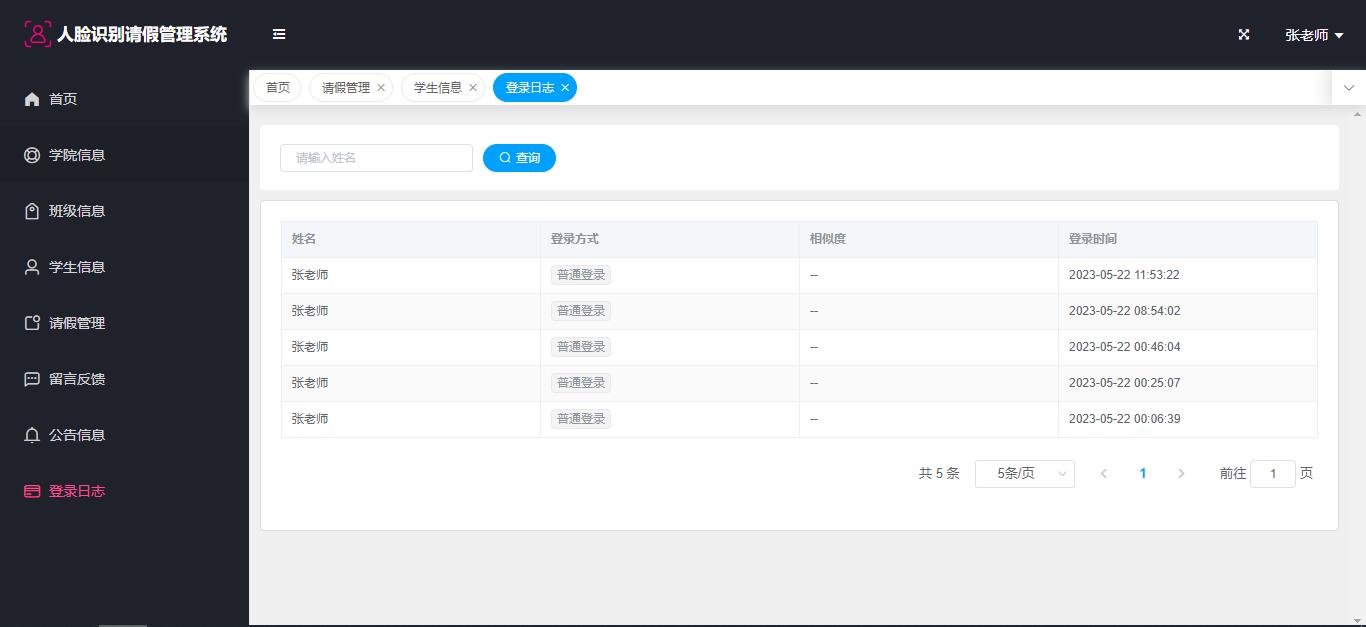 教师:学院信息;班级信息;学生信息;请假管理(审核);留言反馈;公告信息;登录日志;个人信息、密码修改;