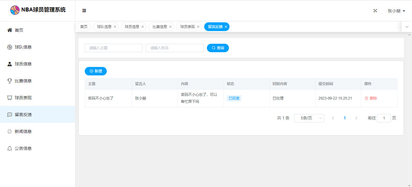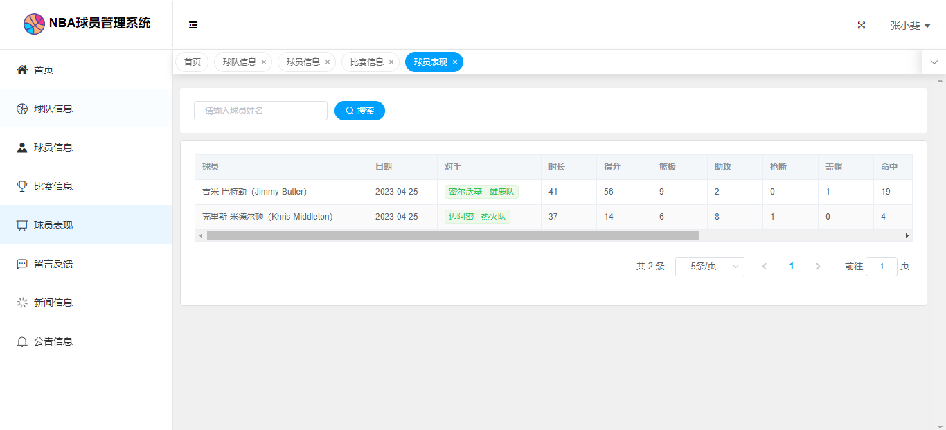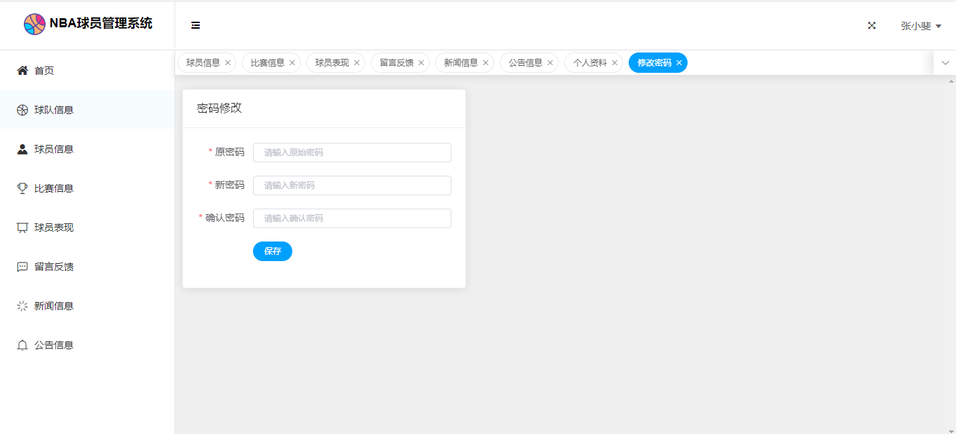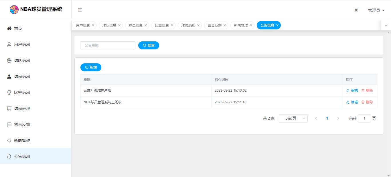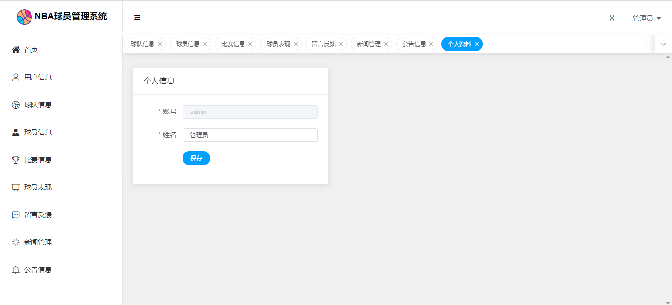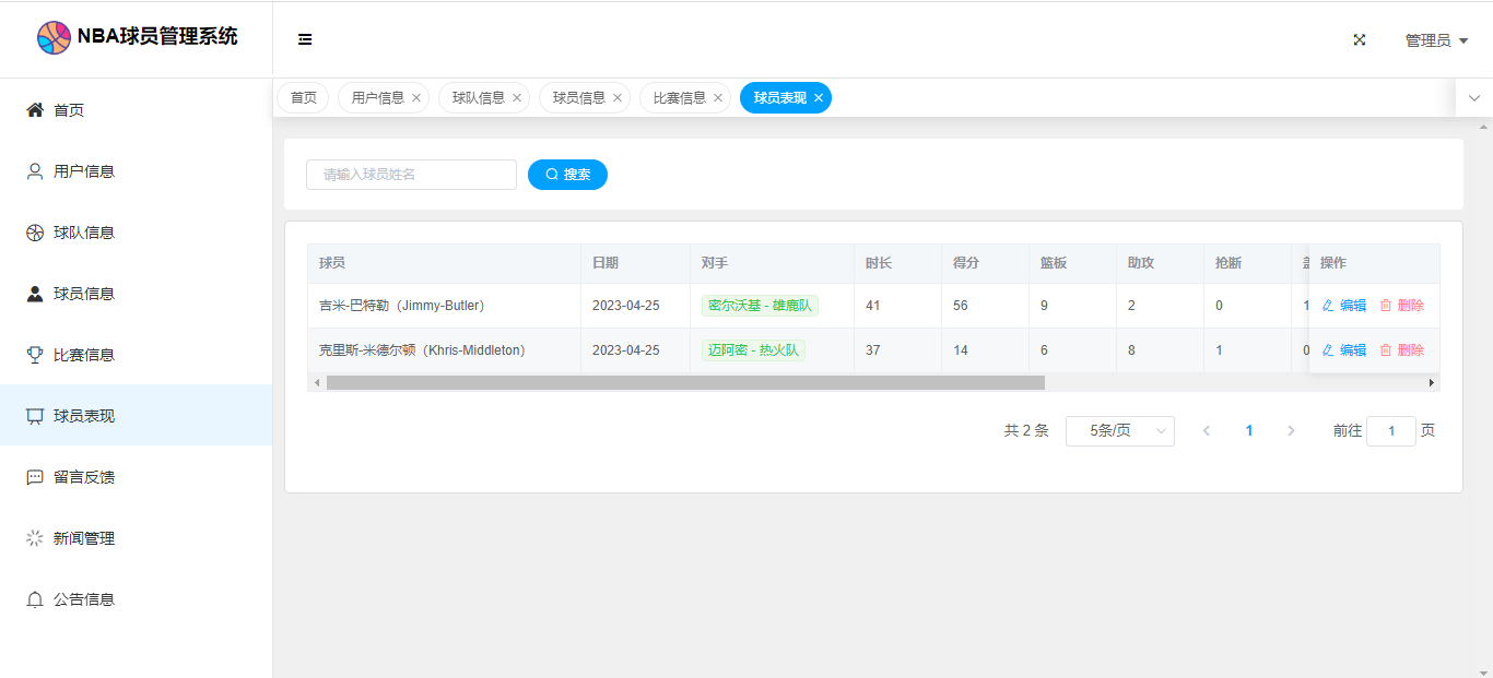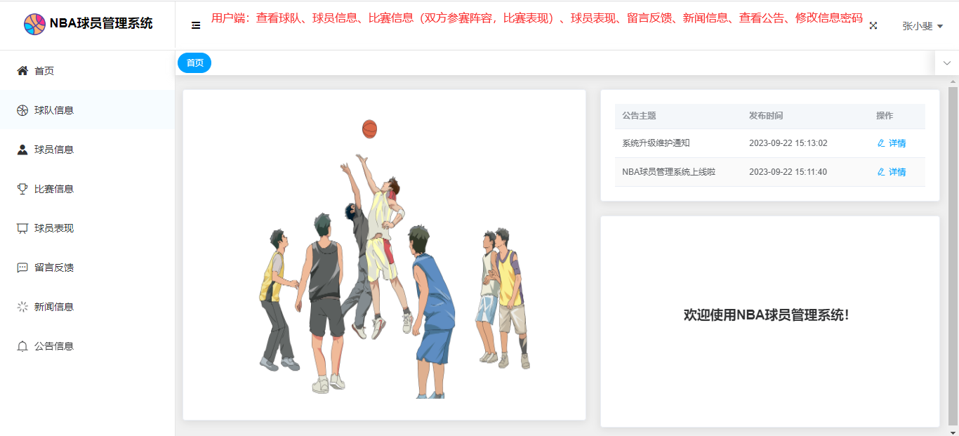 管理员:首页;用户管理;球队管理;球员管理;比赛管理(双方参赛阵容、球员表现录入);球员表现管理;留言反馈(回复);新闻管理;公告管理;个人信息;密码修改;