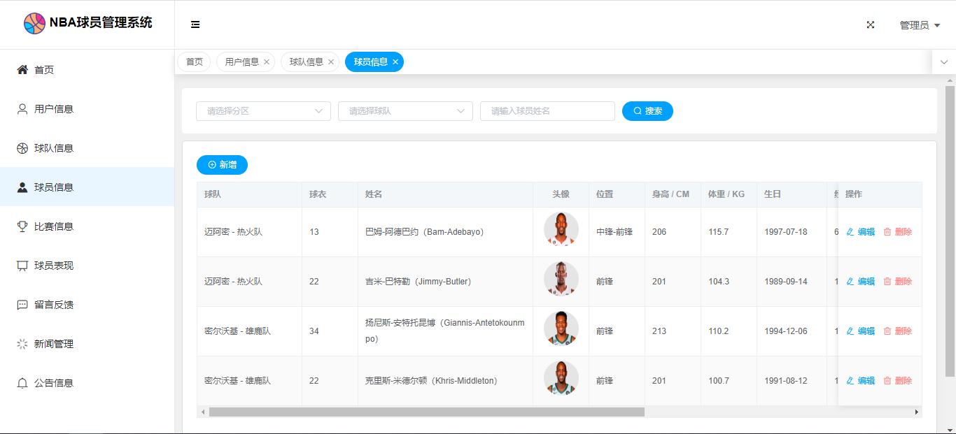 基于SpringBoot+Vue前后端分离的NBA球员管理系统,系统包含管理员、用户角色,功能如下: