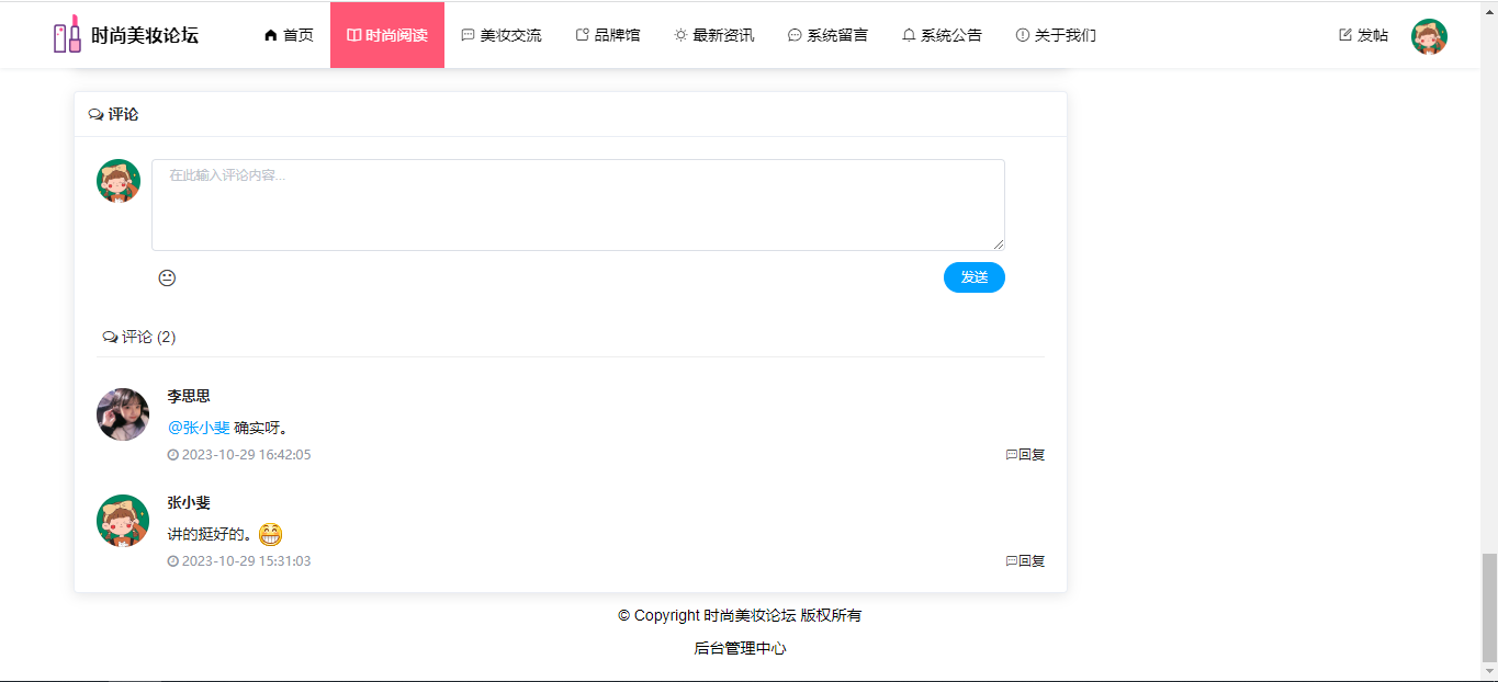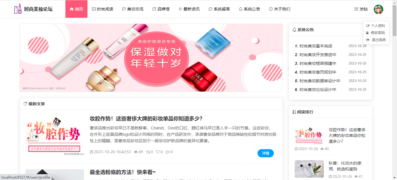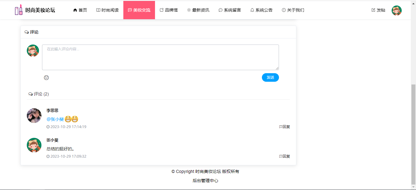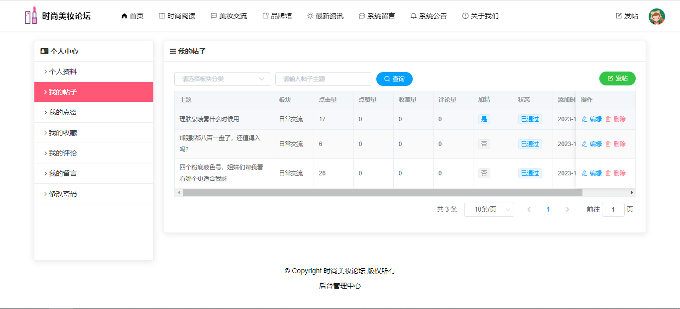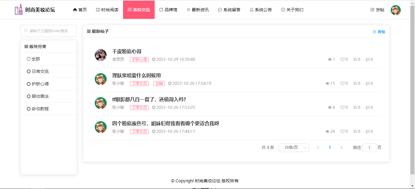 基于SpringBoot+Vue前后端分离的时尚美妆论坛社区系统,本人原创开发。