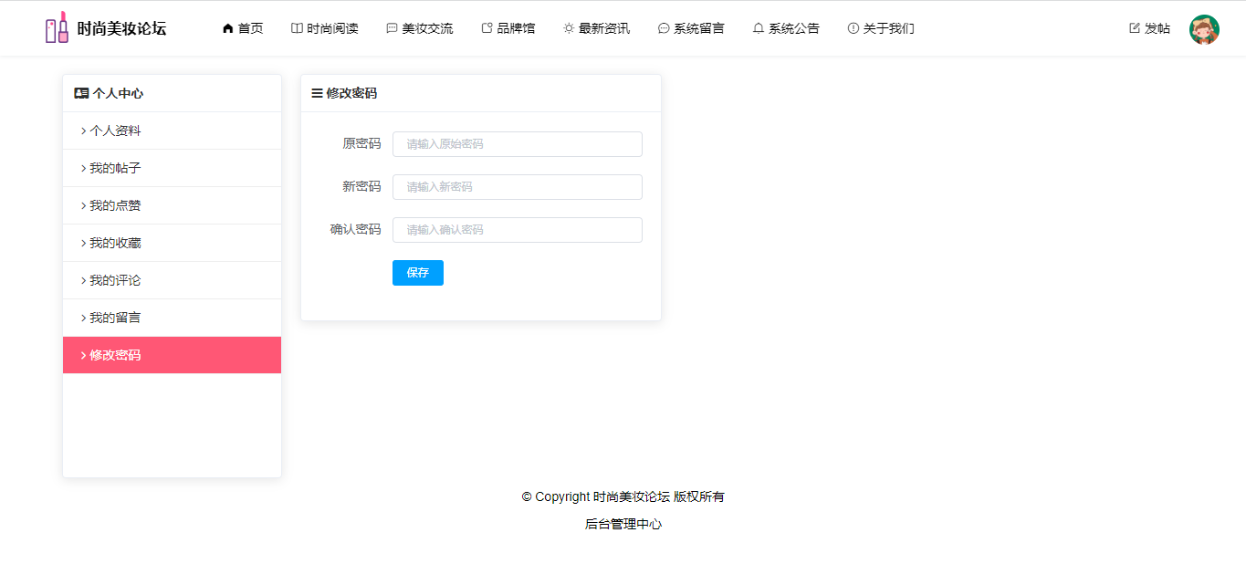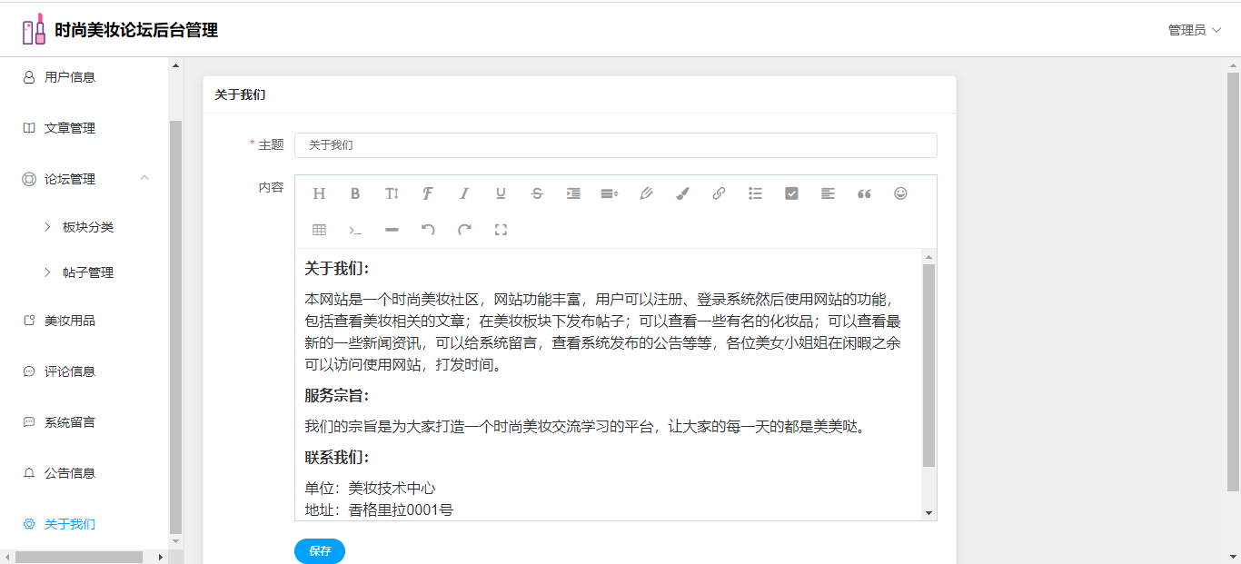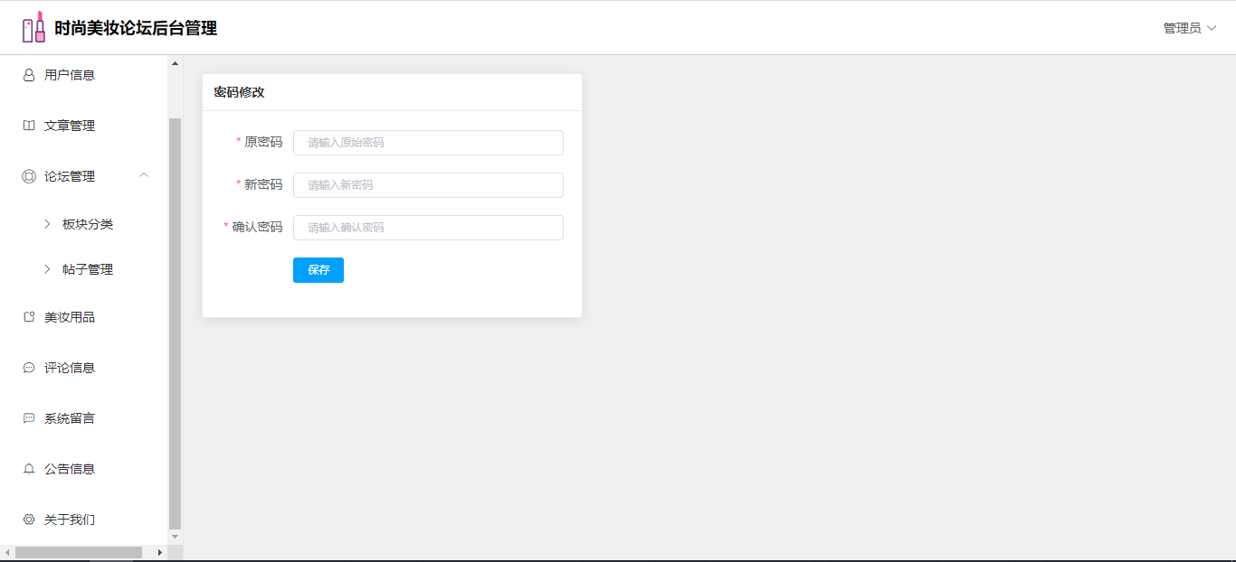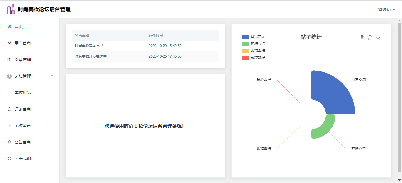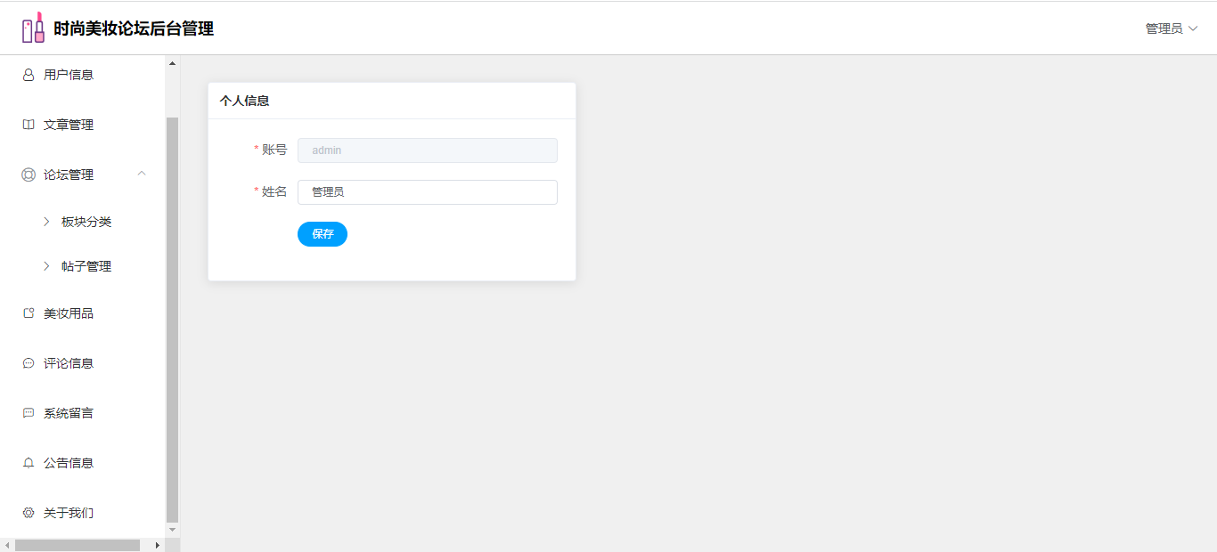 管理员:首页(数据统计);用户信息管理;文章管理(文章、新闻);论坛管理(板块分类、帖子管理);美妆用品管理;评论管理;系统留言(回复);公告管理;关于我们;个人信息;密码修改;