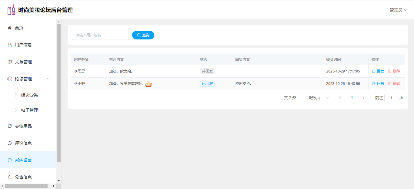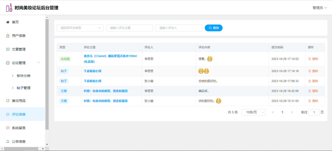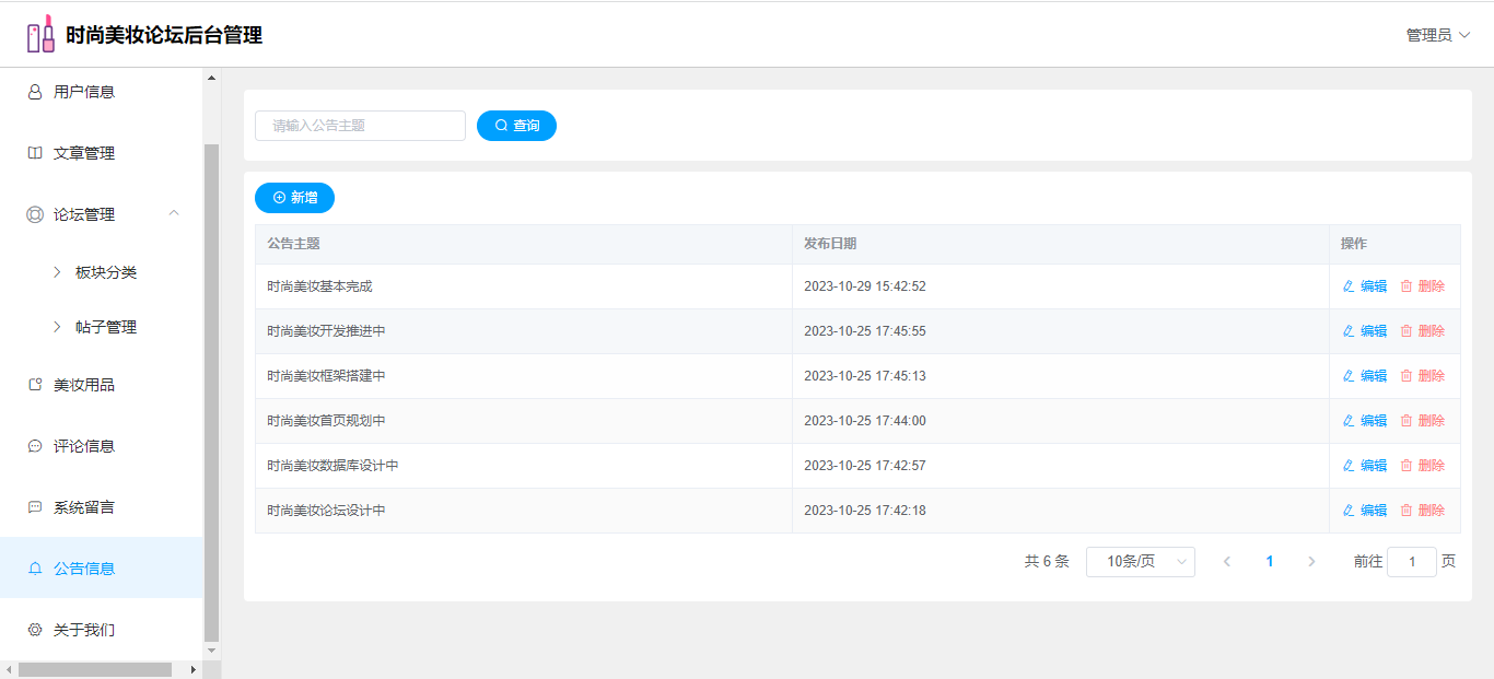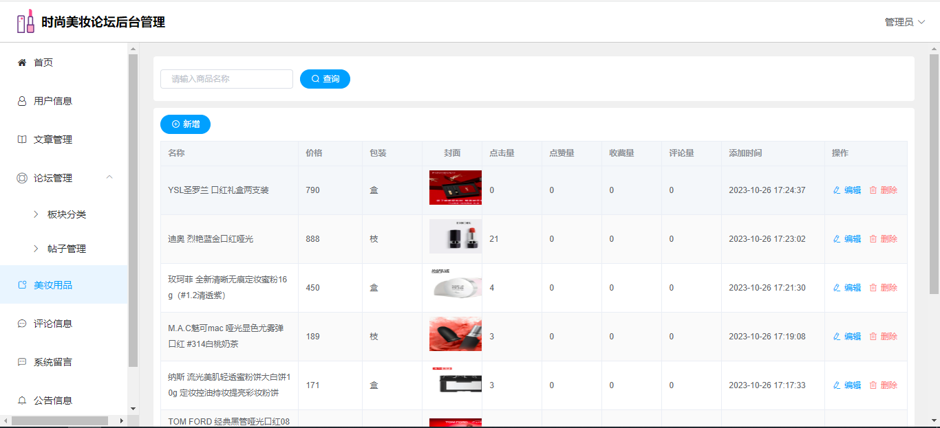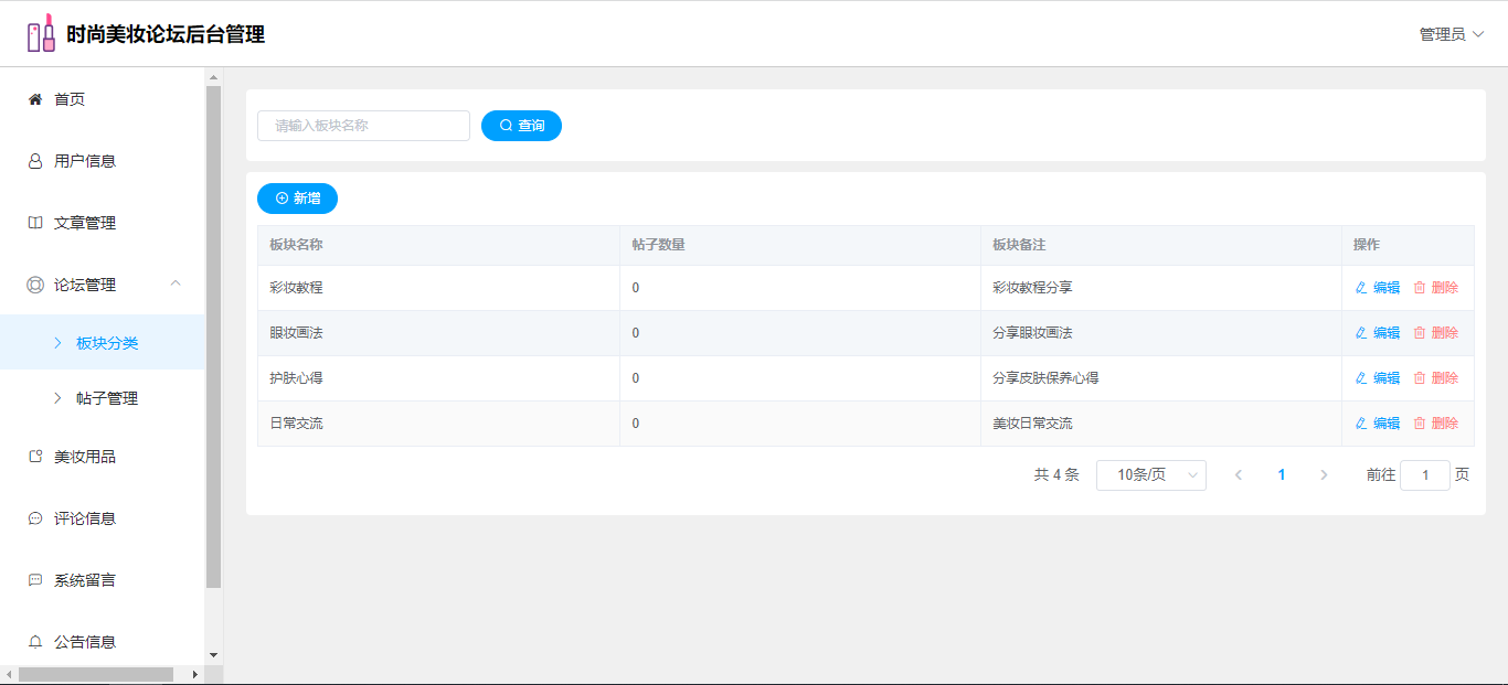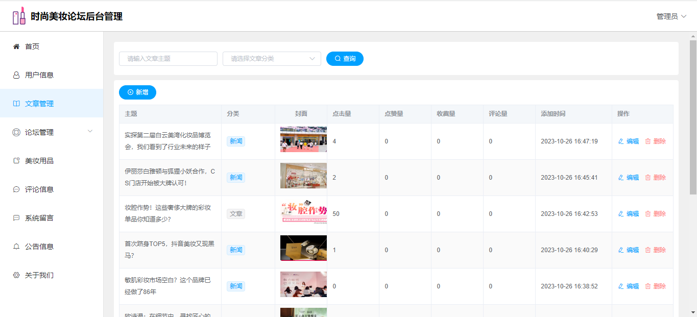 管理员:首页(数据统计);用户信息管理;文章管理(文章、新闻);论坛管理(板块分类、帖子管理);美妆用品管理;评论管理;系统留言(回复);公告管理;关于我们;个人信息;密码修改;